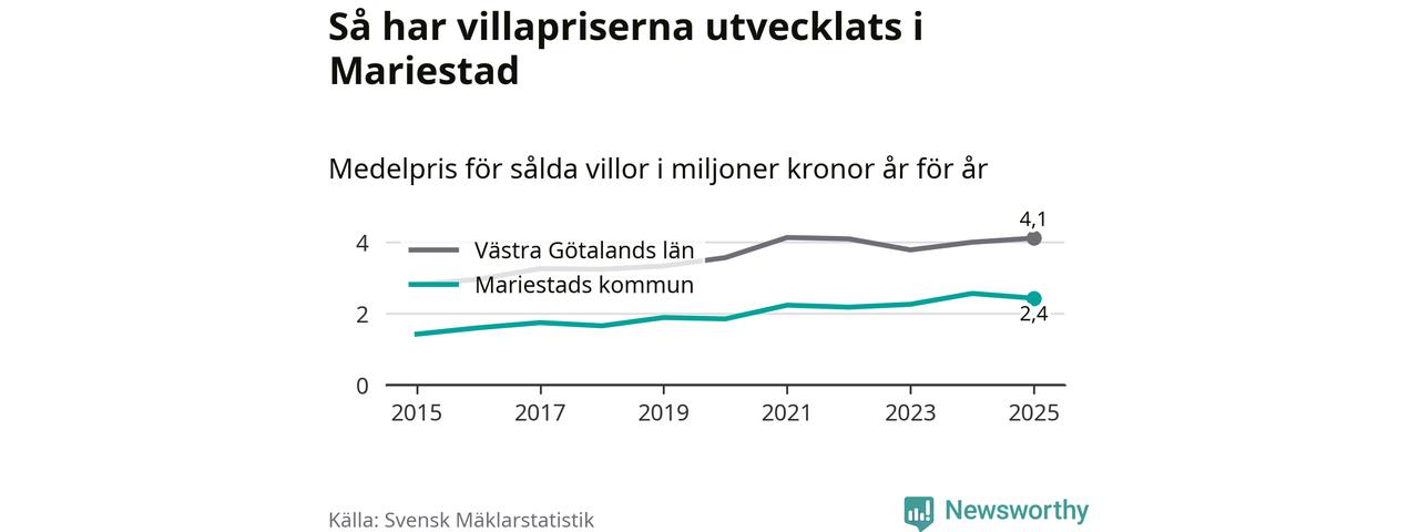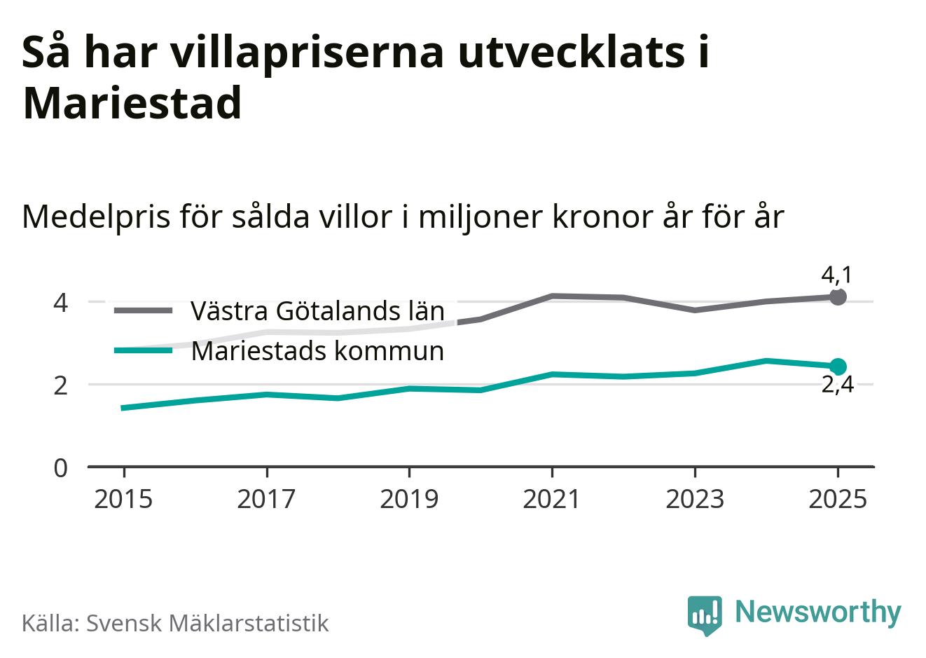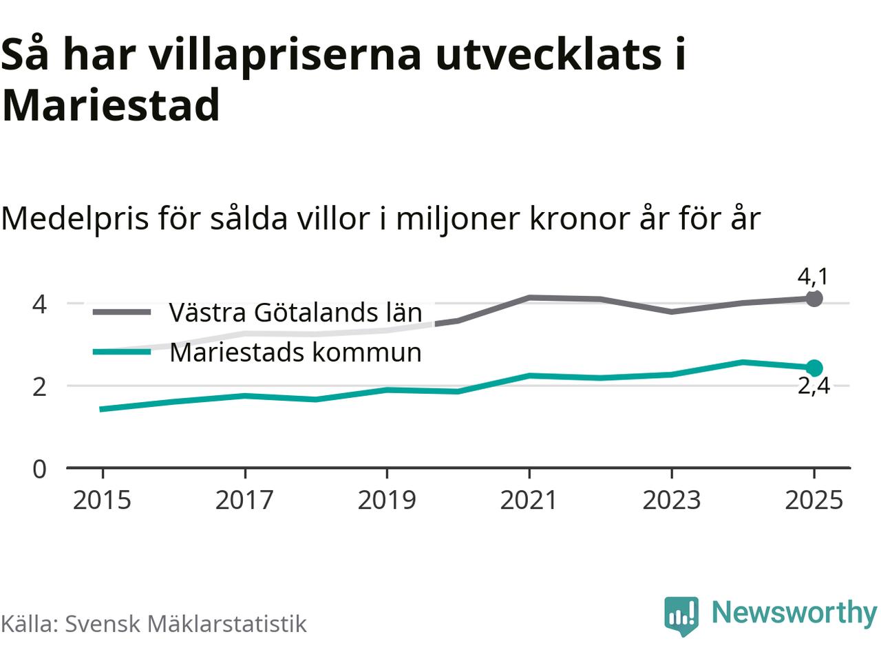 2,4 miljoner kronor är medelpriset för de villor som såldes i Mariestads kommun under året, eller 20 338 kronor per kvadratmeter. Det innebär en prisminskning med fem procent på ett år.