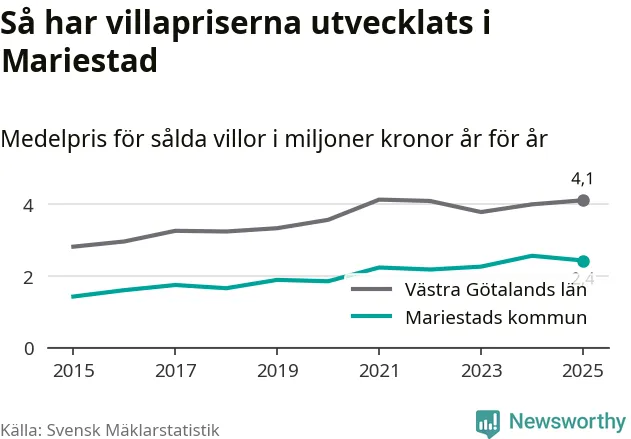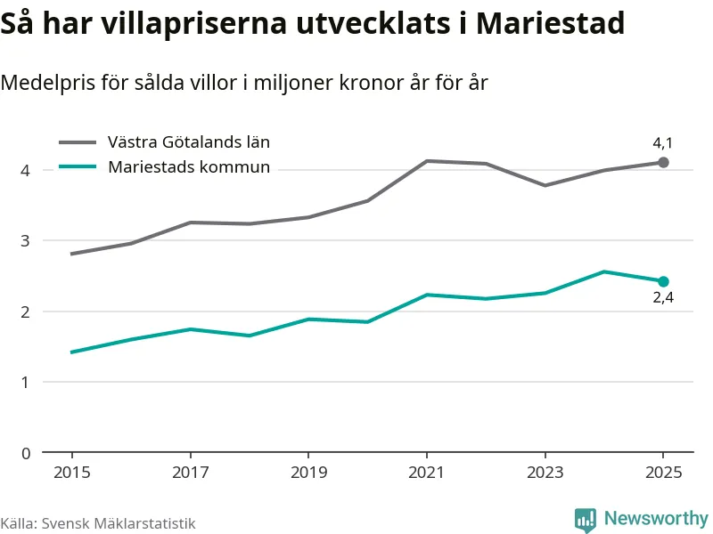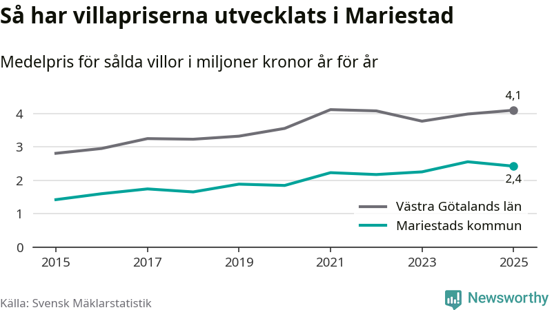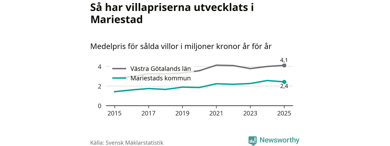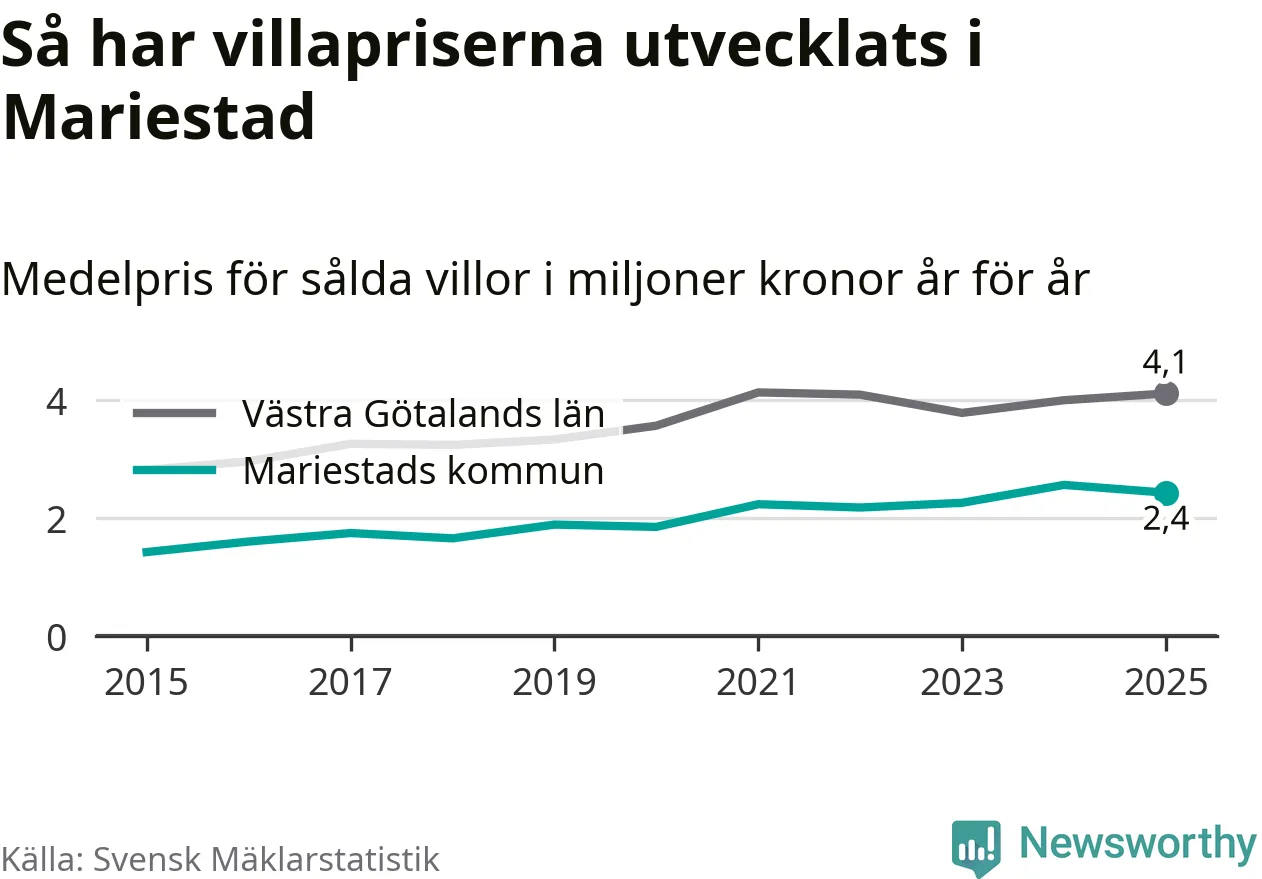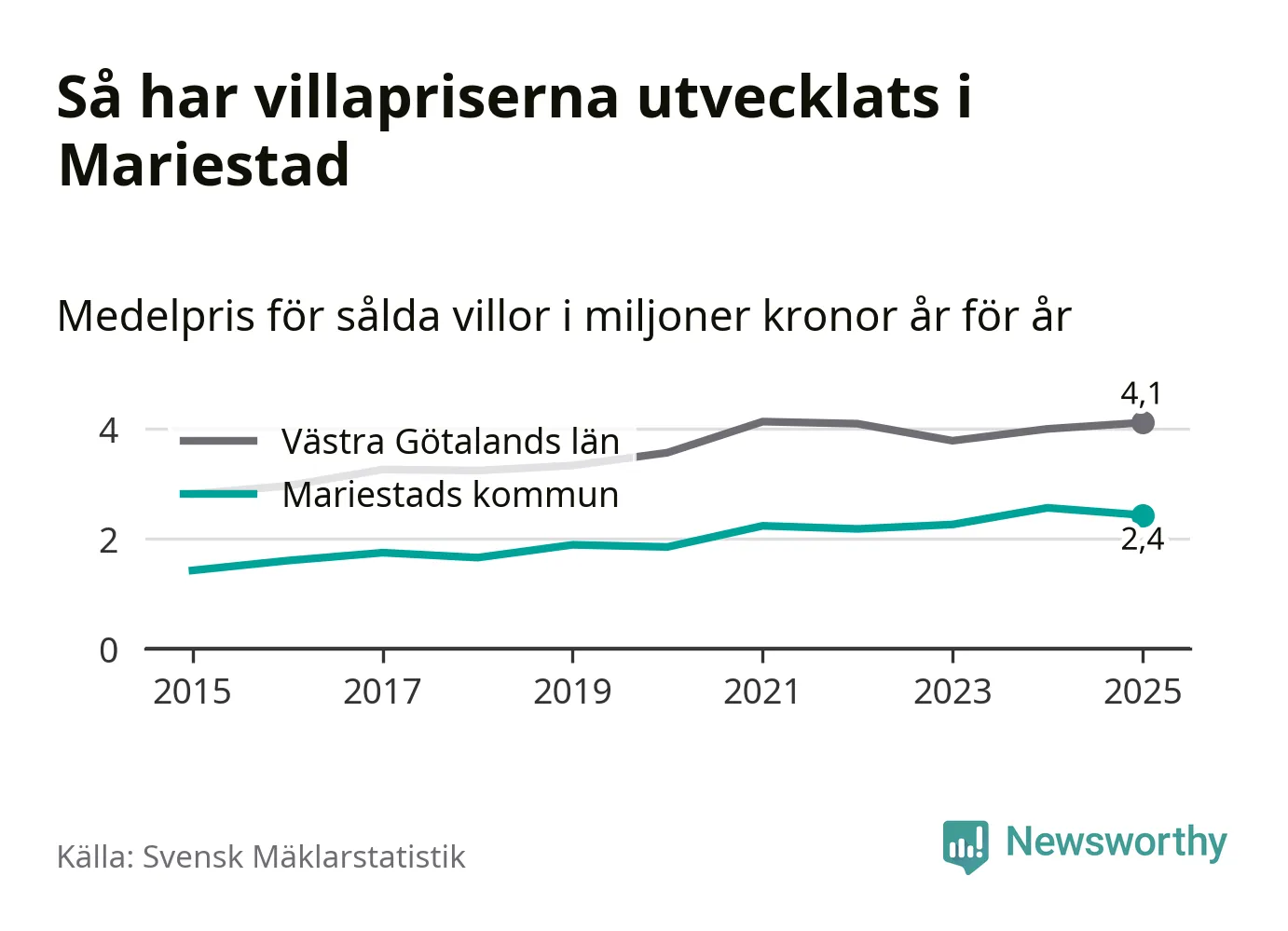 2,4 miljoner kronor är medelpriset för de villor som såldes i Mariestads kommun under året, eller 20 338 kronor per kvadratmeter. Det innebär en prisminskning med fem procent på ett år.