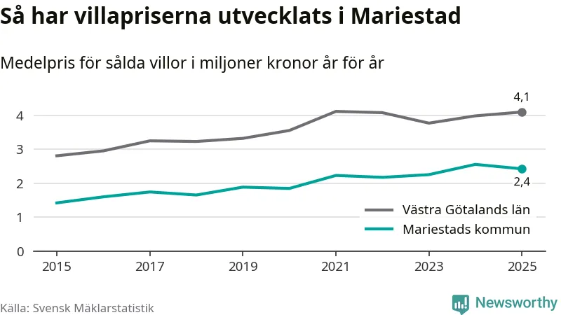 Bostadsmarknaden i Sverige närmar sig nivån före räntesmockan 2022. I Mariestad sjönk dock villapriserna.
