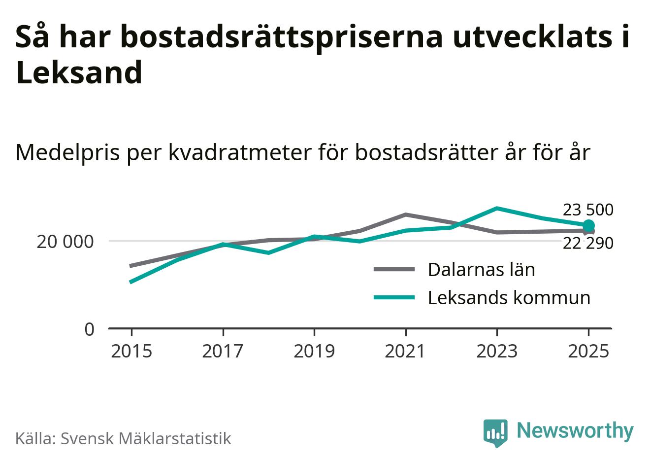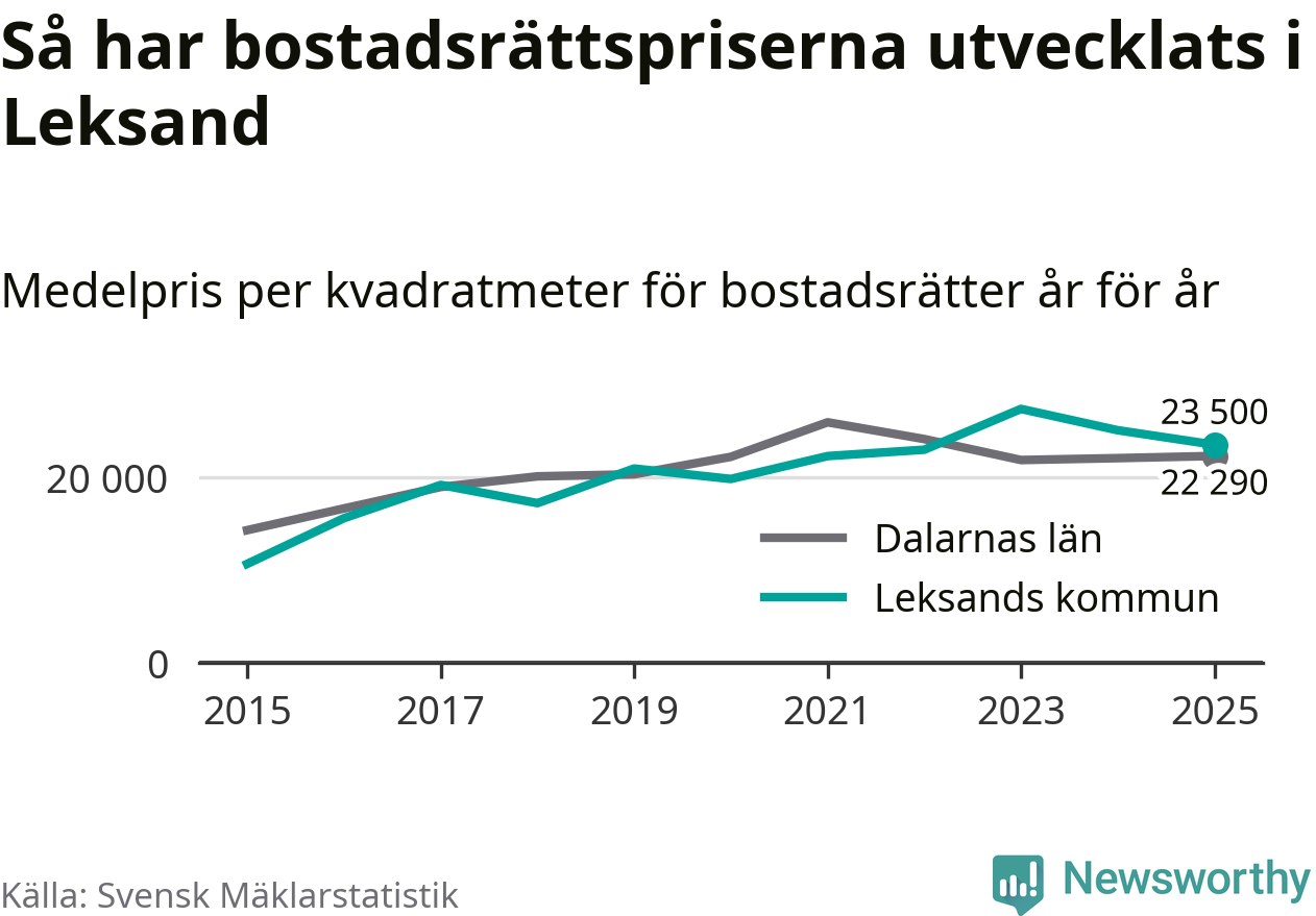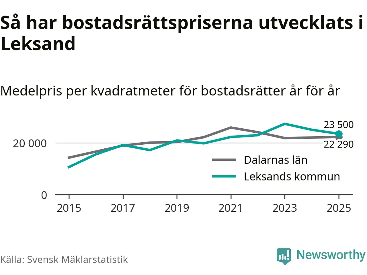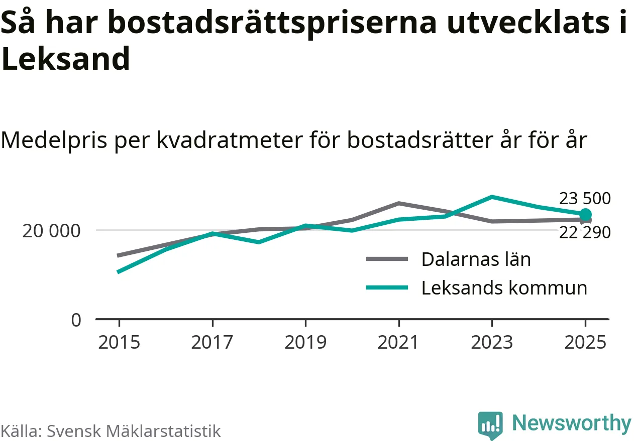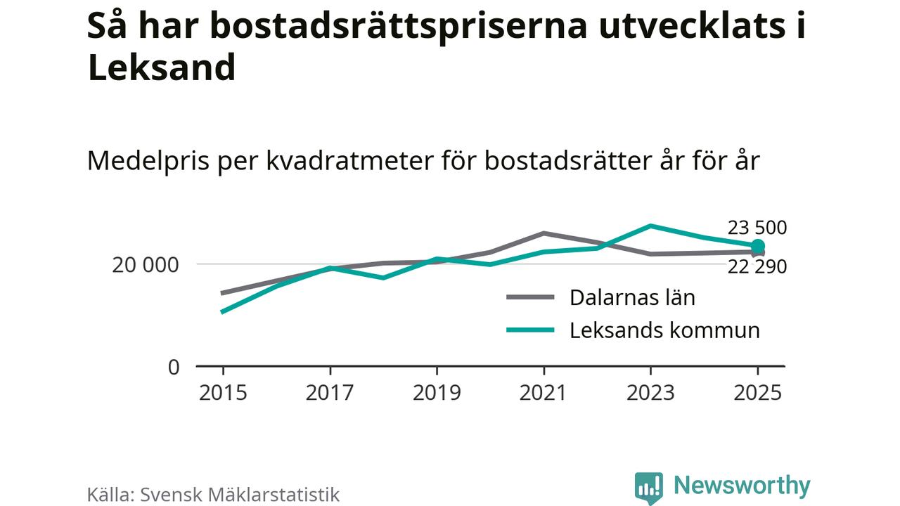 Det såldes totalt 31 bostadsrätter i Leksands kommun under året. Genomsnittspriset per kvadratmeter landade på 23 500 kronor. Det är en minskning med sex procent i kommunen på ett år.