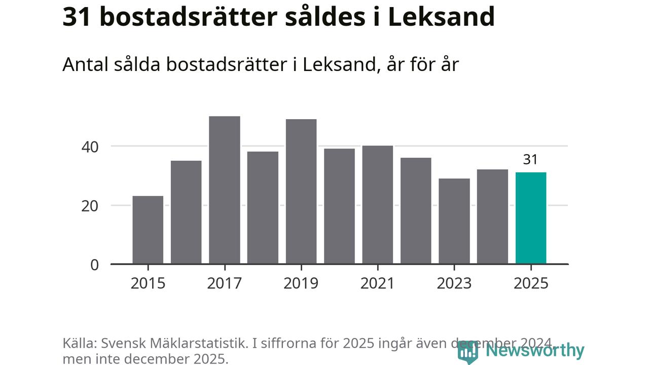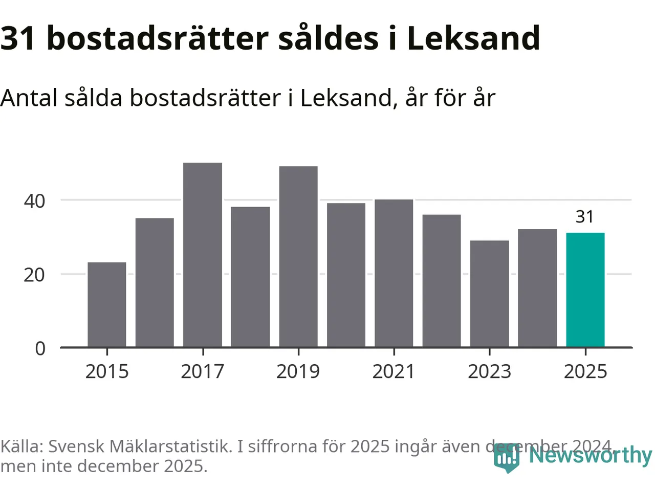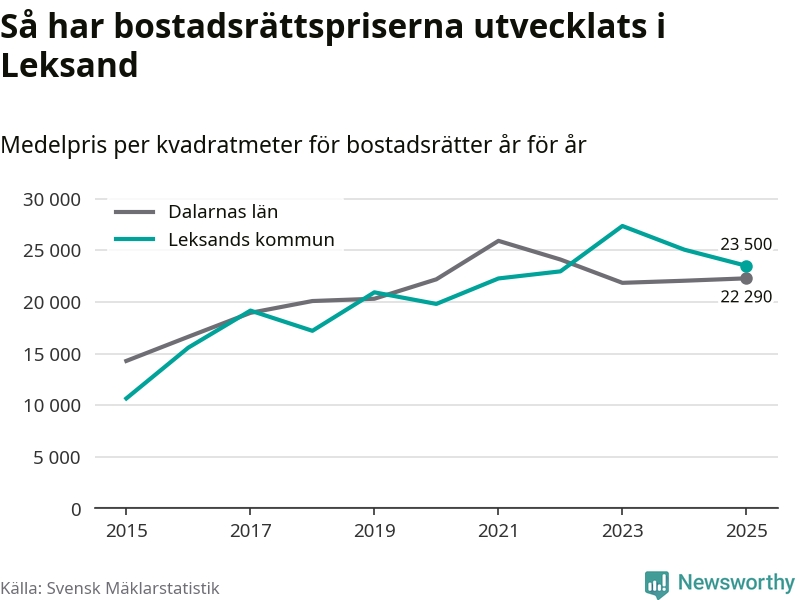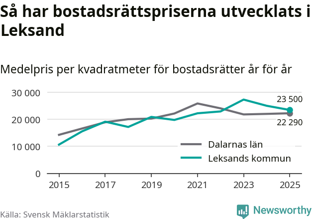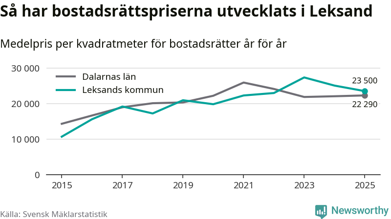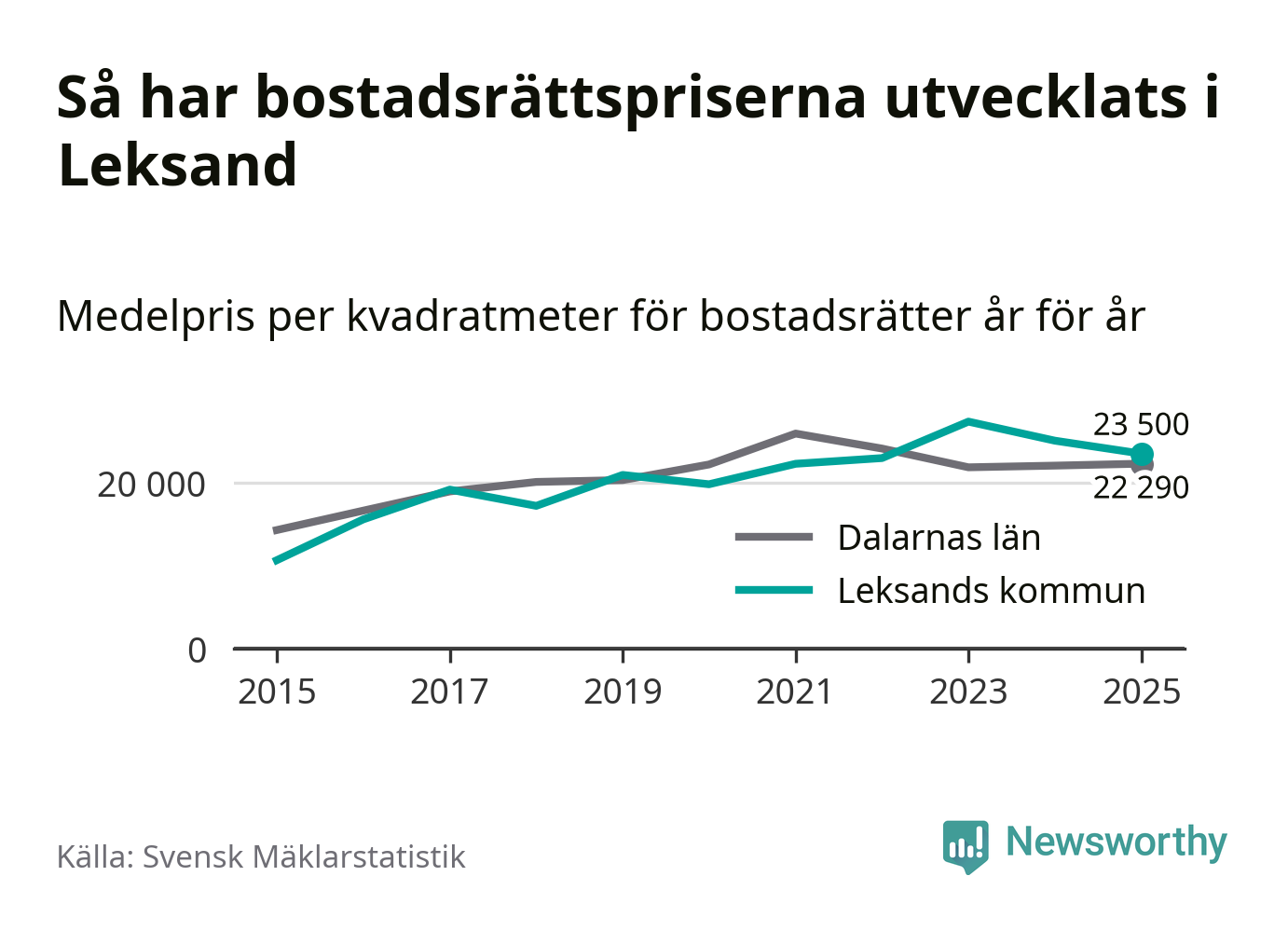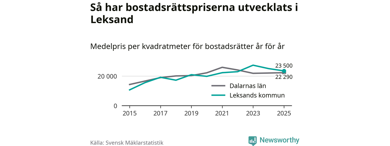 Det såldes totalt 31 bostadsrätter i Leksands kommun under året. Genomsnittspriset per kvadratmeter landade på 23 500 kronor. Det är en minskning med sex procent i kommunen på ett år.