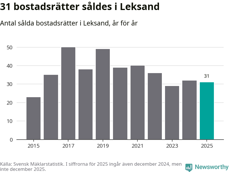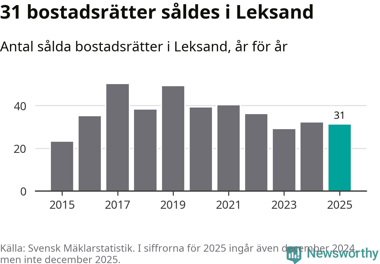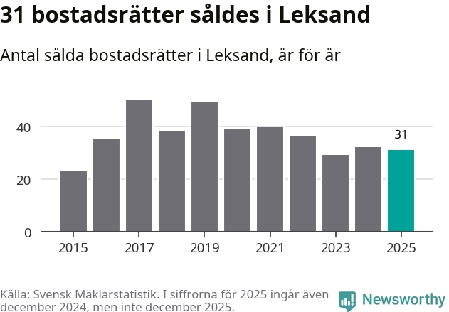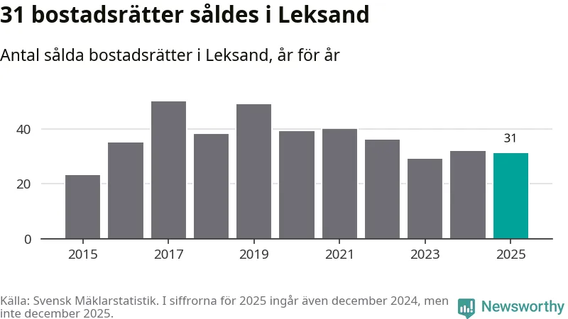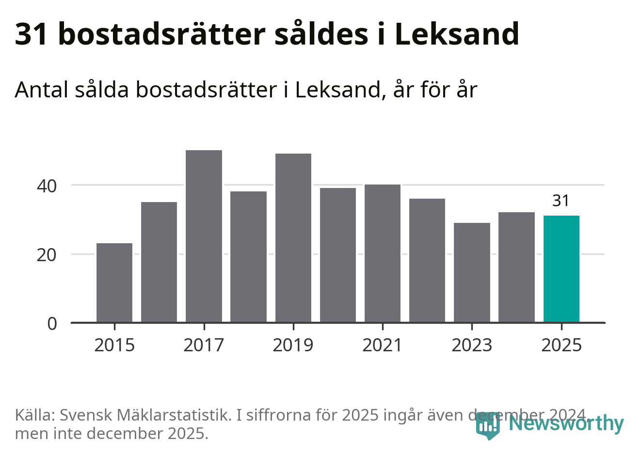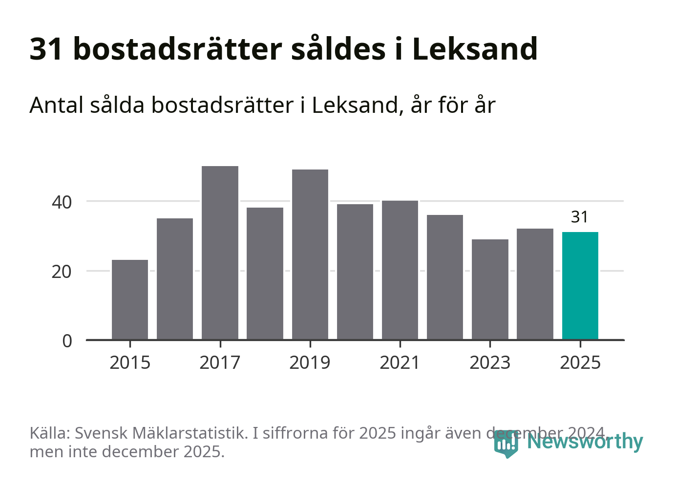 Det såldes totalt 31 bostadsrätter i Leksands kommun under året. Genomsnittspriset per kvadratmeter landade på 23 500 kronor. Det är en minskning med sex procent i kommunen på ett år.