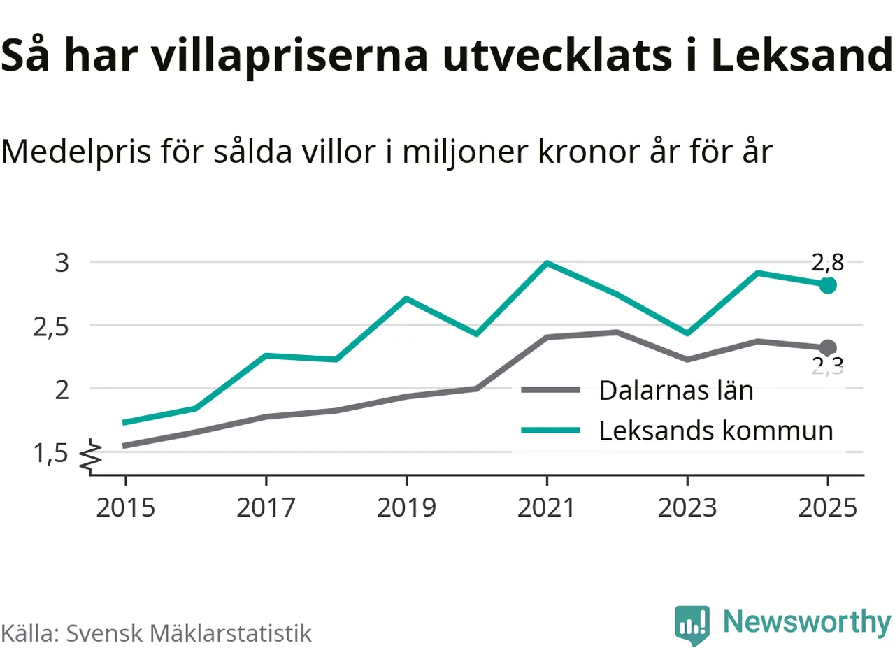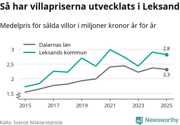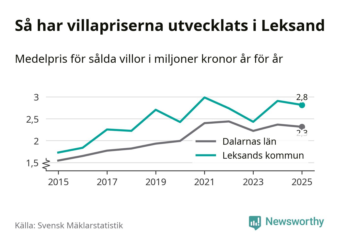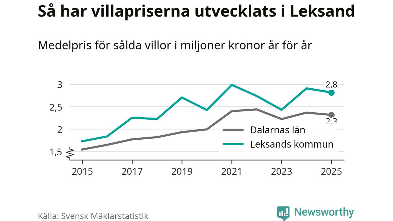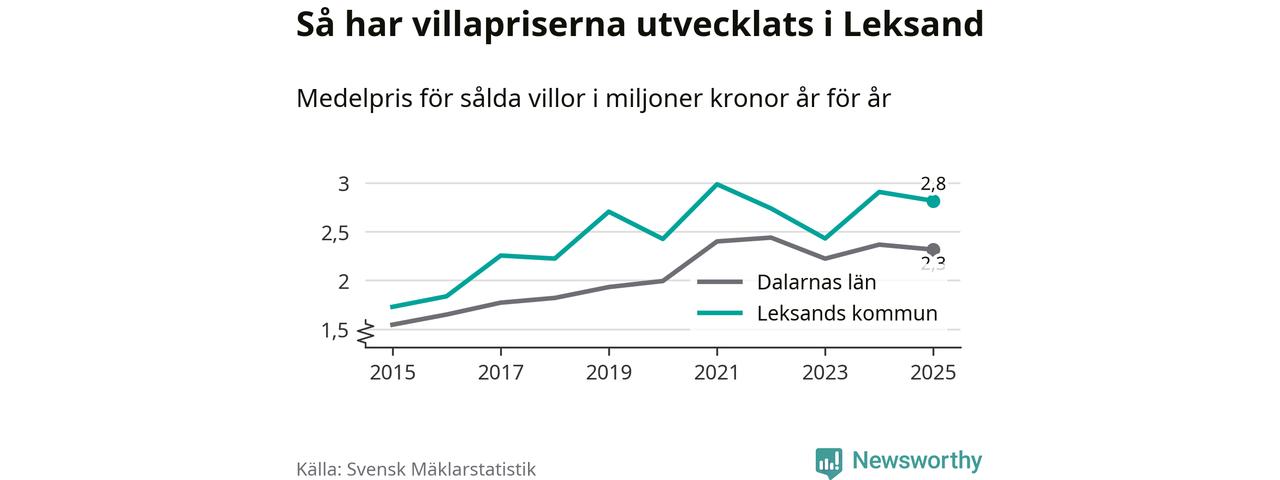 2,8 miljoner kronor är medelpriset för de villor som såldes i Leksands kommun under året, eller 26 152 kronor per kvadratmeter. Det innebär en prisminskning med tre procent på ett år.