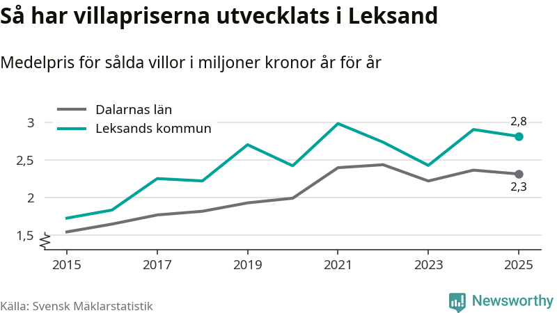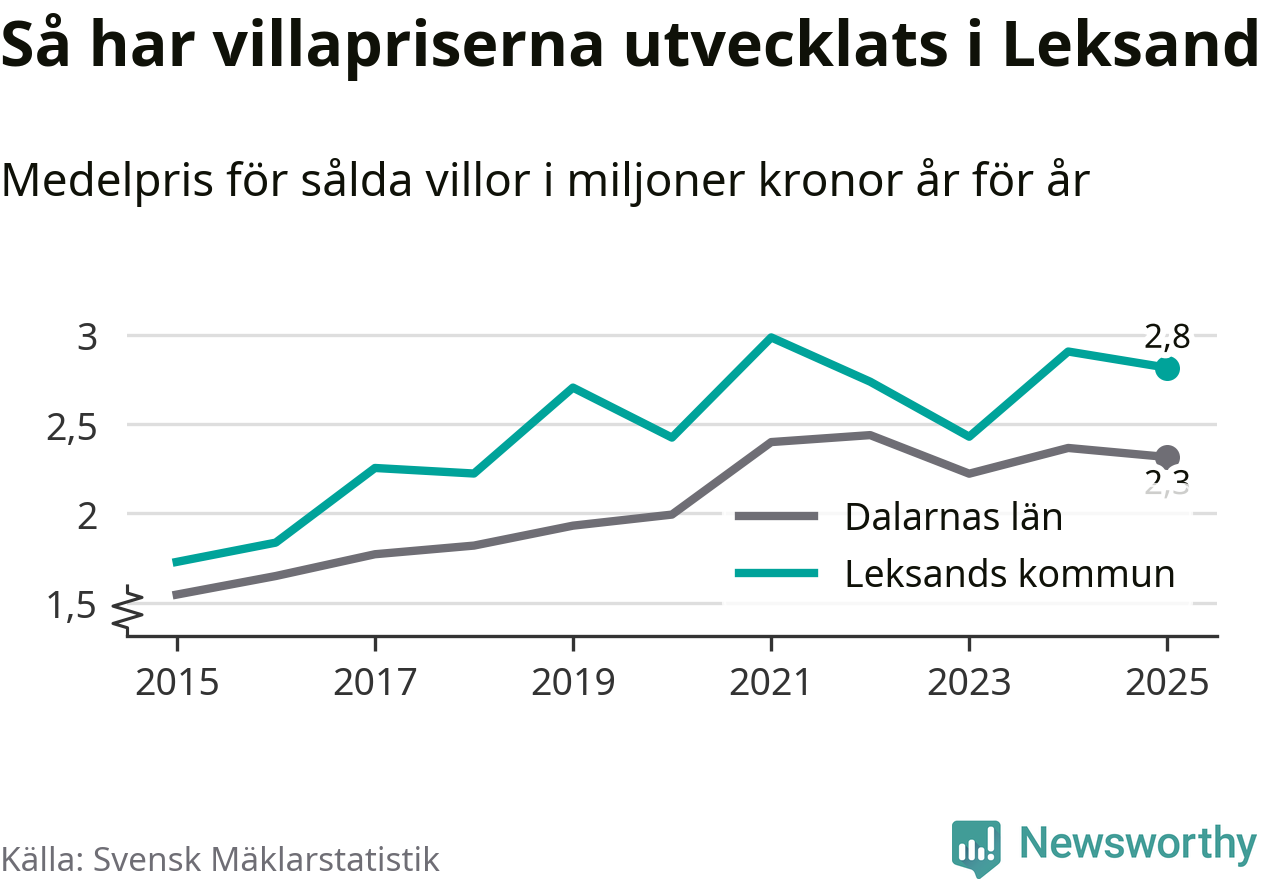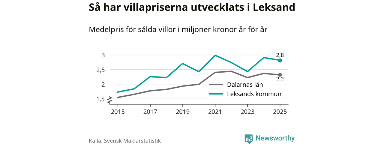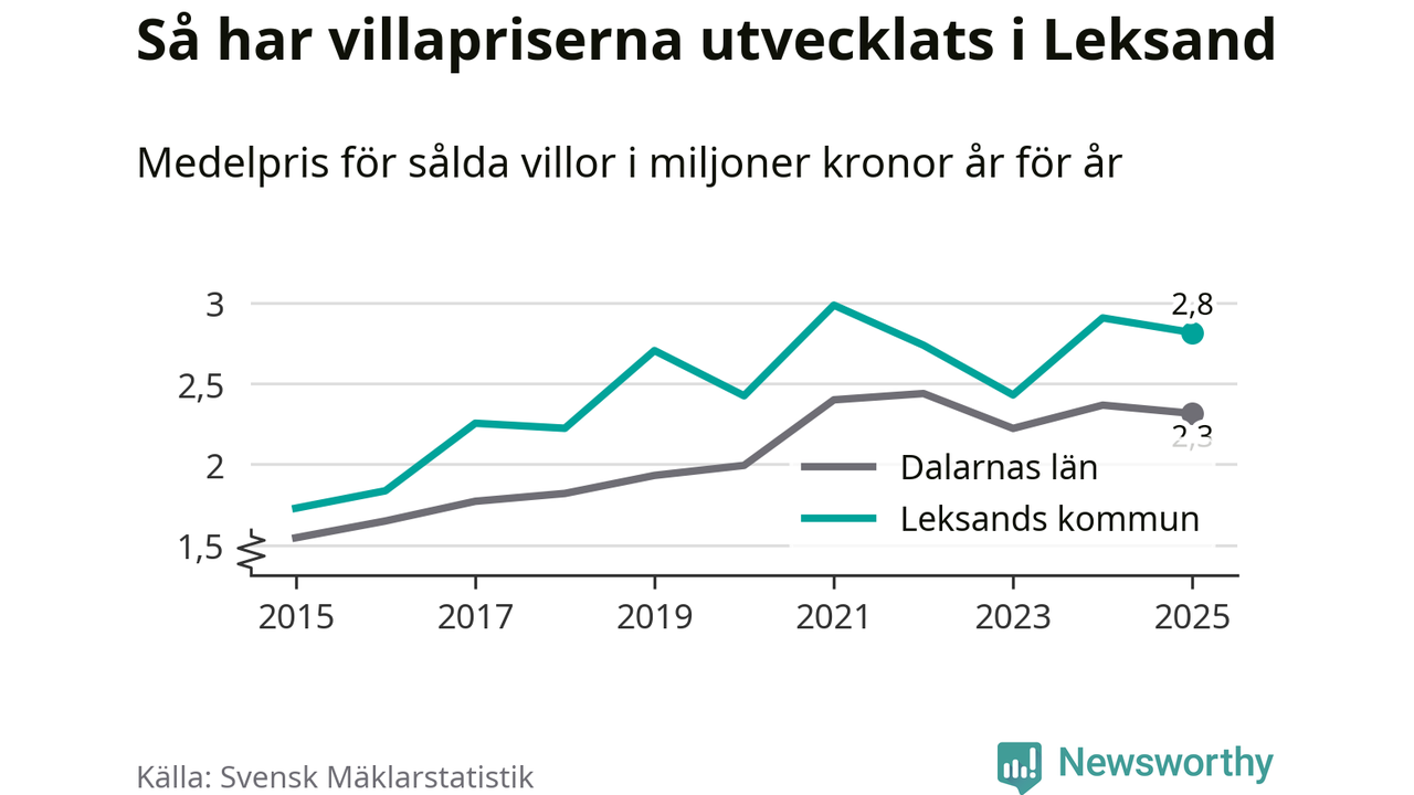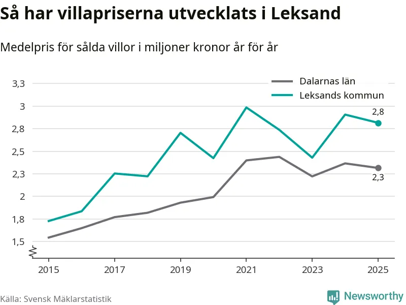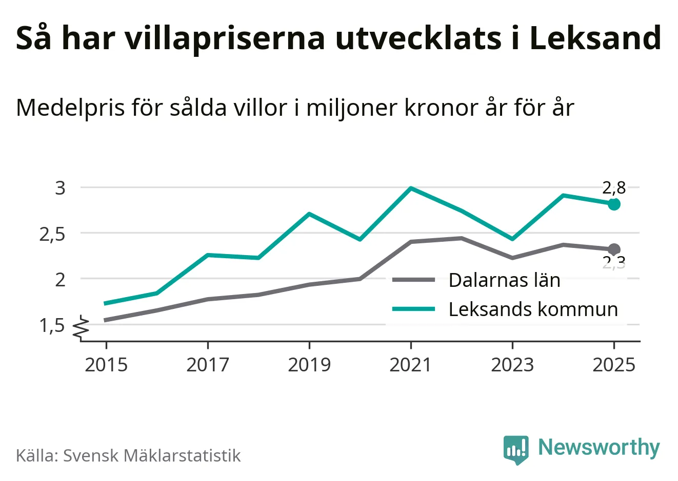 2,8 miljoner kronor är medelpriset för de villor som såldes i Leksands kommun under året, eller 26 152 kronor per kvadratmeter. Det innebär en prisminskning med tre procent på ett år.