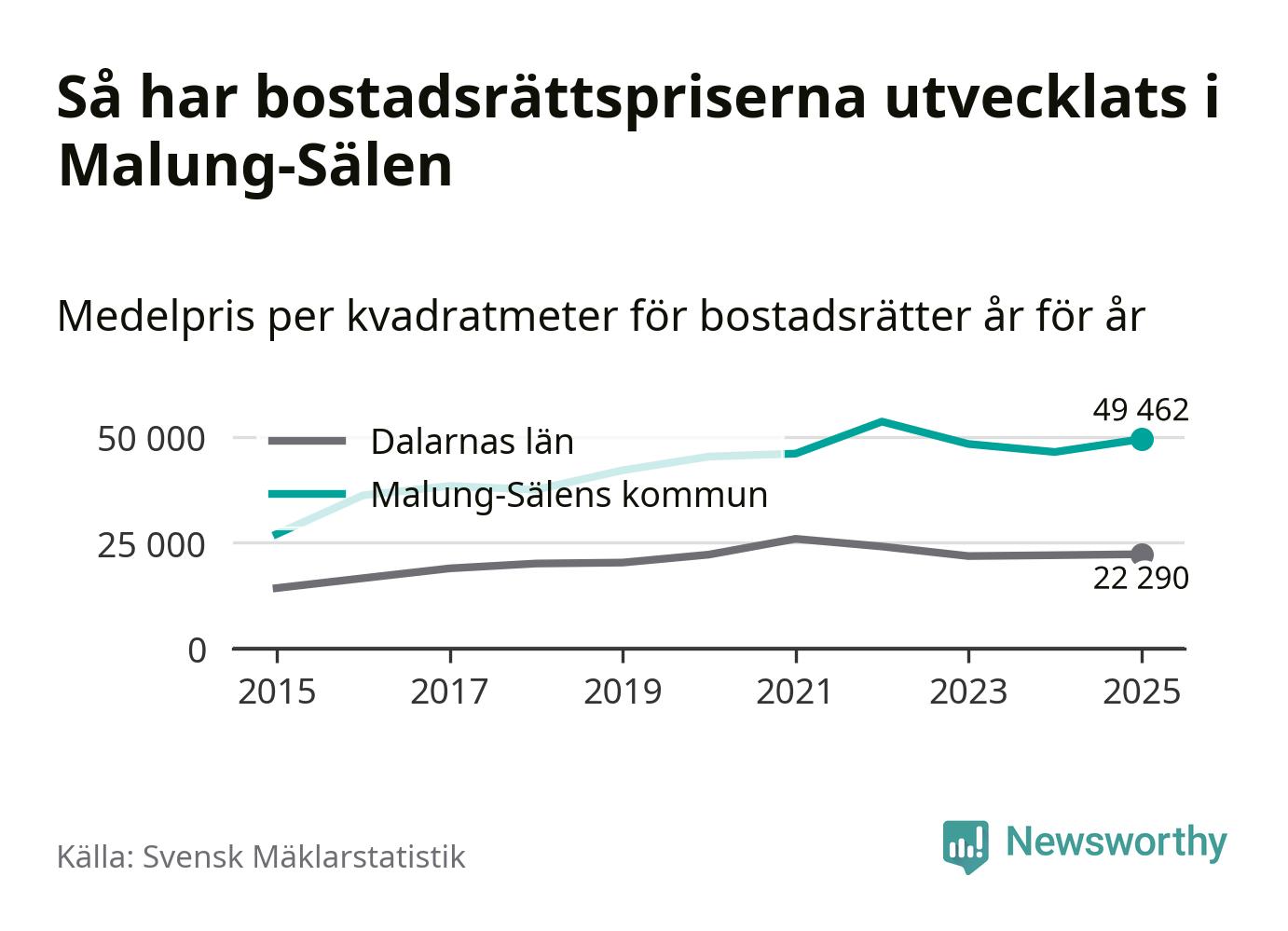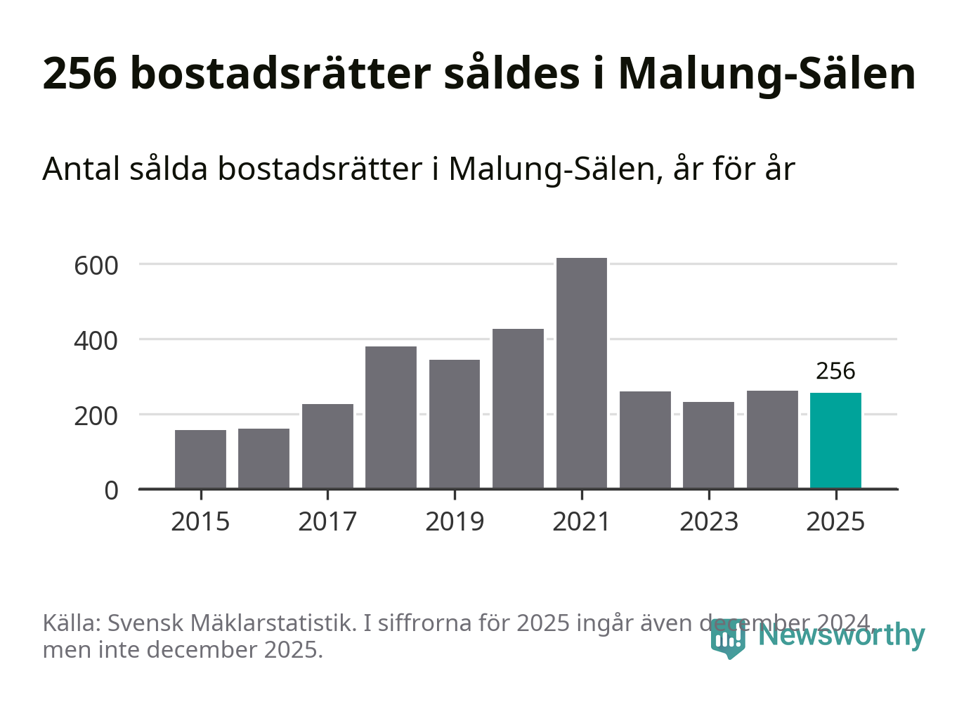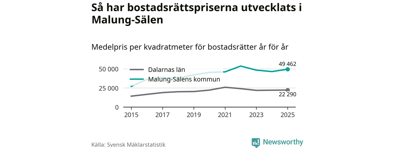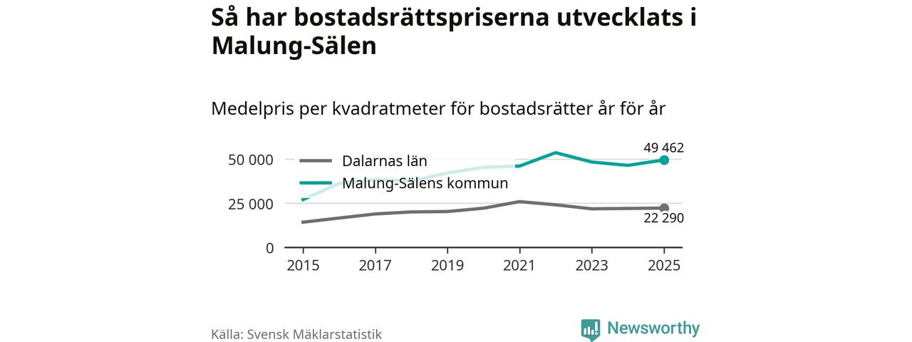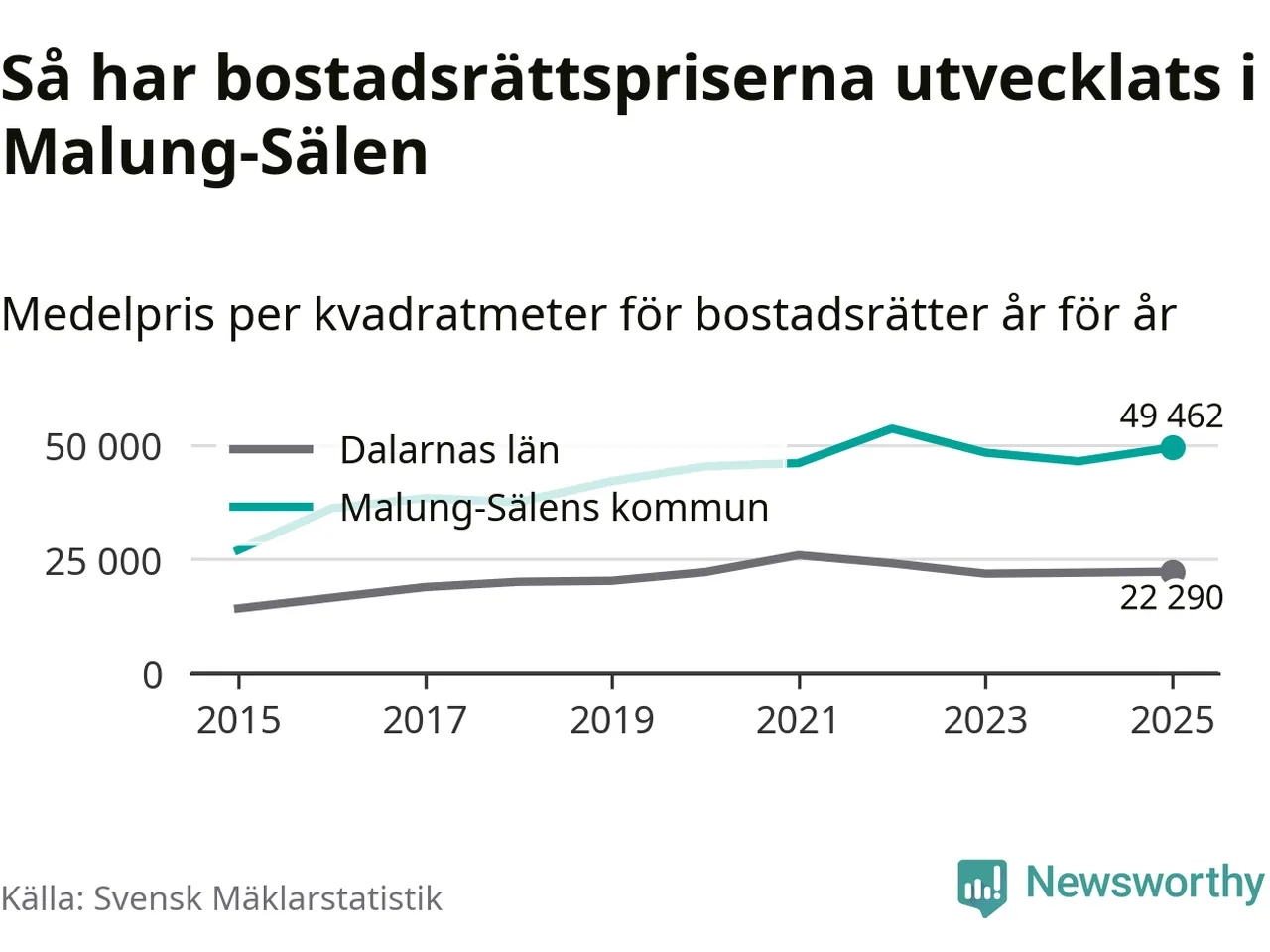 Det såldes totalt 256 bostadsrätter i Malung-Sälens kommun under året. Genomsnittspriset per kvadratmeter landade på 49 462 kronor. Det är en ökning med sju procent i kommunen på ett år.