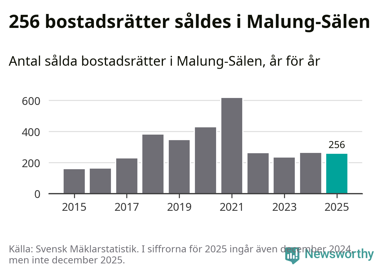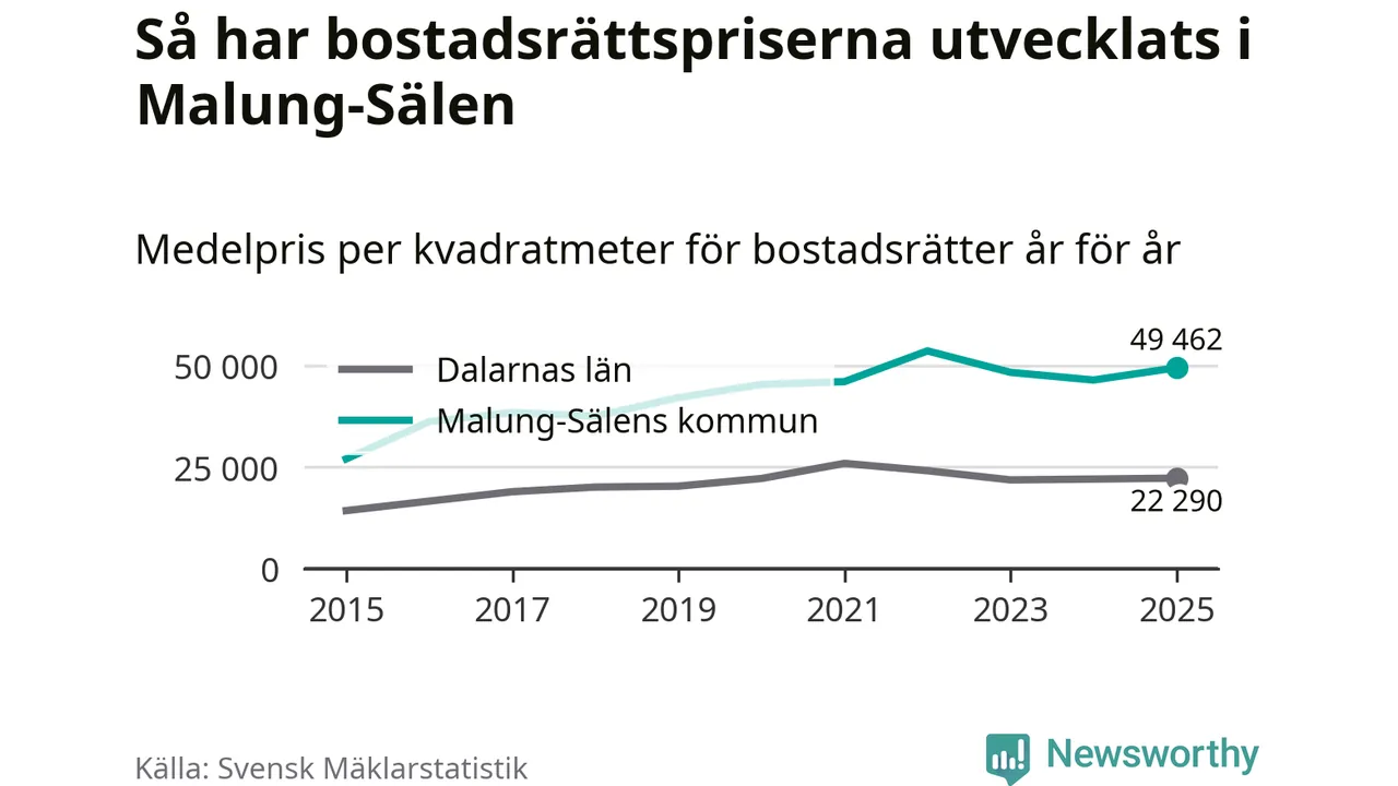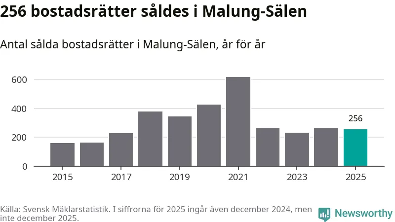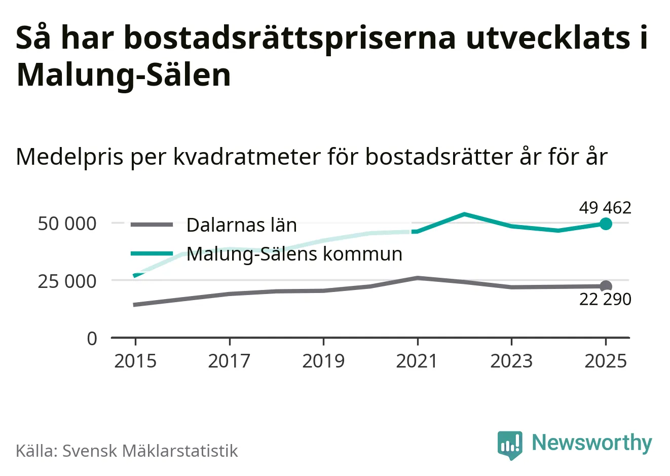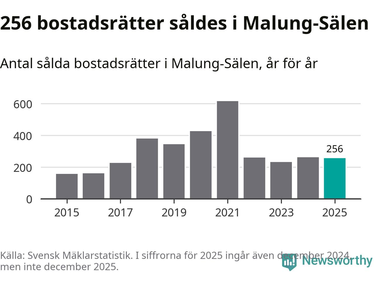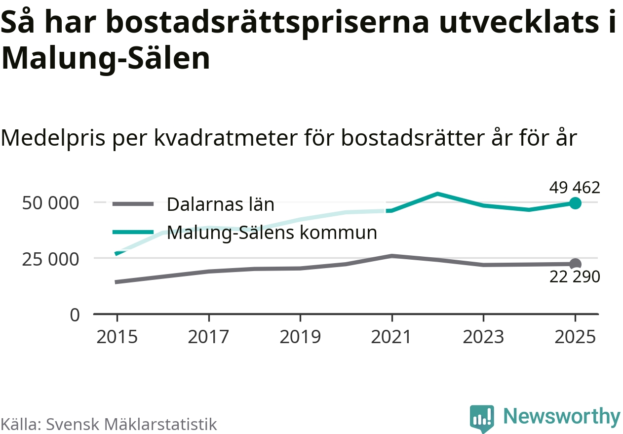 Det såldes totalt 256 bostadsrätter i Malung-Sälens kommun under året. Genomsnittspriset per kvadratmeter landade på 49 462 kronor. Det är en ökning med sju procent i kommunen på ett år.