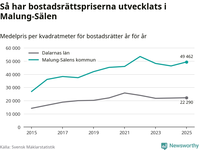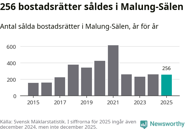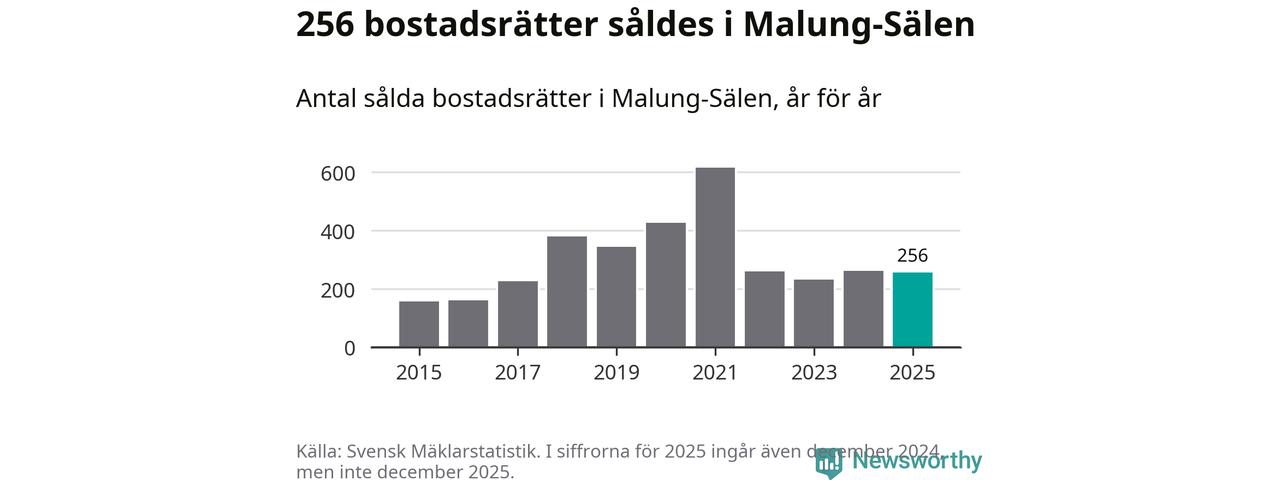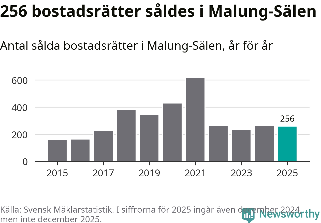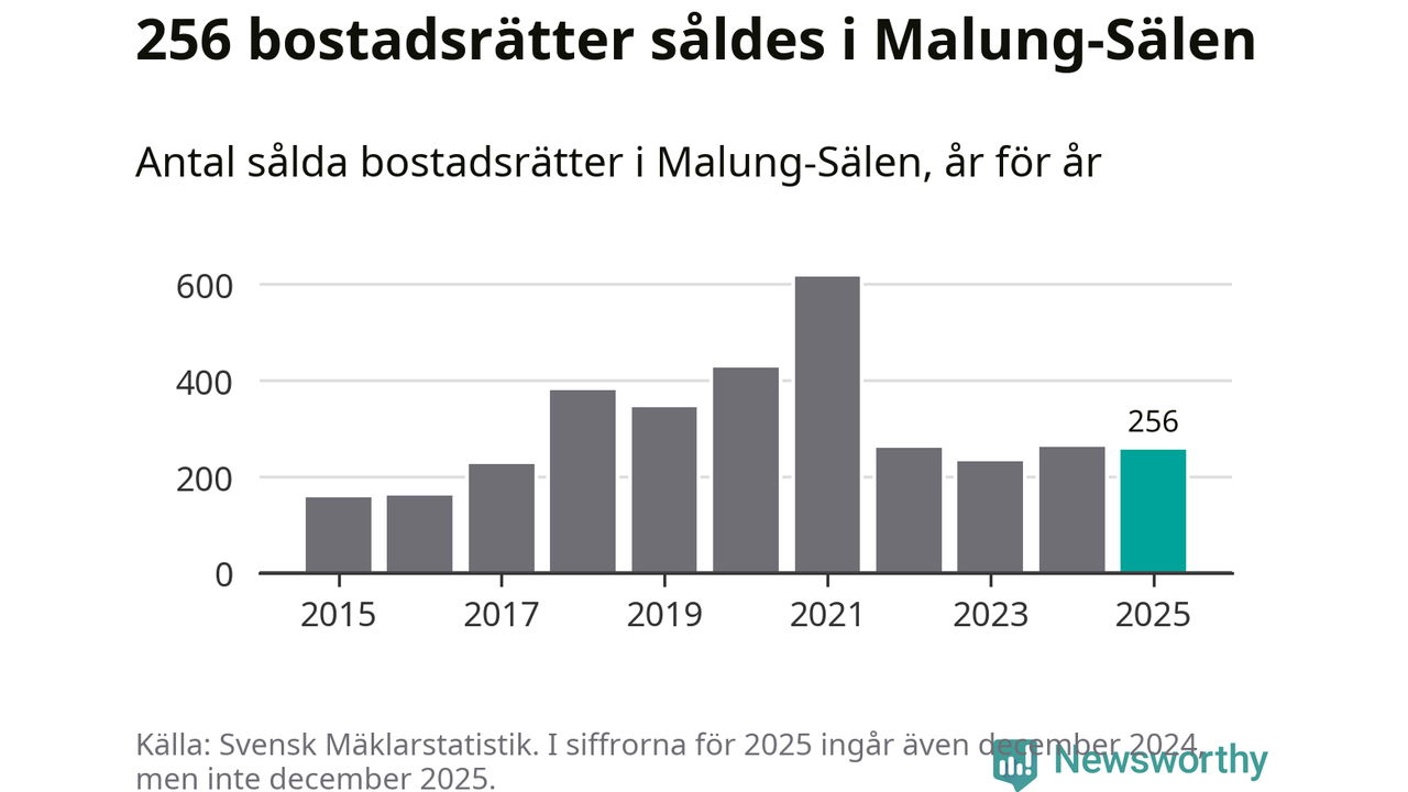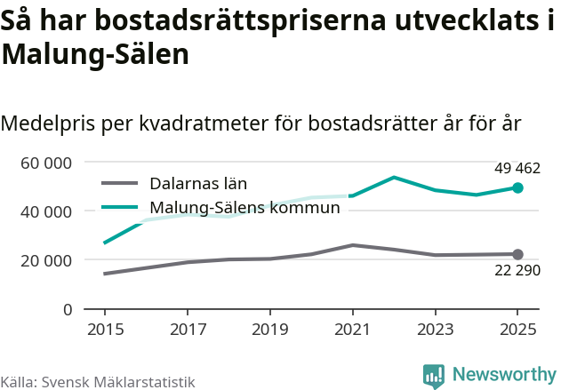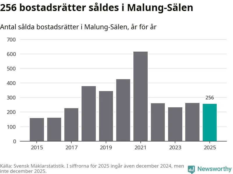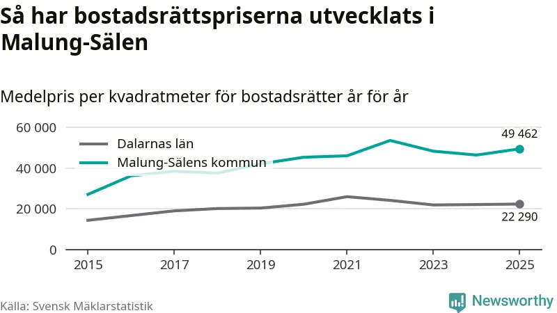 Det såldes totalt 256 bostadsrätter i Malung-Sälens kommun under året. Genomsnittspriset per kvadratmeter landade på 49 462 kronor. Det är en ökning med sju procent i kommunen på ett år.
