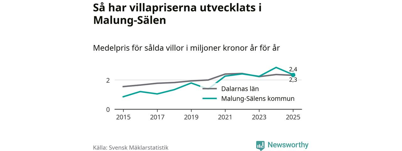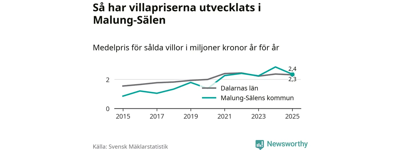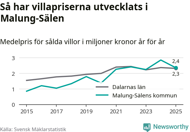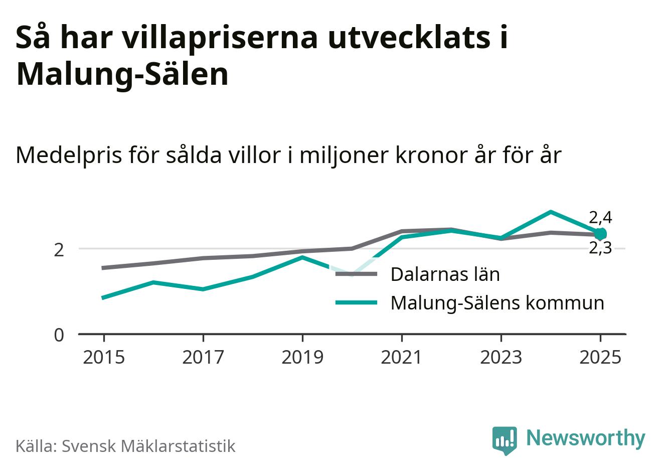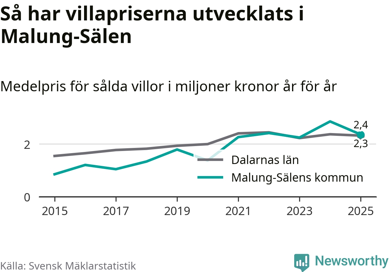 2,4 miljoner kronor är medelpriset för de villor som såldes i Malung-Sälens kommun under året, eller 22 170 kronor per kvadratmeter. Det innebär en prisminskning med 17 procent på ett år.