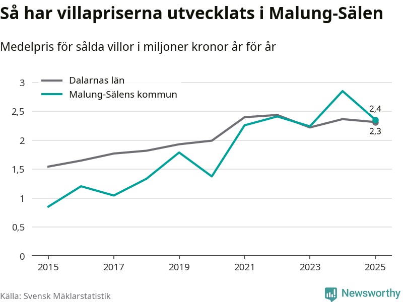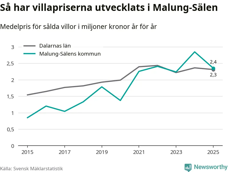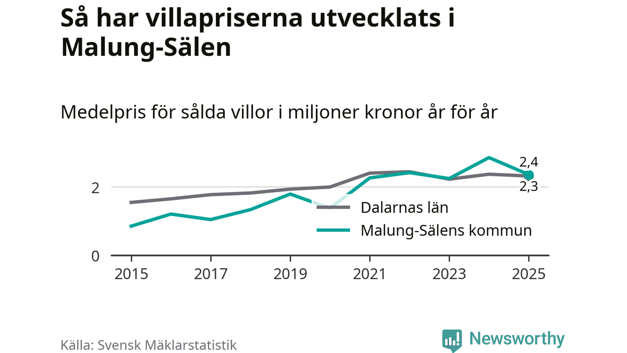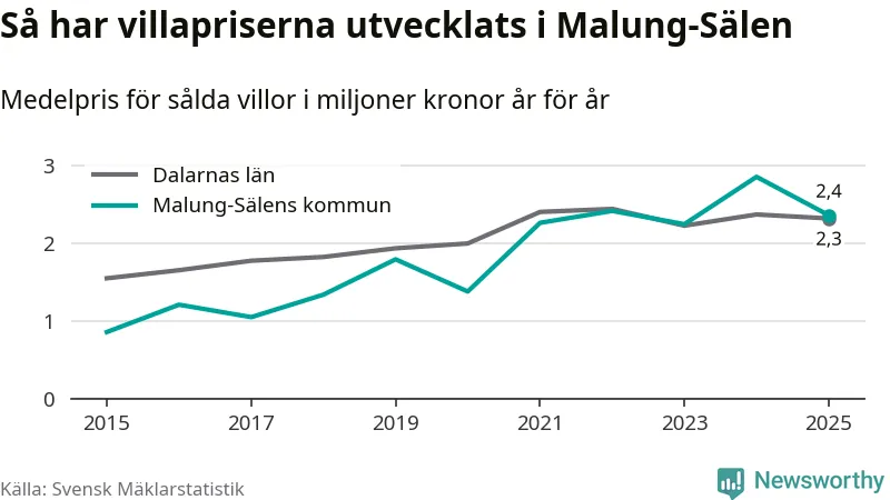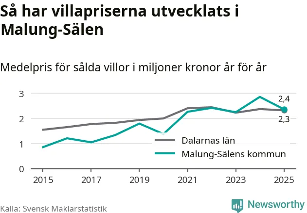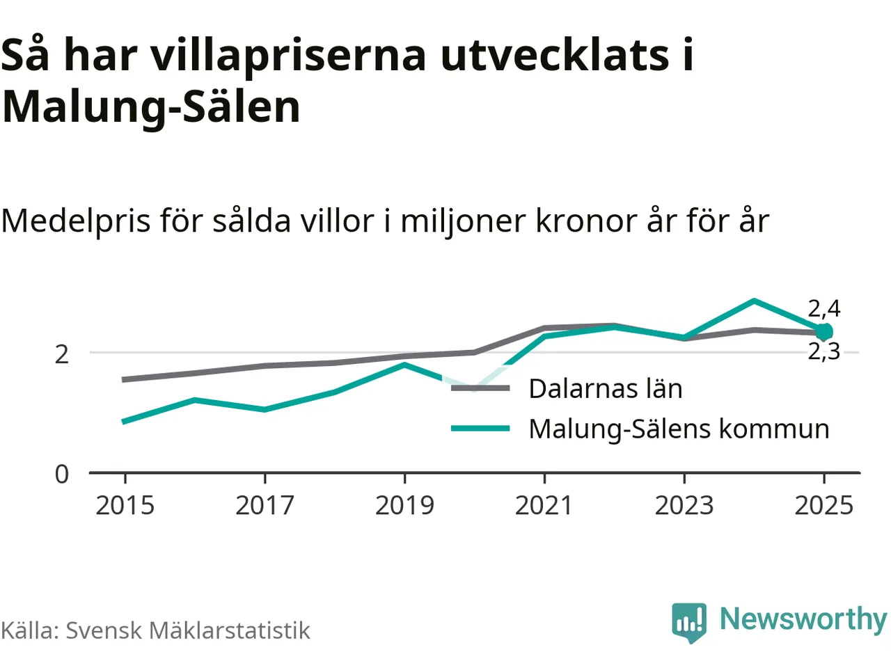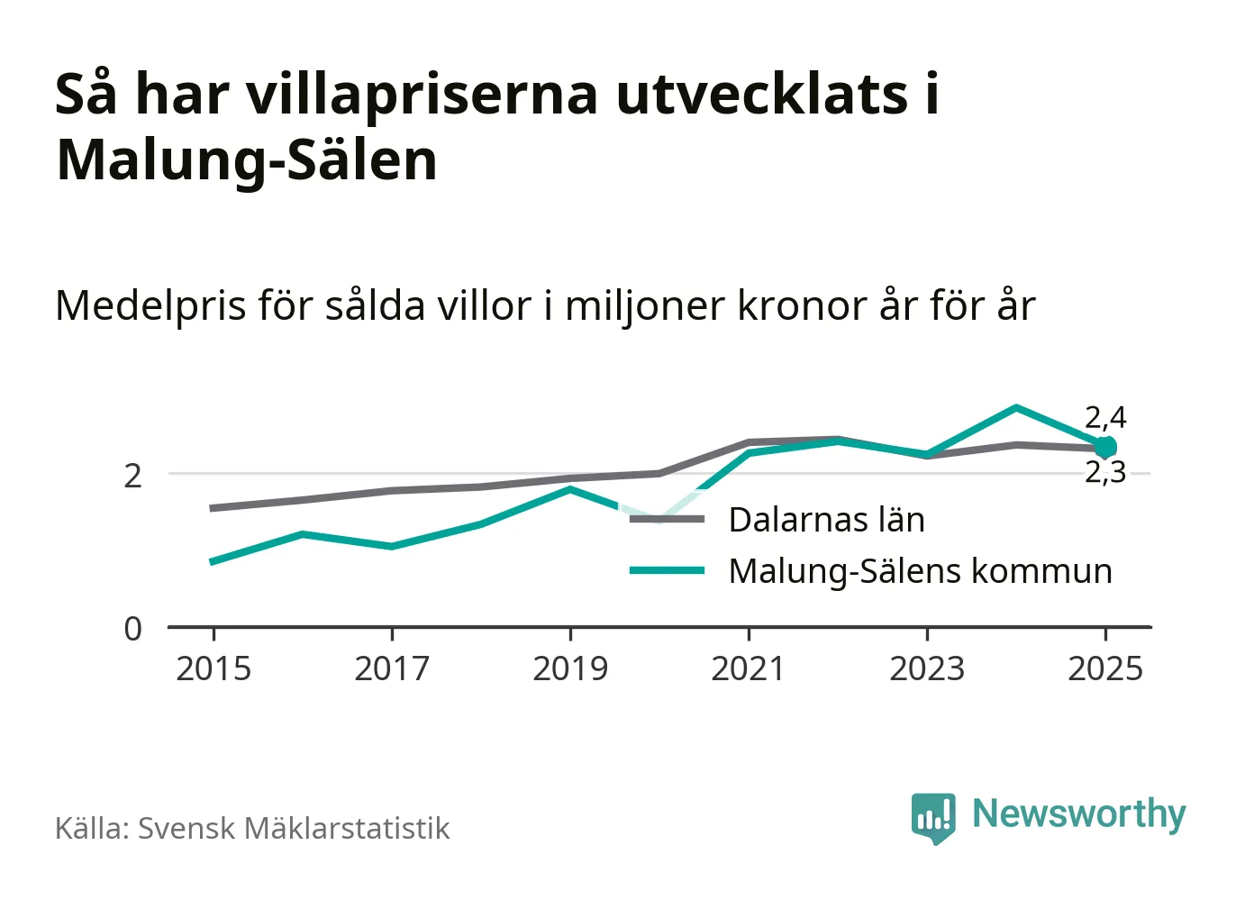 2,4 miljoner kronor är medelpriset för de villor som såldes i Malung-Sälens kommun under året, eller 22 170 kronor per kvadratmeter. Det innebär en prisminskning med 17 procent på ett år.