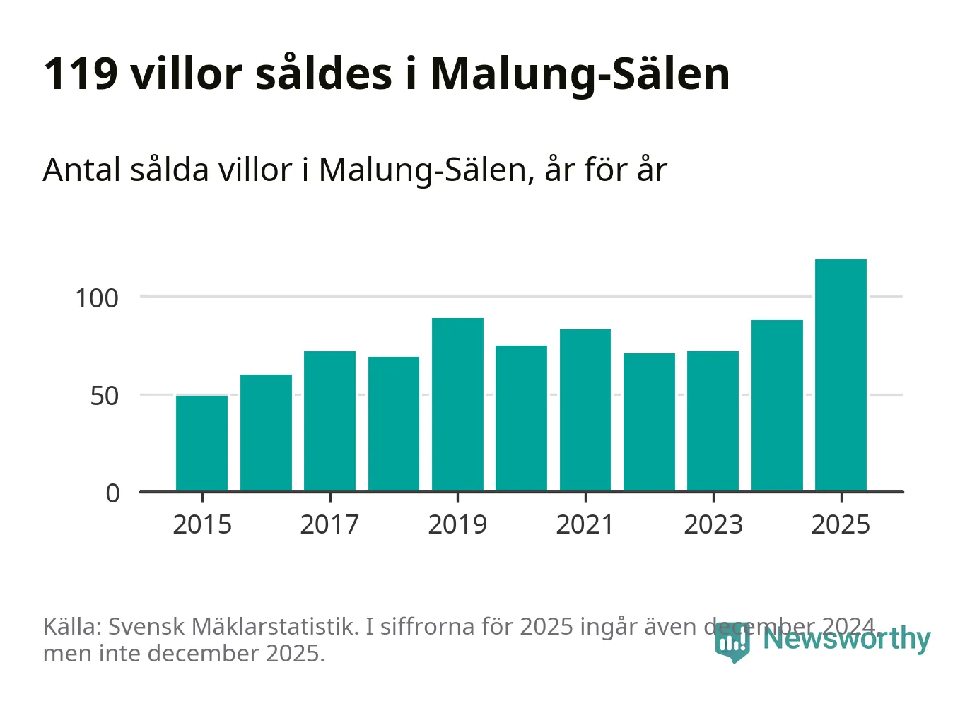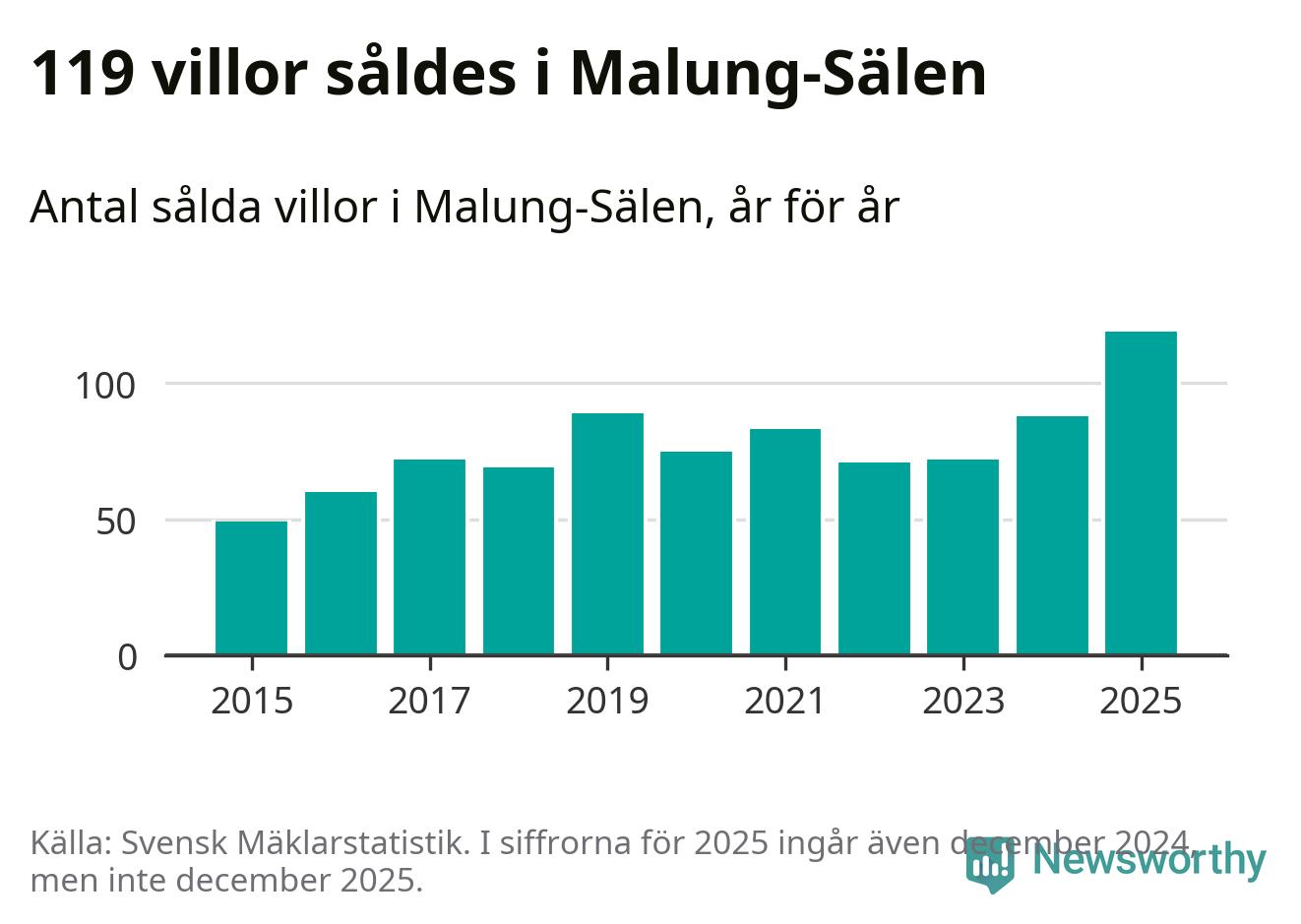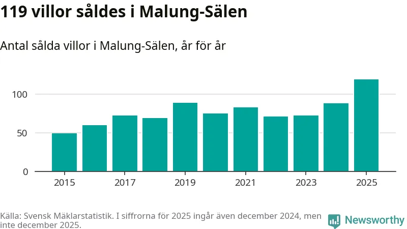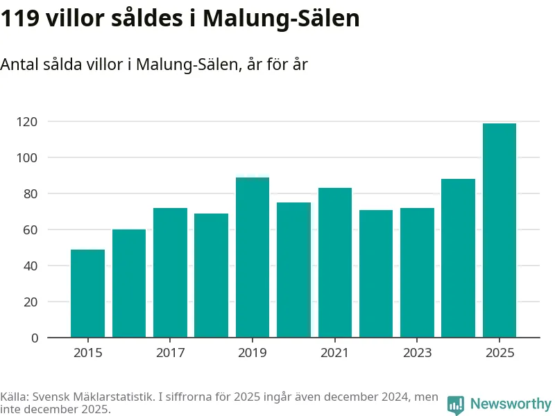 Däremot ökade antalet sålda villor. Totalt såldes 119 villor, att jämföra med 88 under 2024. Det är fler än något annat år sedan 2015.