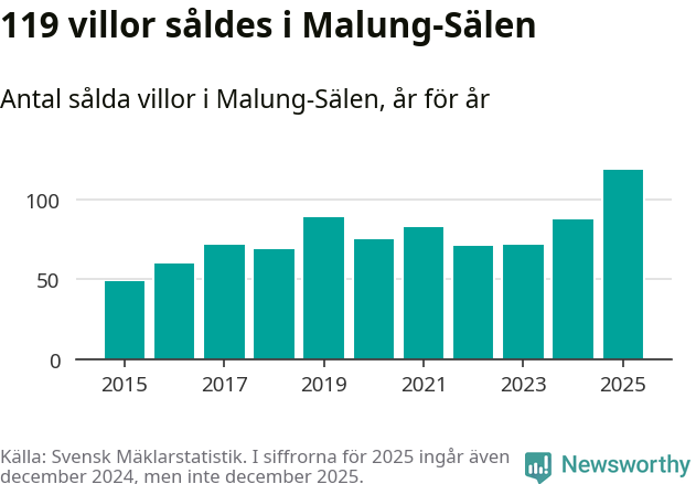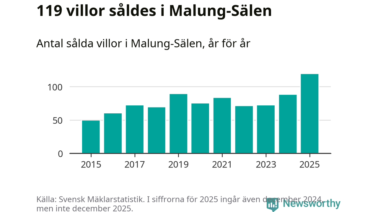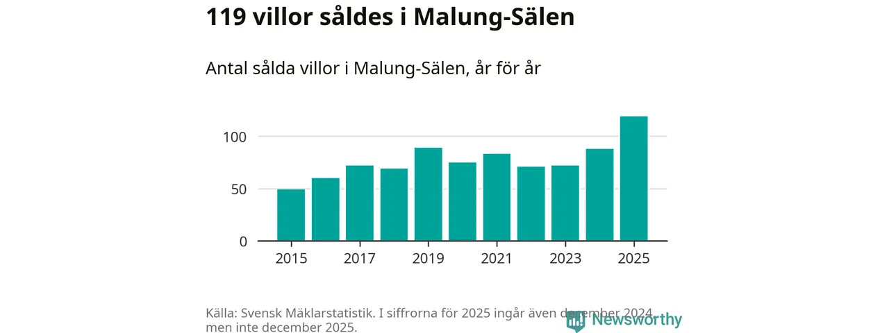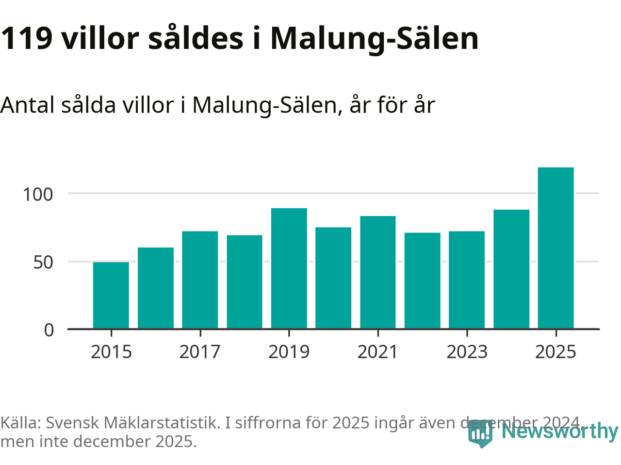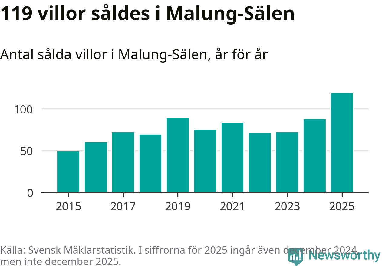 Däremot ökade antalet sålda villor. Totalt såldes 119 villor, att jämföra med 88 under 2024. Det är fler än något annat år sedan 2015.