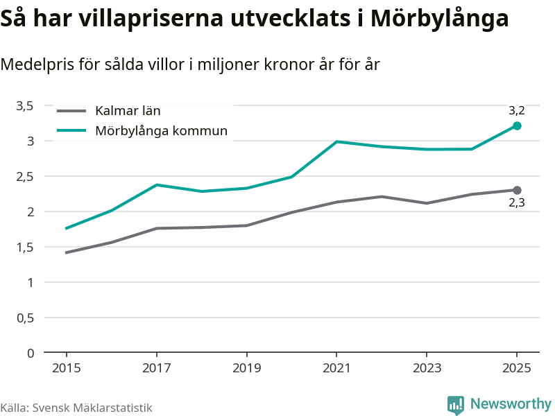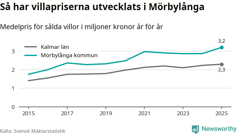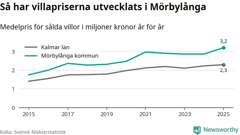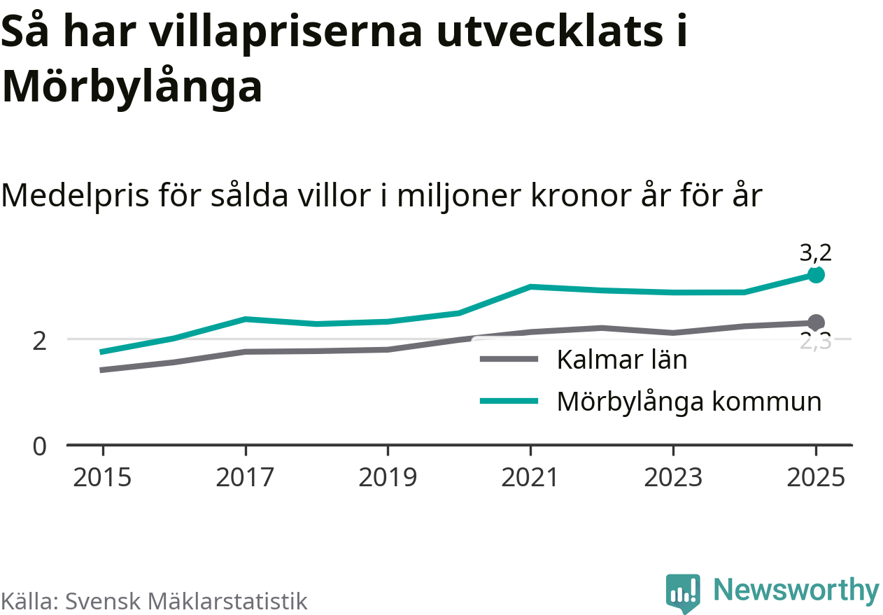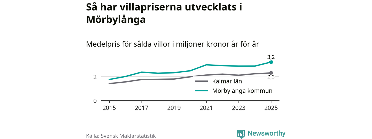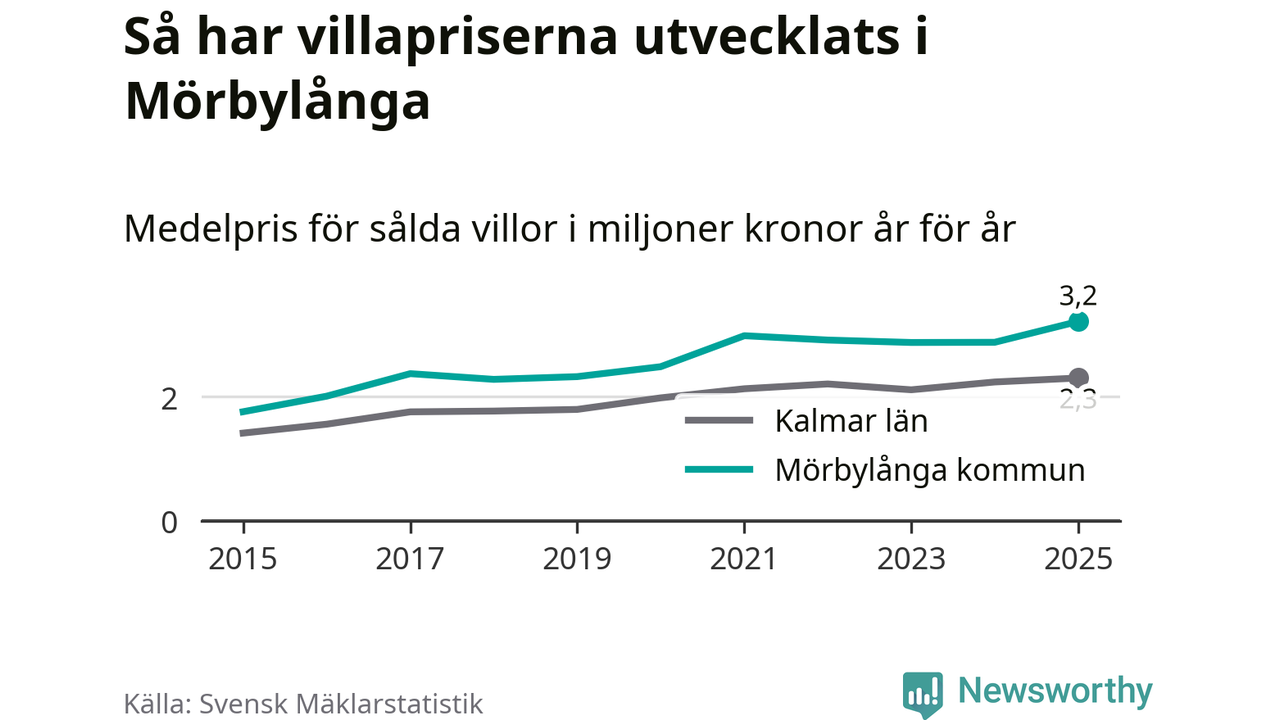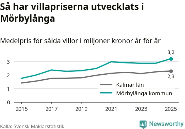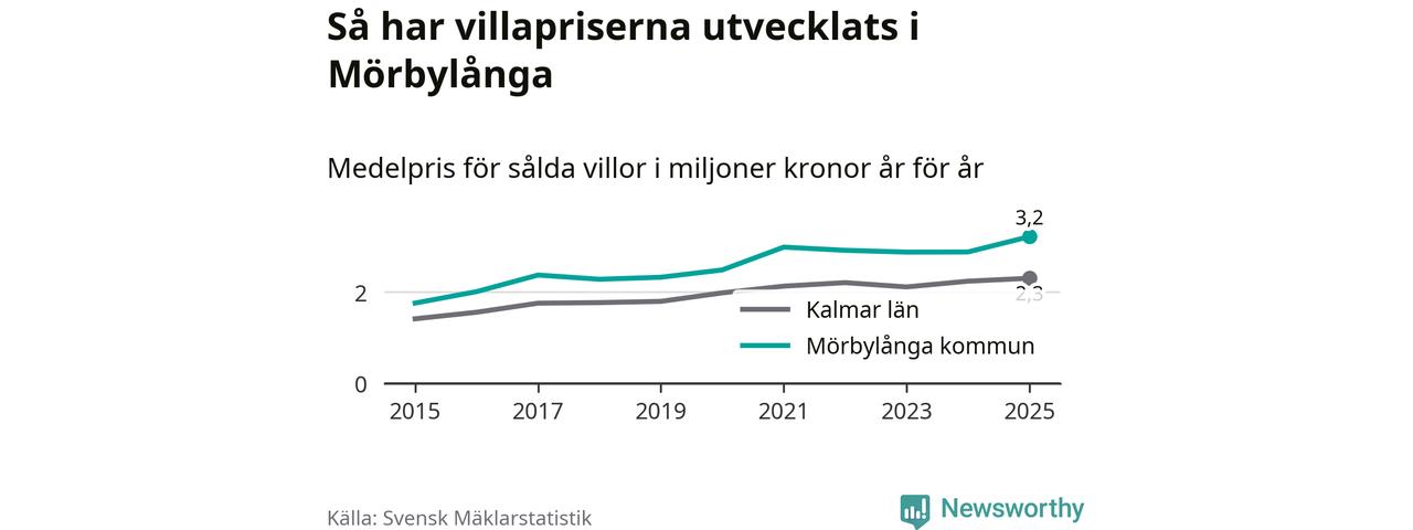 3,2 miljoner kronor är medelpriset för de villor som såldes i Mörbylånga kommun under året, eller 27 799 kronor per kvadratmeter. Det innebär en prisökning med tolv procent på ett år. Det är det högsta årssnittet på åtminstone tio år. Bryter man upp siffrorna per kvartal har dock ännu högre villapriser noterats i Mörbylånga vintern 2021/22.