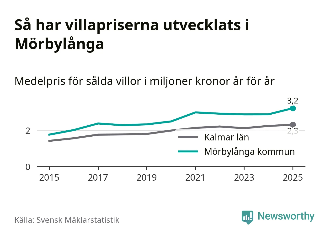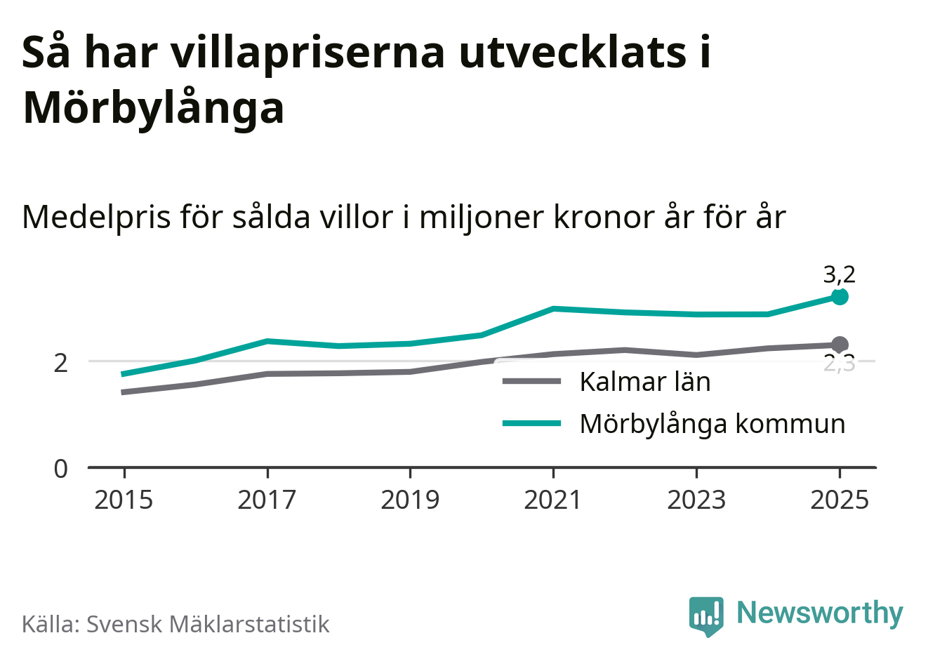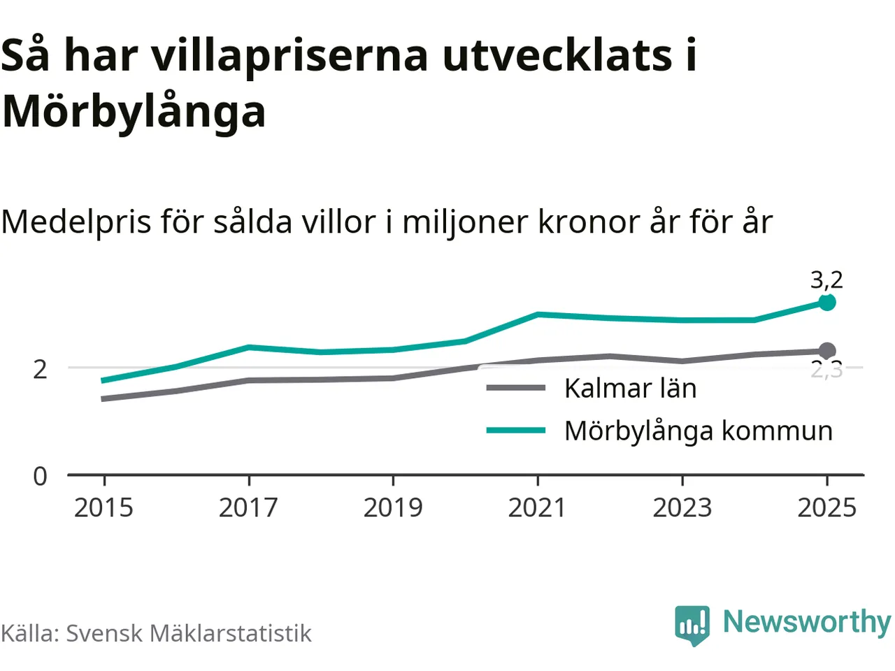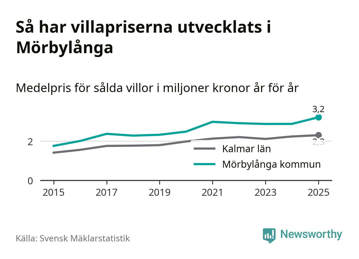 3,2 miljoner kronor är medelpriset för de villor som såldes i Mörbylånga kommun under året, eller 27 799 kronor per kvadratmeter. Det innebär en prisökning med tolv procent på ett år. Det är det högsta årssnittet på åtminstone tio år. Bryter man upp siffrorna per kvartal har dock ännu högre villapriser noterats i Mörbylånga vintern 2021/22.