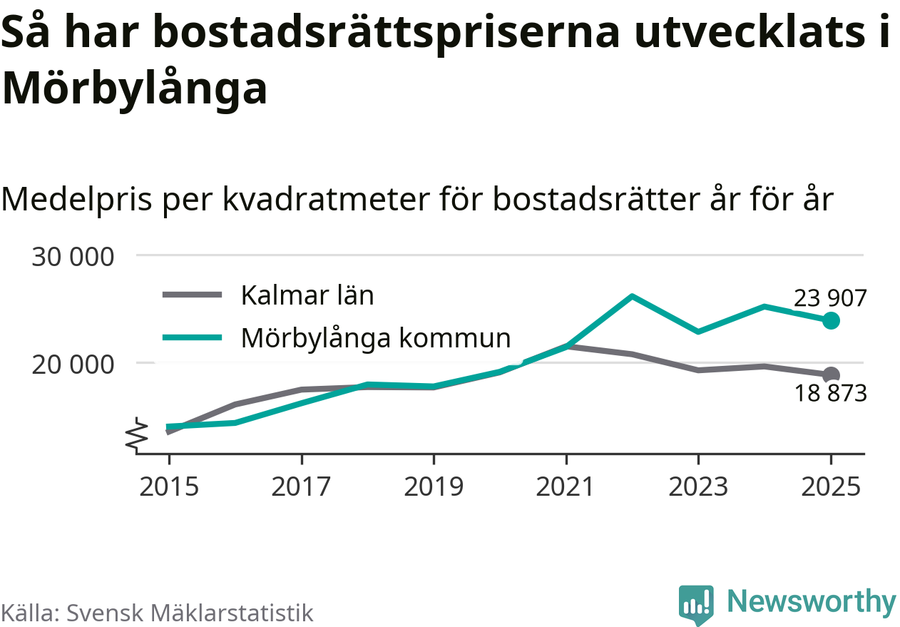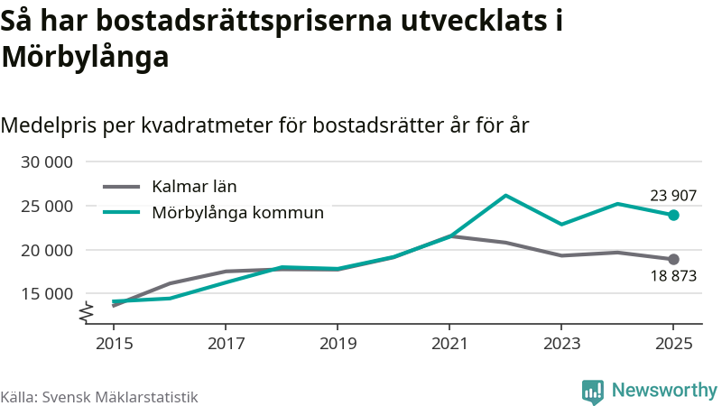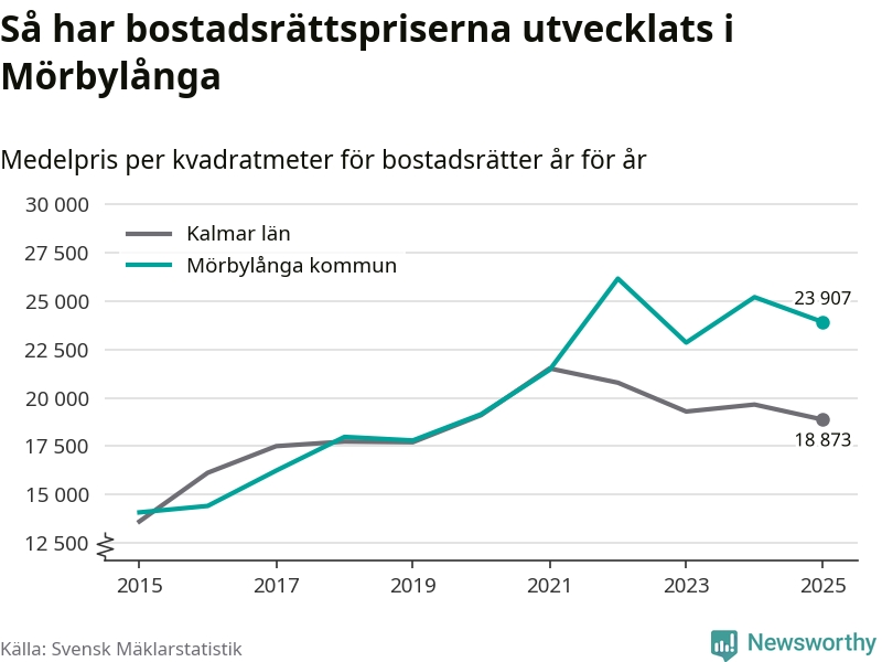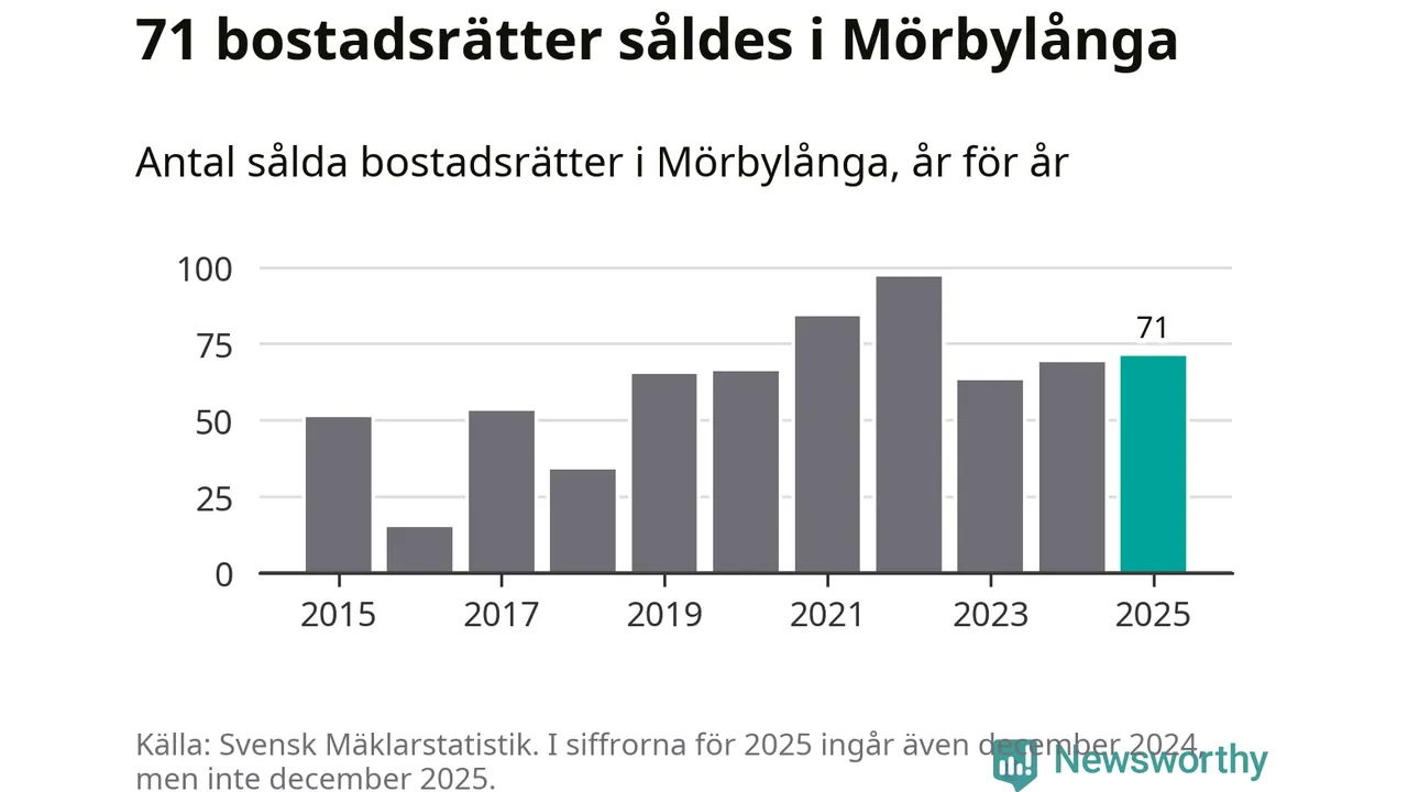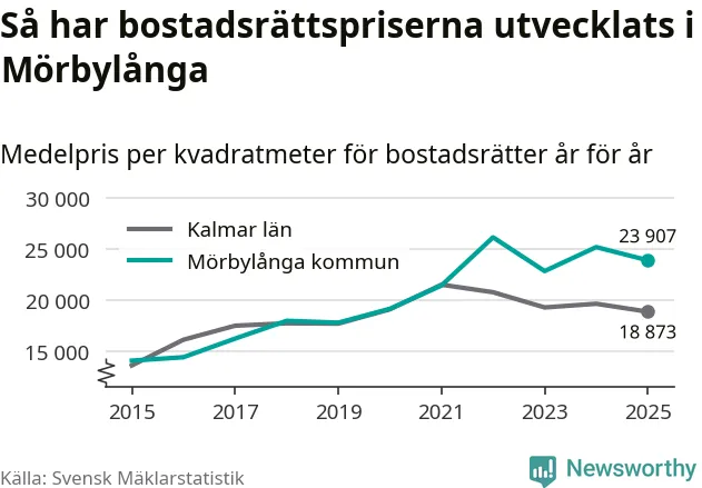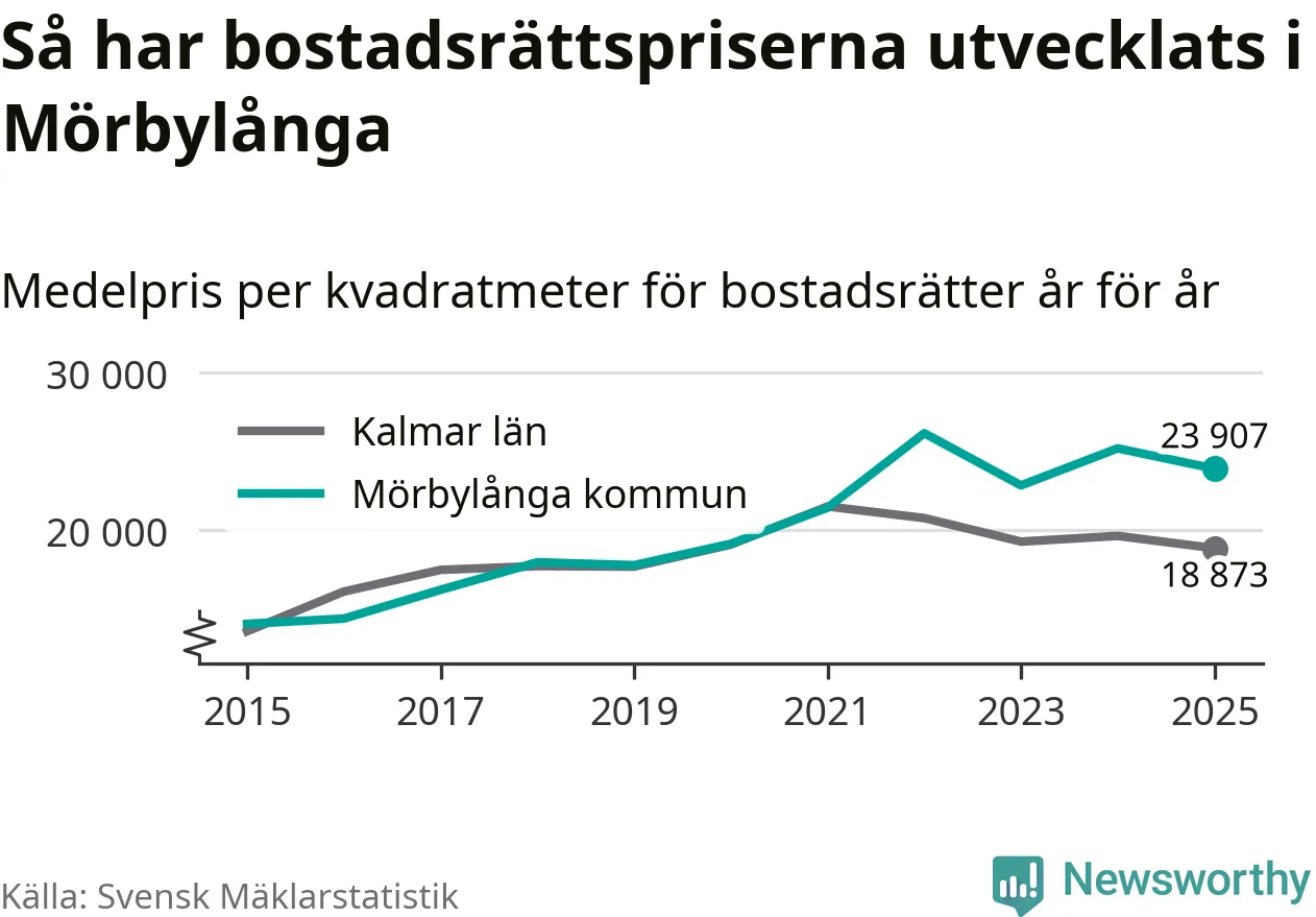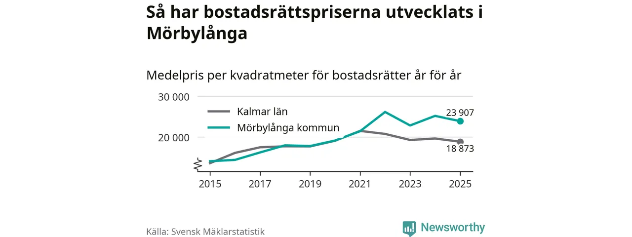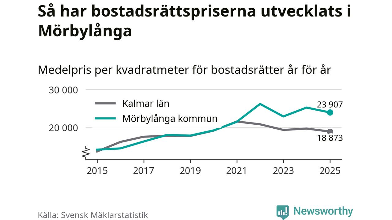 Det såldes totalt 71 bostadsrätter i Mörbylånga kommun under året. Genomsnittspriset per kvadratmeter landade på 23 907 kronor. Det är en minskning med fem procent i kommunen på ett år.