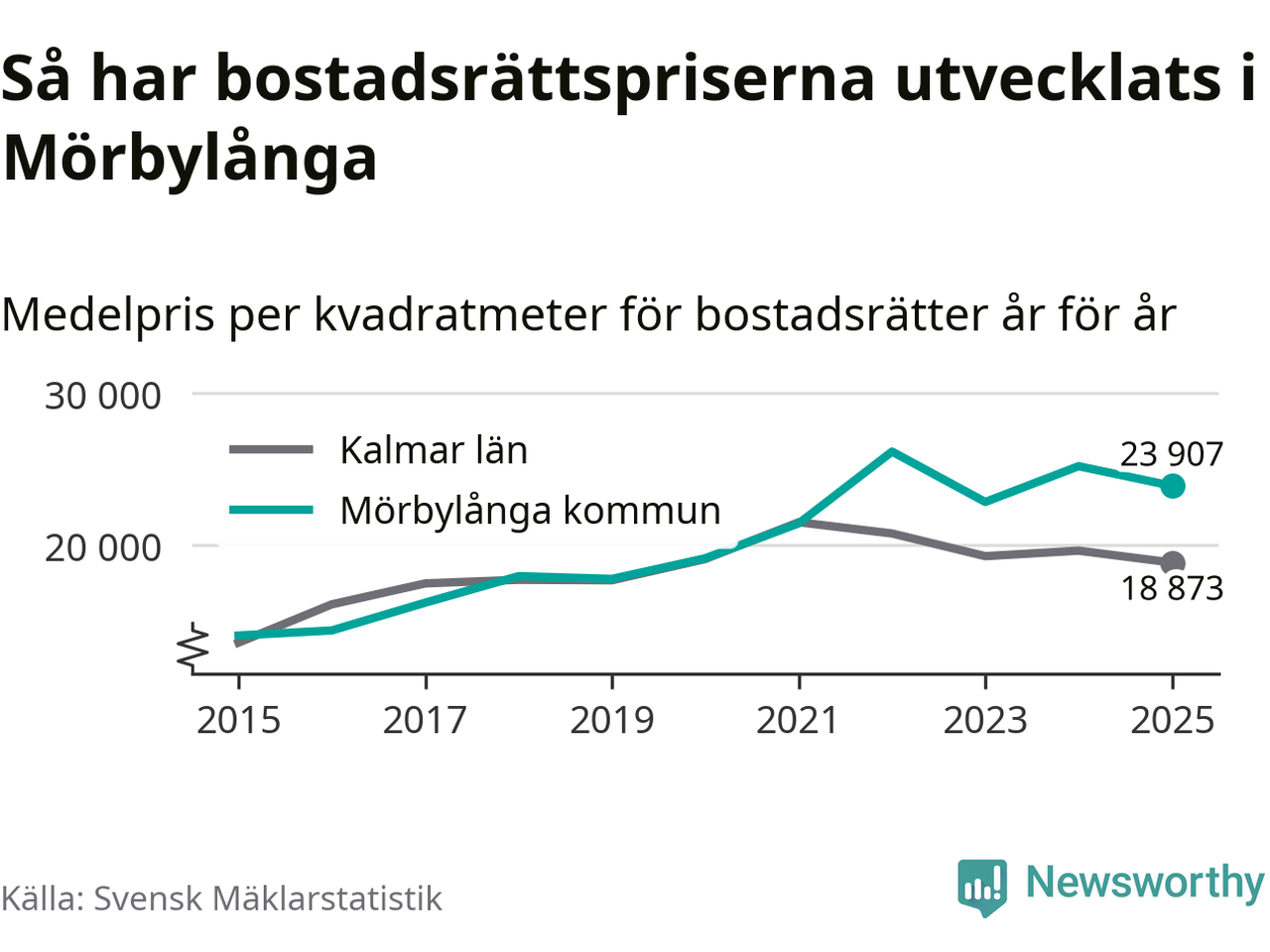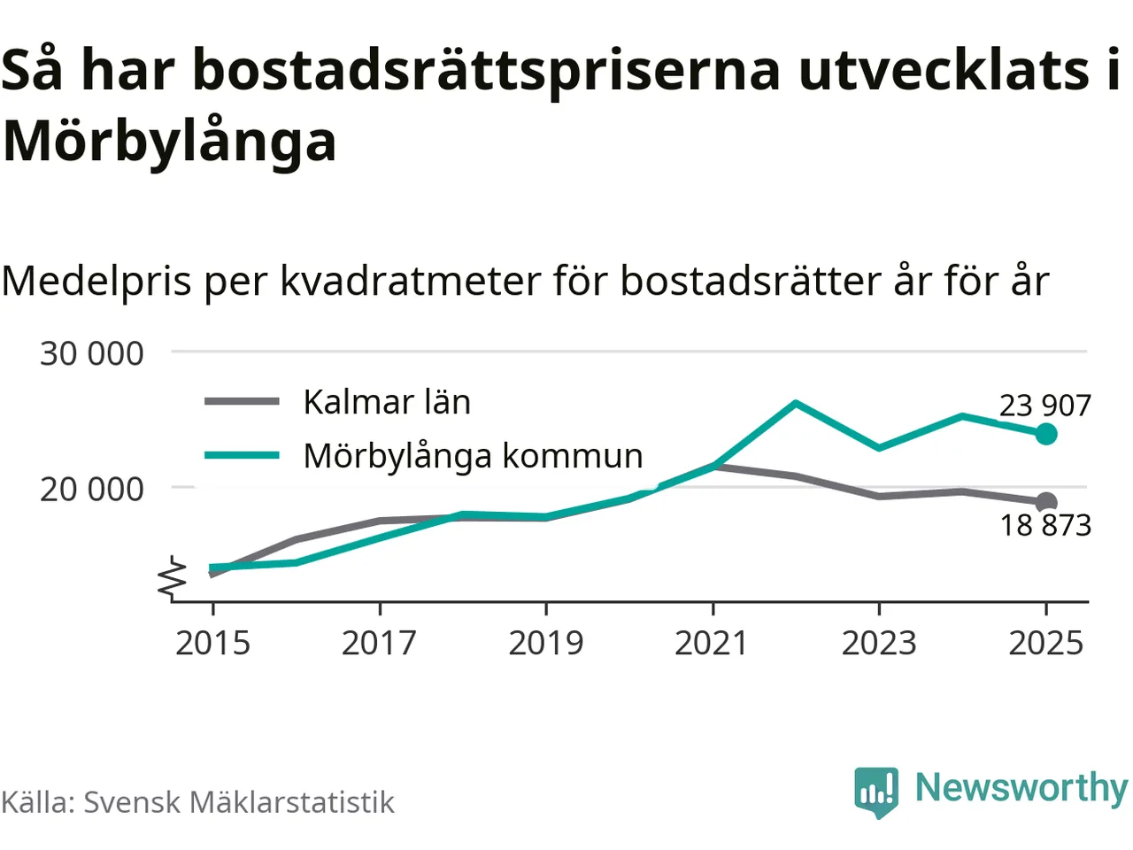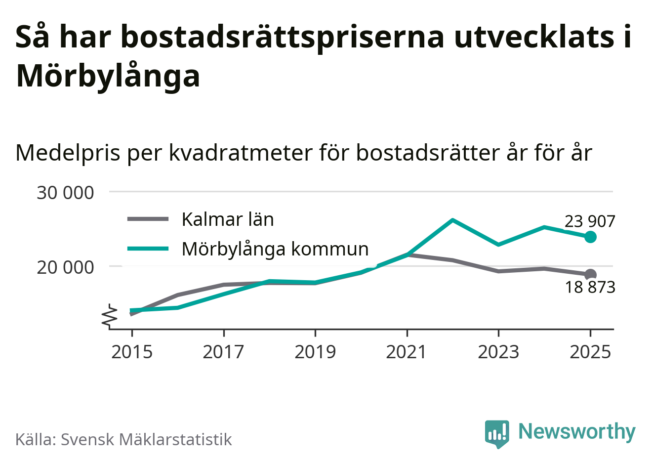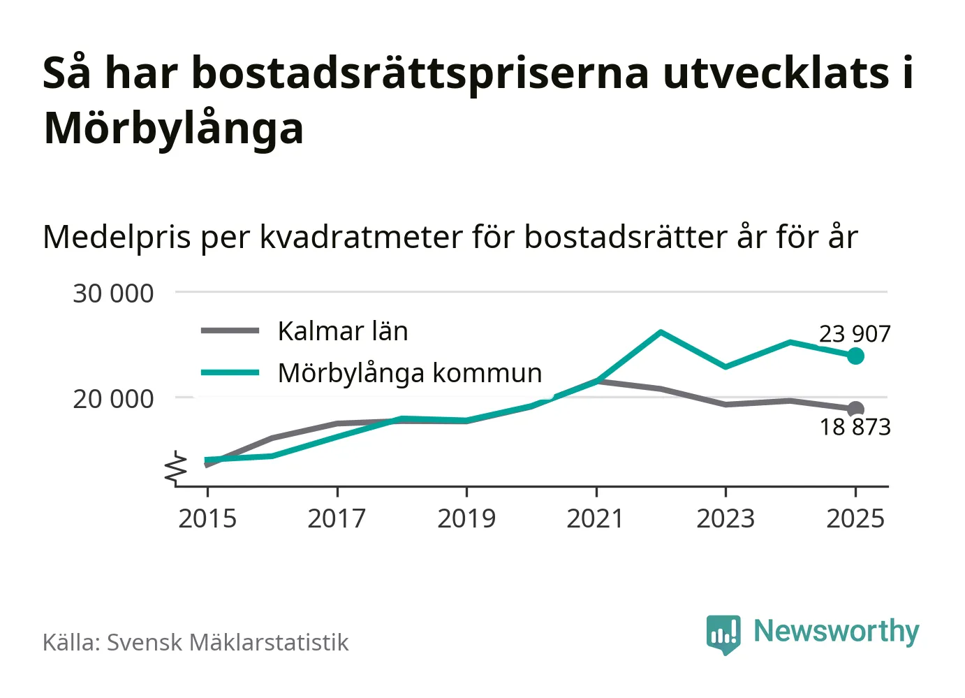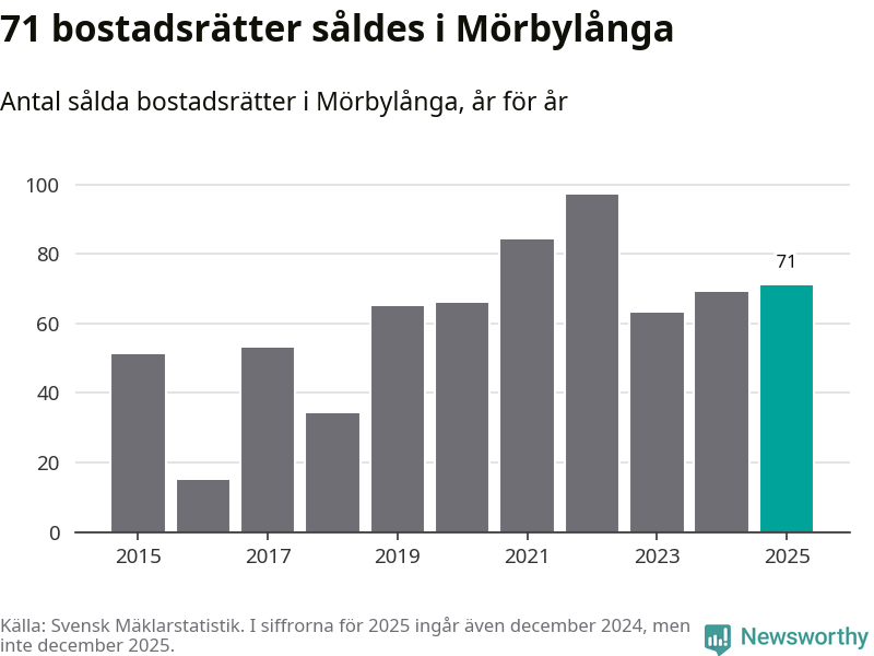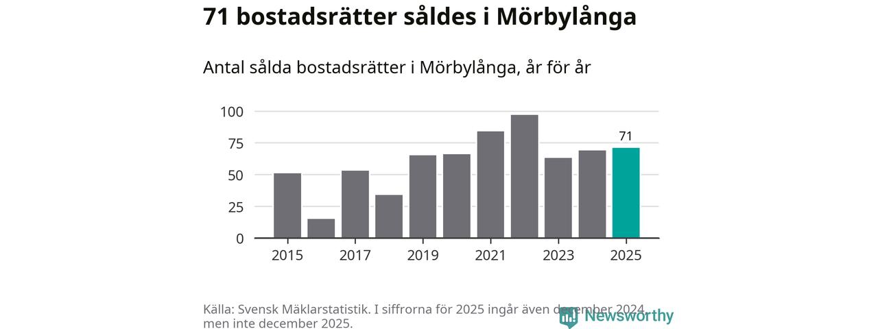 Det såldes totalt 71 bostadsrätter i Mörbylånga kommun under året. Genomsnittspriset per kvadratmeter landade på 23 907 kronor. Det är en minskning med fem procent i kommunen på ett år.