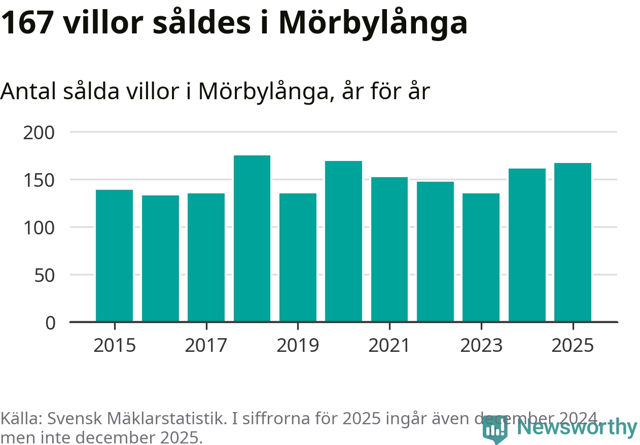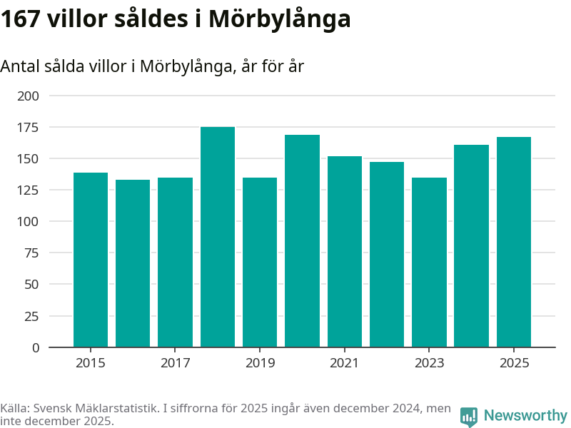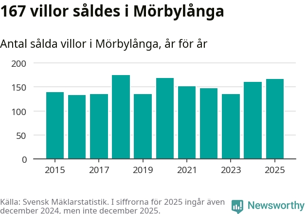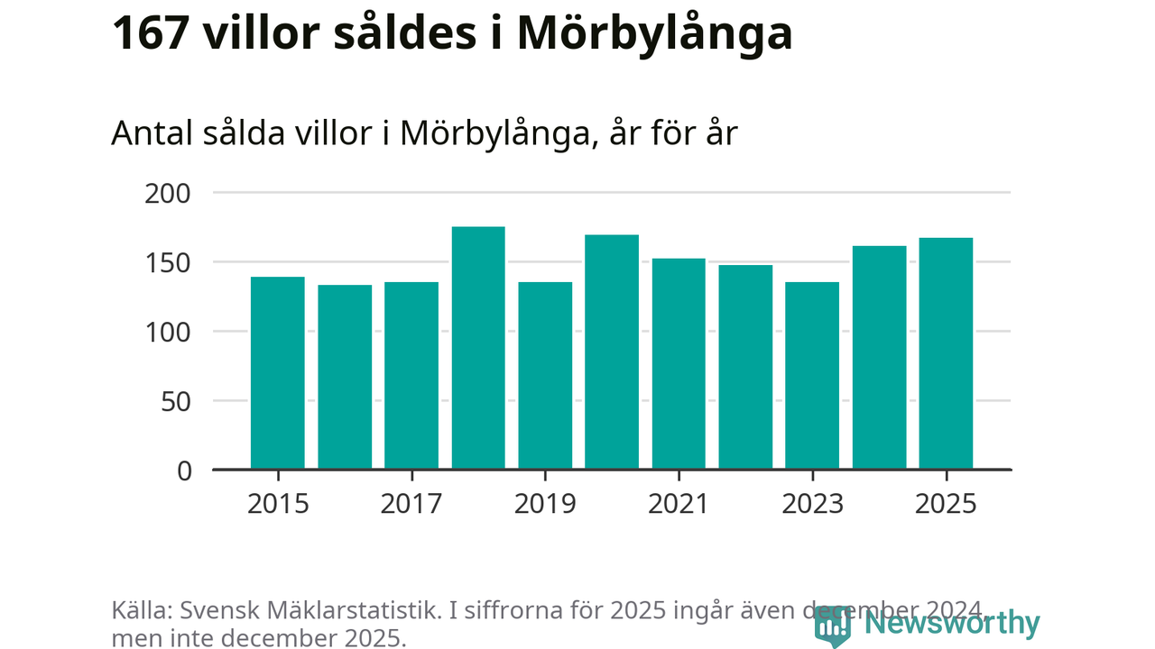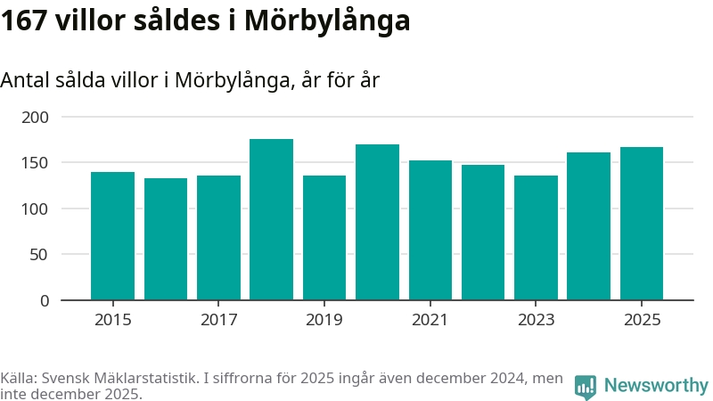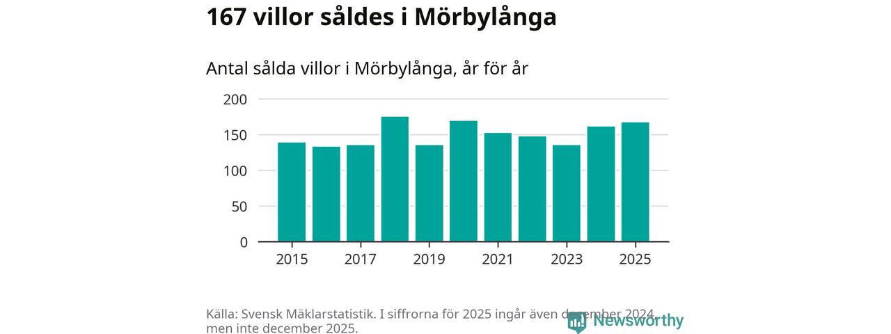 Antalet sålda villor ökade också. Totalt såldes 167 villor, att jämföra med 161 under 2024. Det är andra året i rad som antalet sålda villor ökar i kommunen.