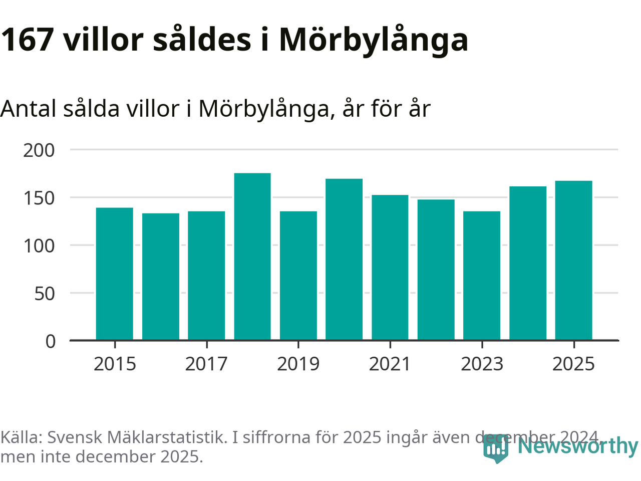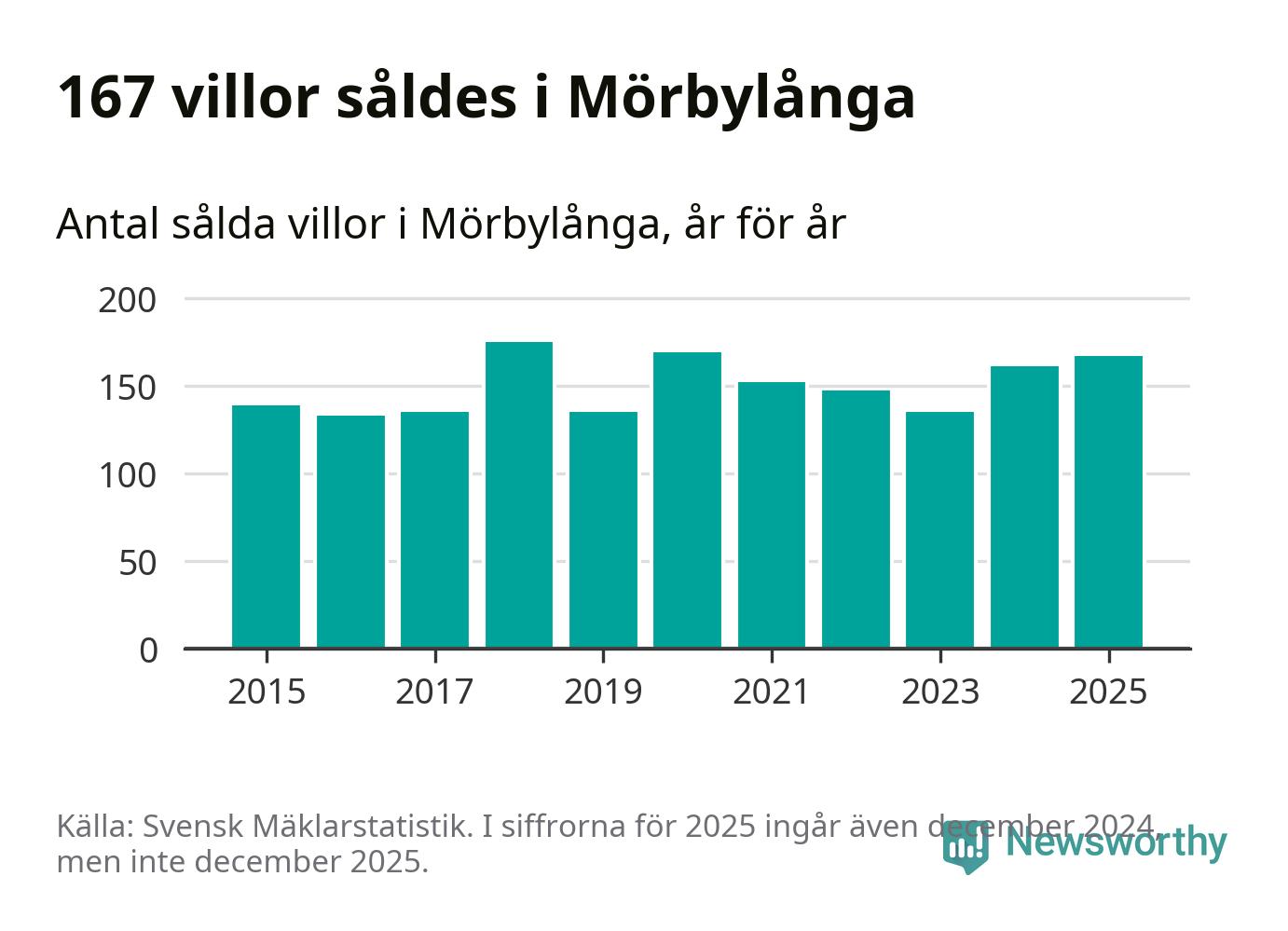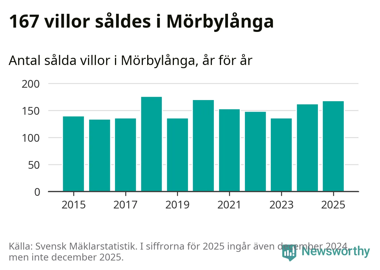 Antalet sålda villor ökade också. Totalt såldes 167 villor, att jämföra med 161 under 2024. Det är andra året i rad som antalet sålda villor ökar i kommunen.