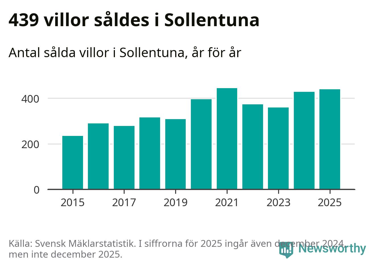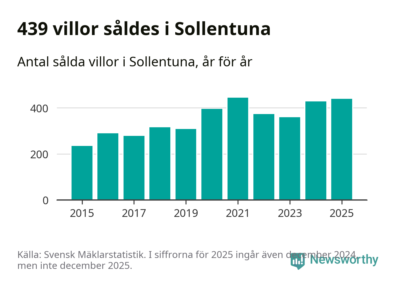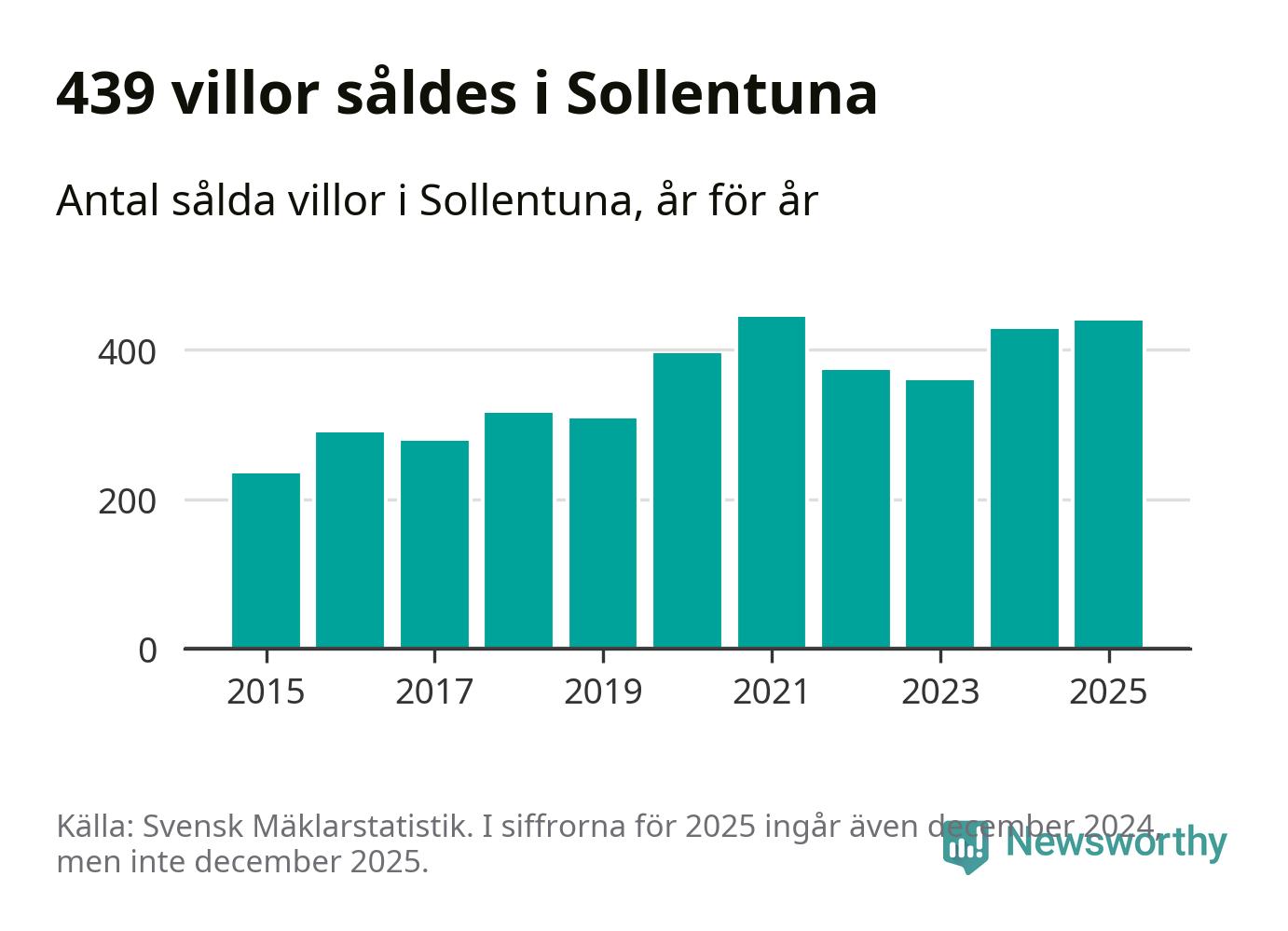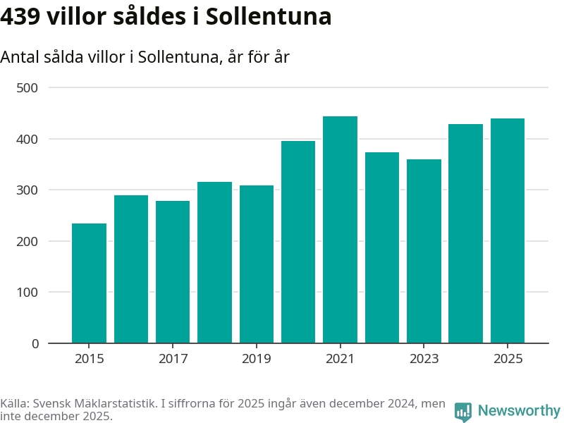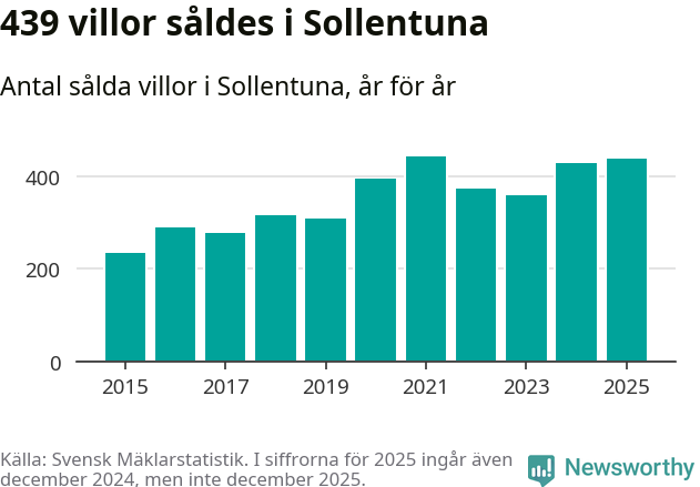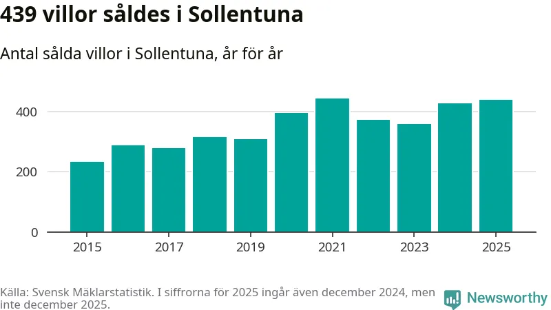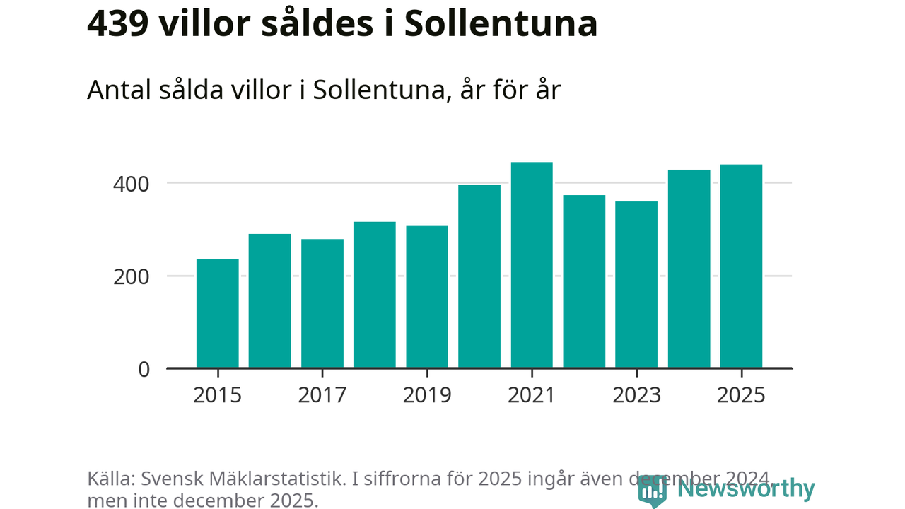 Däremot ökade antalet sålda villor. Totalt såldes 439 villor, att jämföra med 428 under 2024. Det är andra året i rad som antalet sålda villor ökar i kommunen.