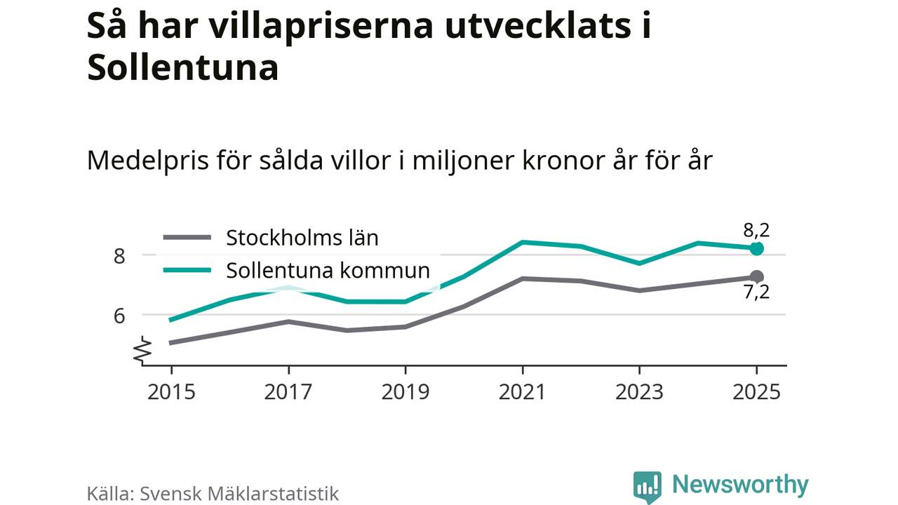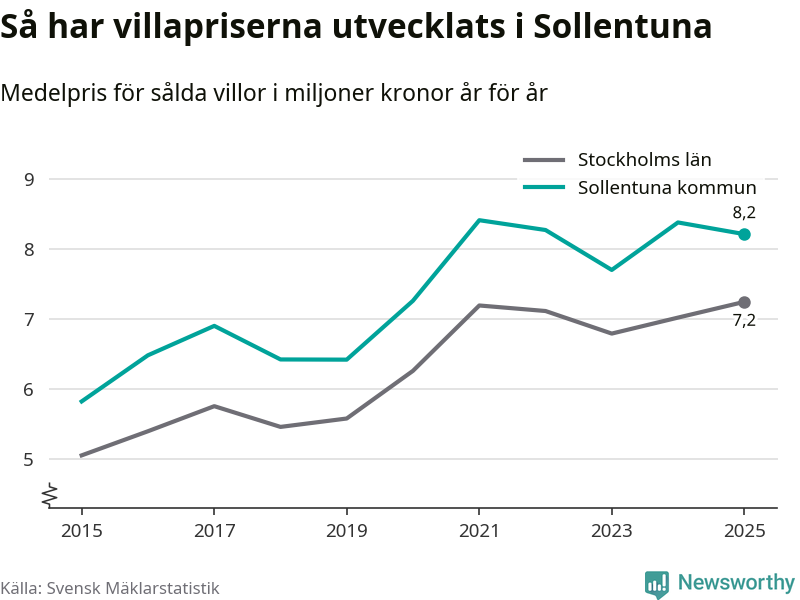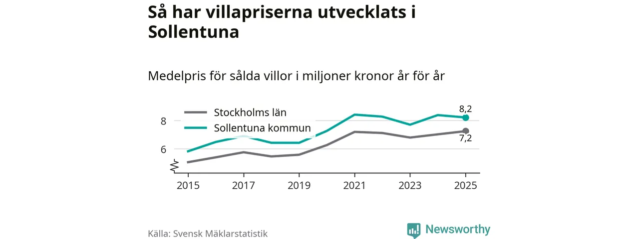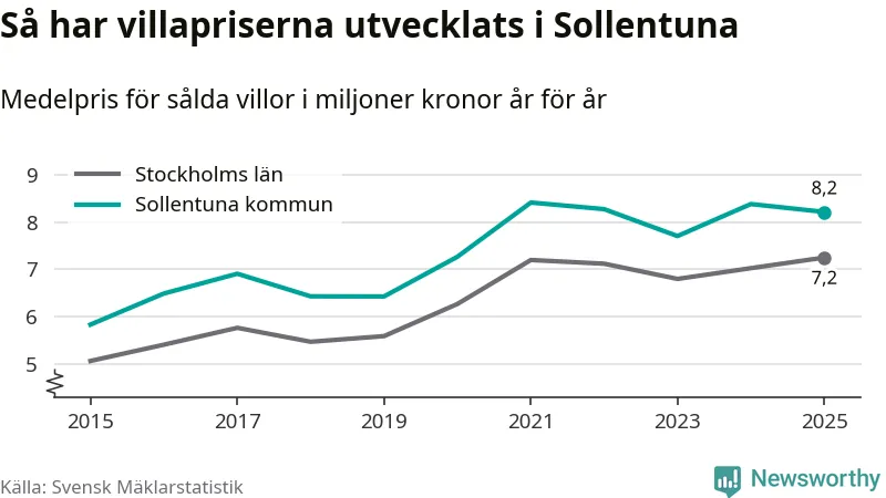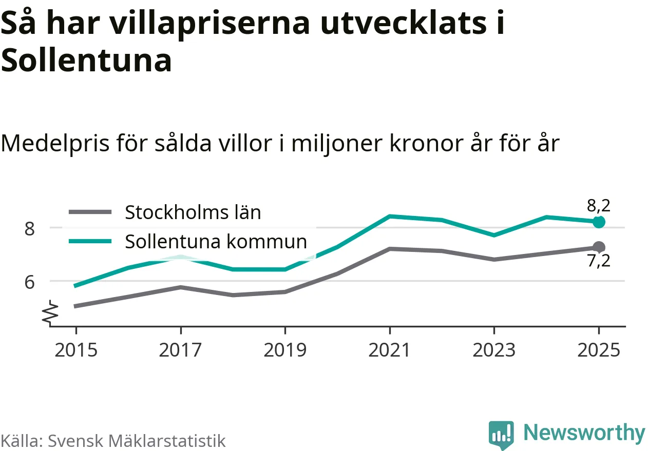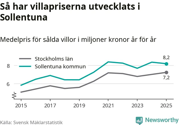 8,2 miljoner kronor är medelpriset för de villor som såldes i Sollentuna kommun under året, eller 55 760 kronor per kvadratmeter. Det innebär en prisminskning med två procent på ett år.