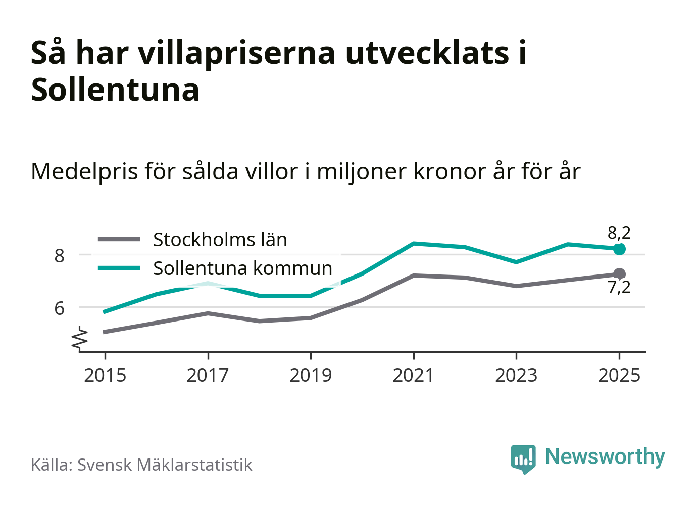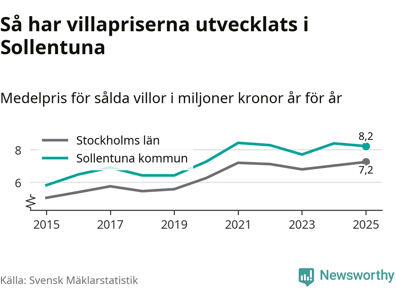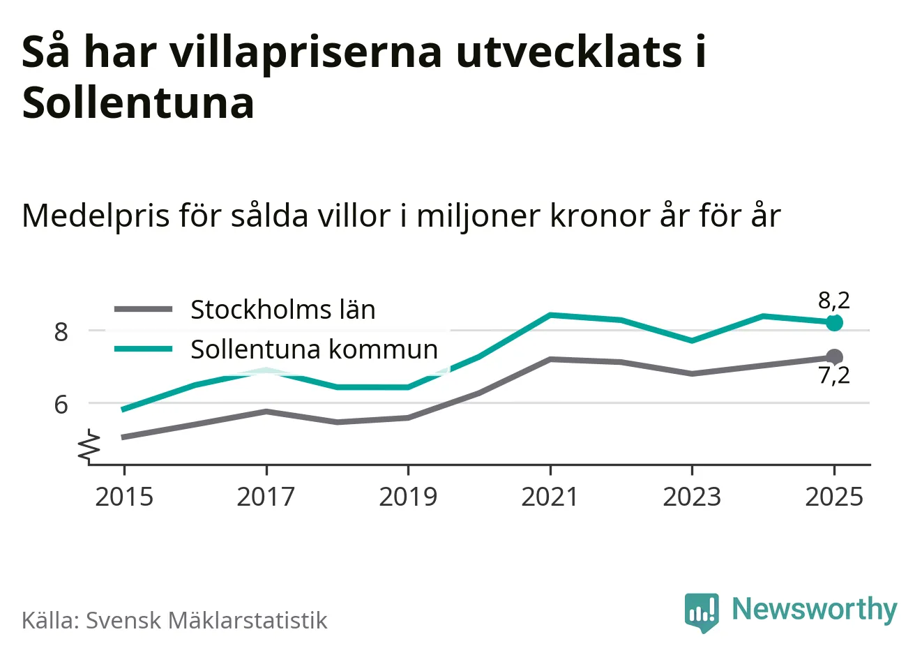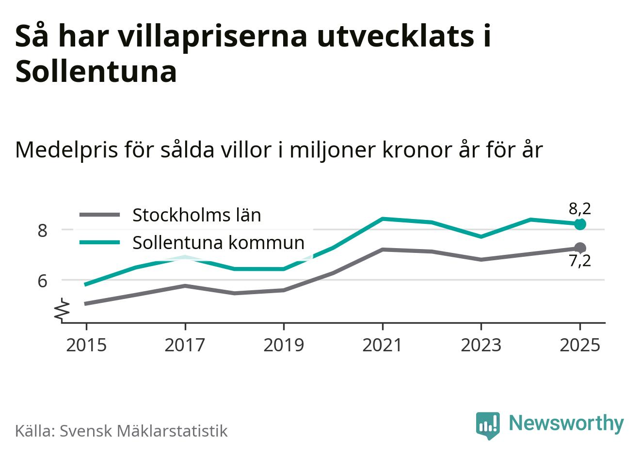 8,2 miljoner kronor är medelpriset för de villor som såldes i Sollentuna kommun under året, eller 55 760 kronor per kvadratmeter. Det innebär en prisminskning med två procent på ett år.