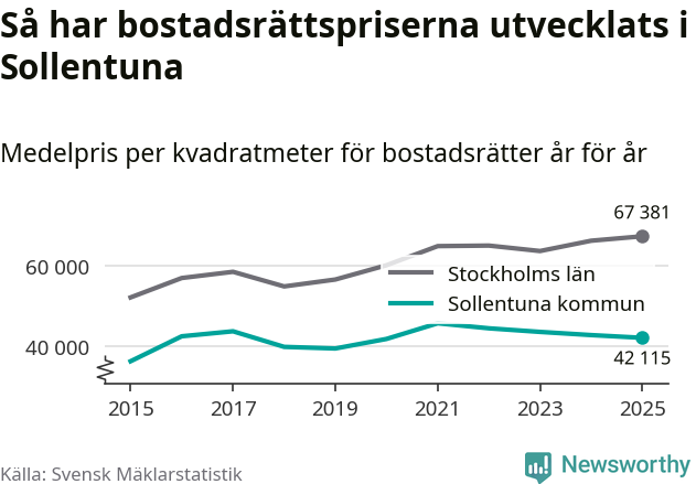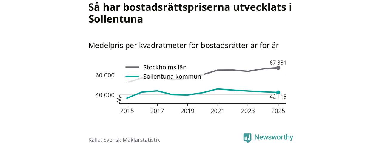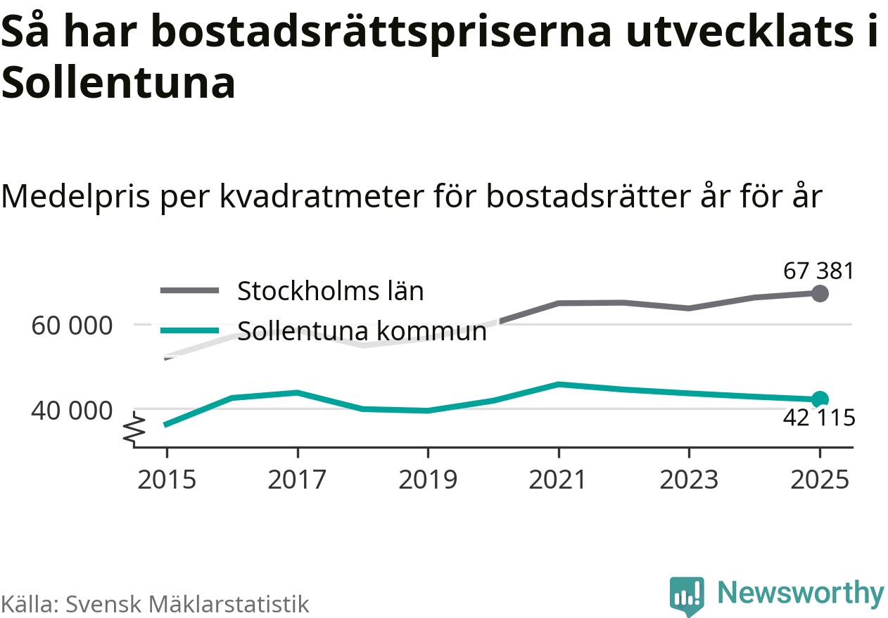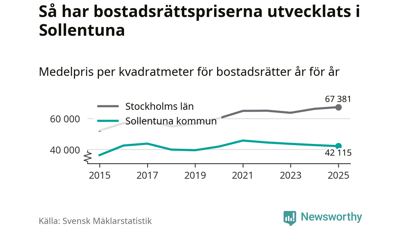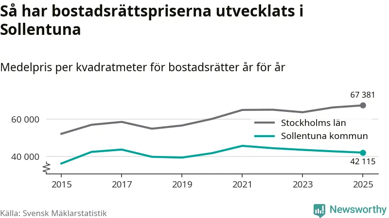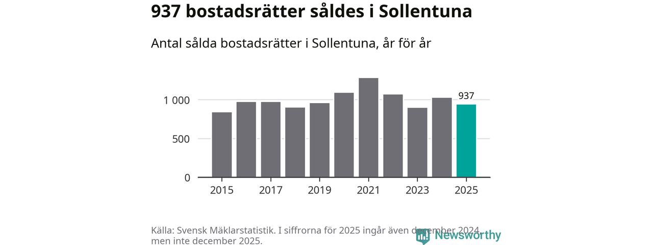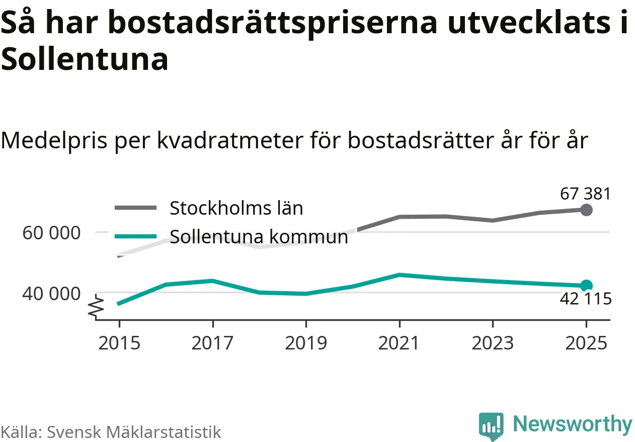 Det såldes totalt 937 bostadsrätter i Sollentuna kommun under året. Genomsnittspriset per kvadratmeter landade på 42 115 kronor. Det är en minskning med två procent i kommunen på ett år.