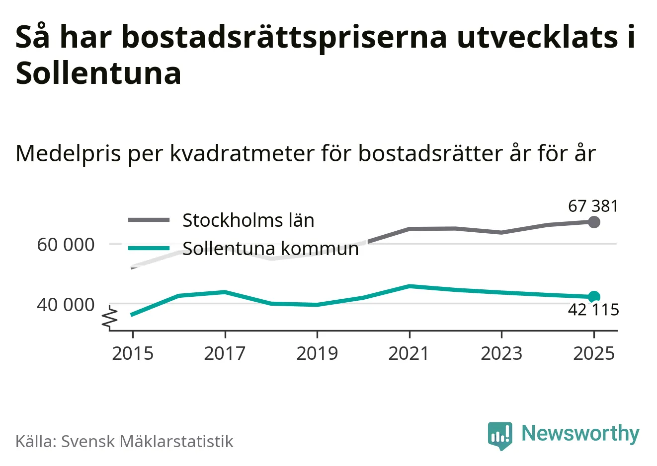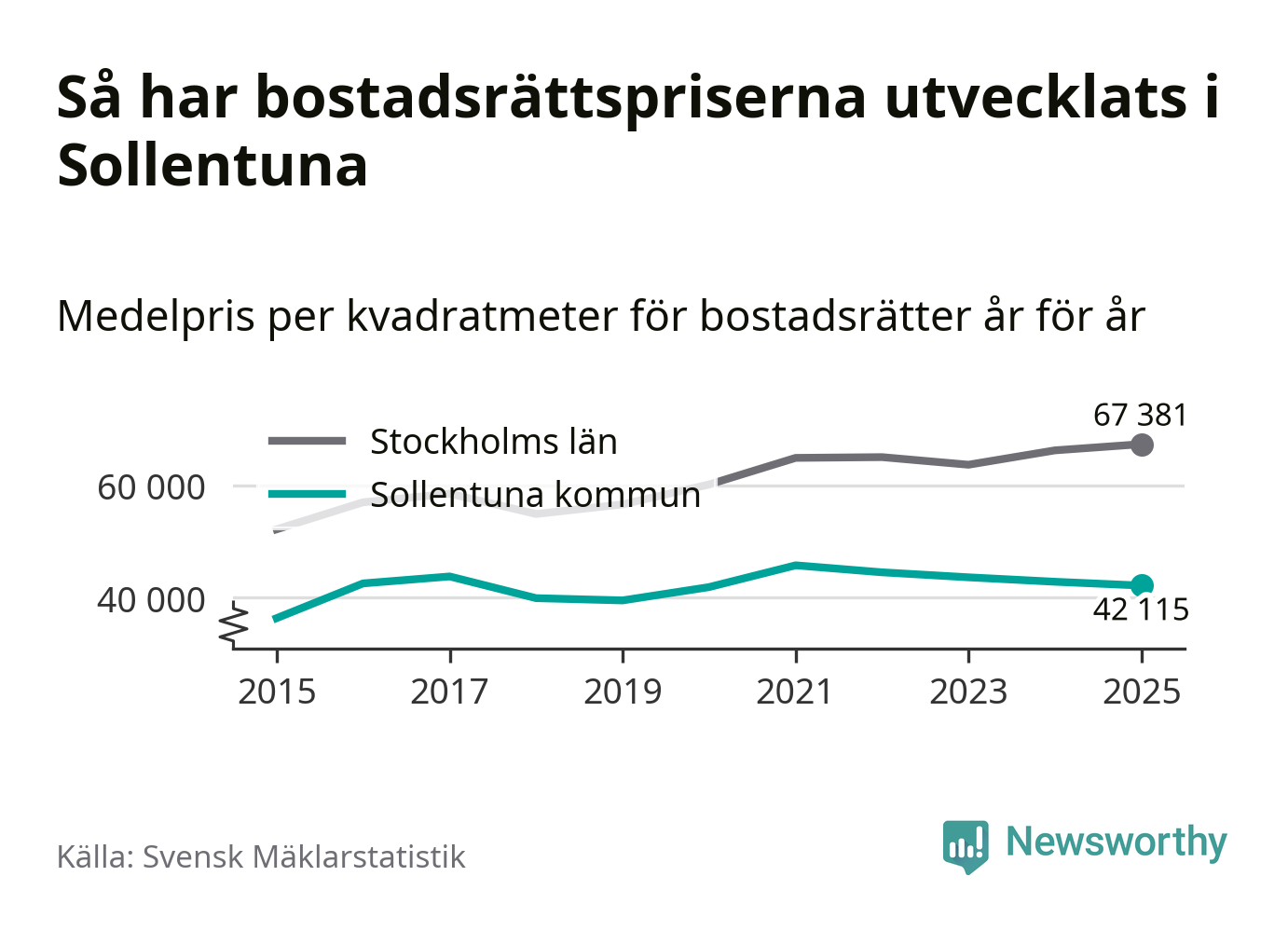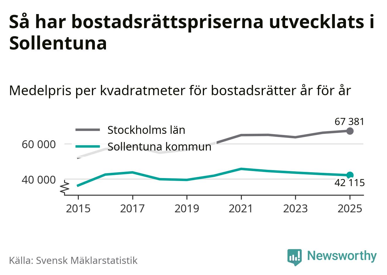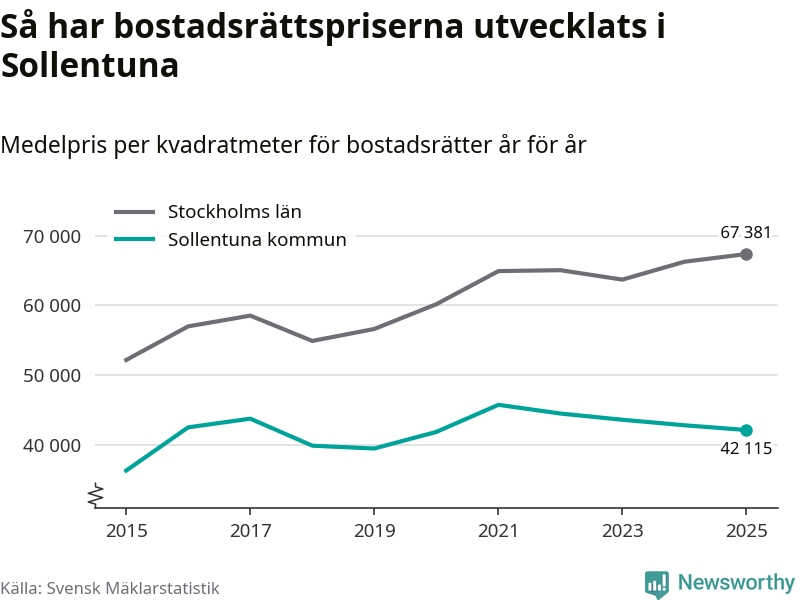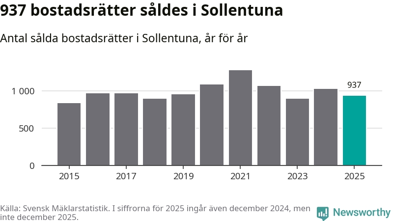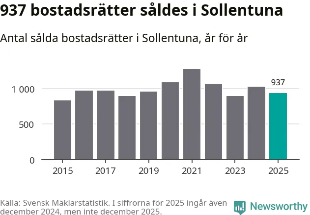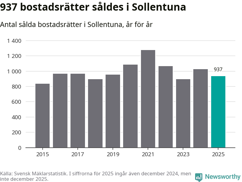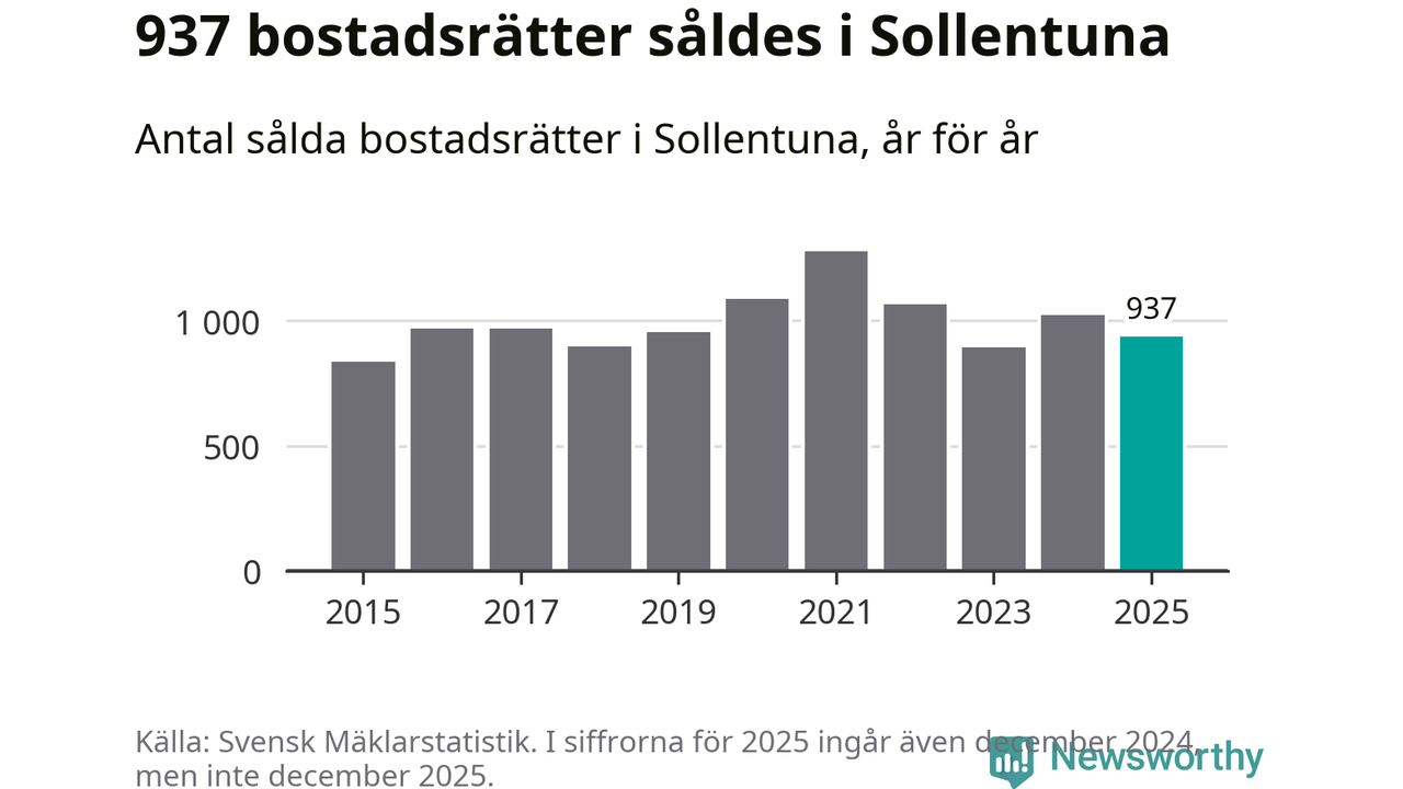 Det såldes totalt 937 bostadsrätter i Sollentuna kommun under året. Genomsnittspriset per kvadratmeter landade på 42 115 kronor. Det är en minskning med två procent i kommunen på ett år.