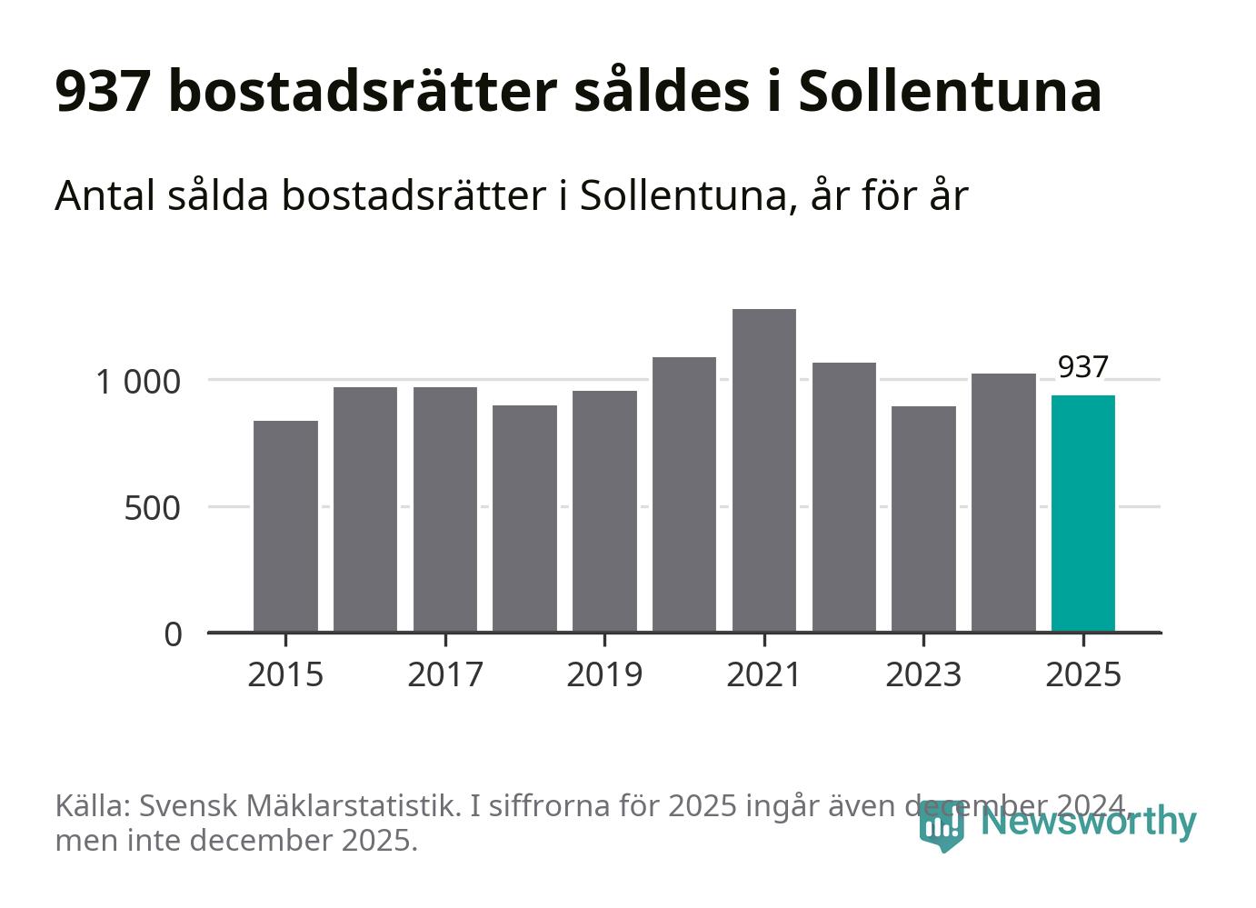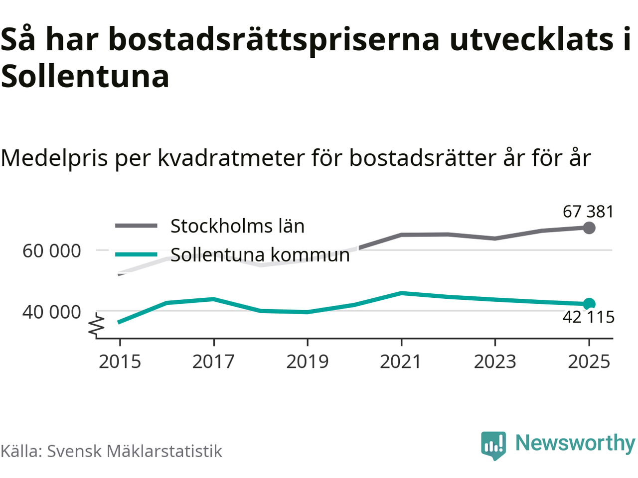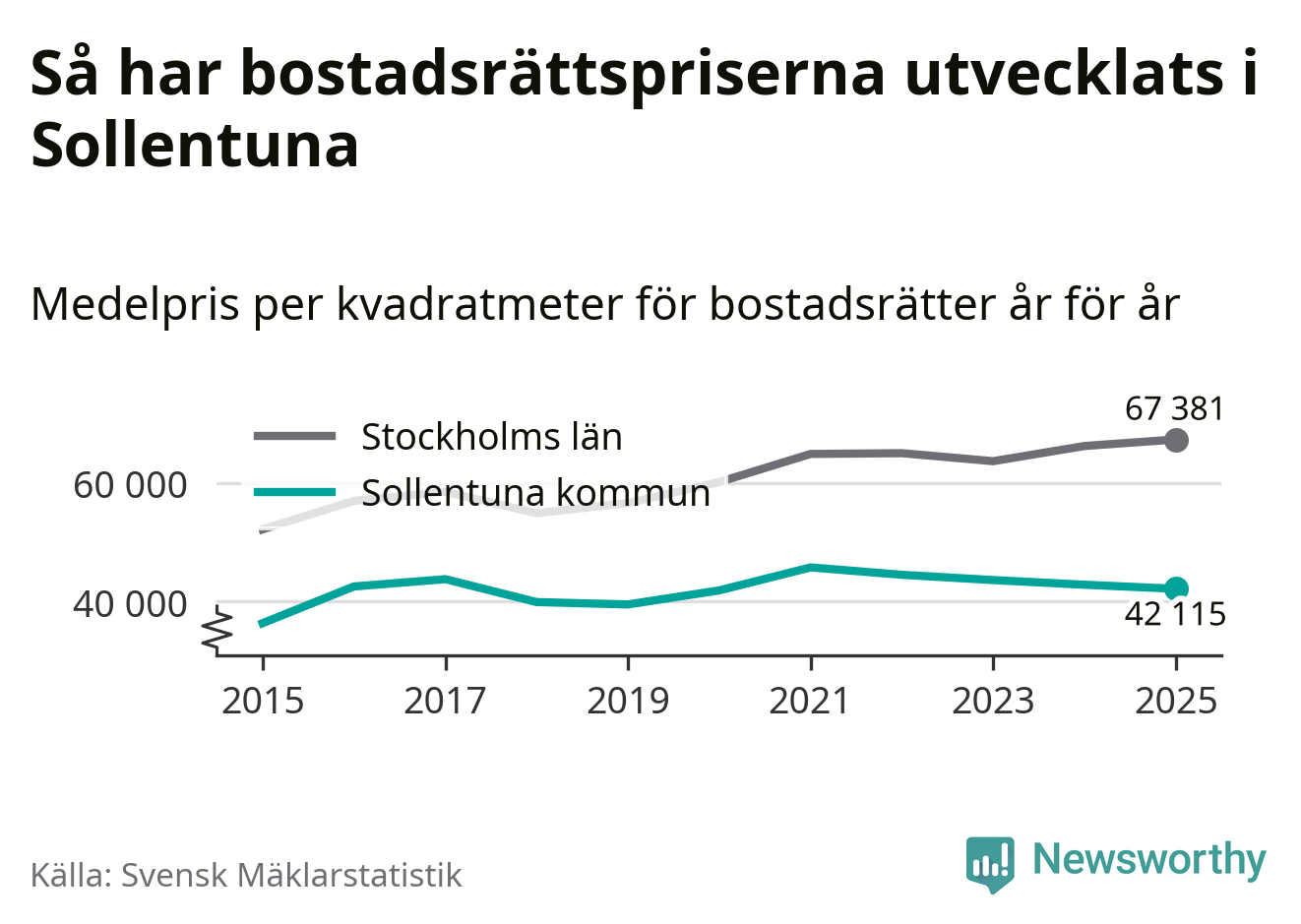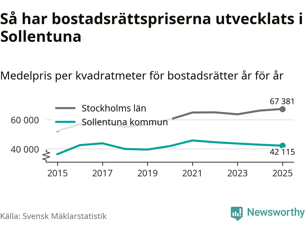 Det såldes totalt 937 bostadsrätter i Sollentuna kommun under året. Genomsnittspriset per kvadratmeter landade på 42 115 kronor. Det är en minskning med två procent i kommunen på ett år.