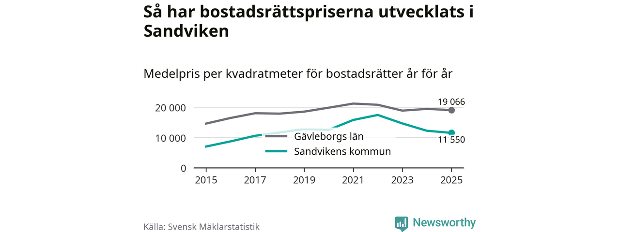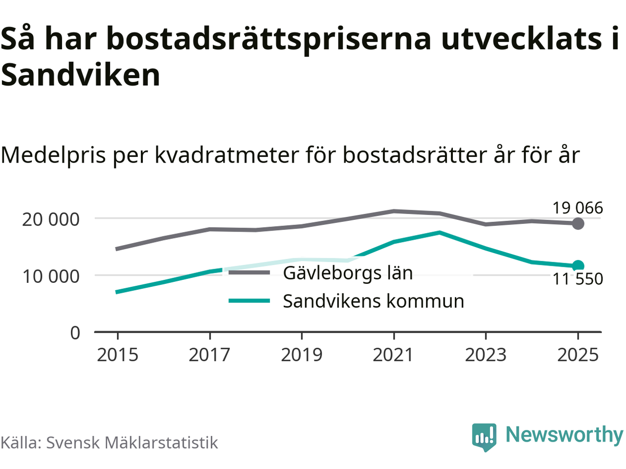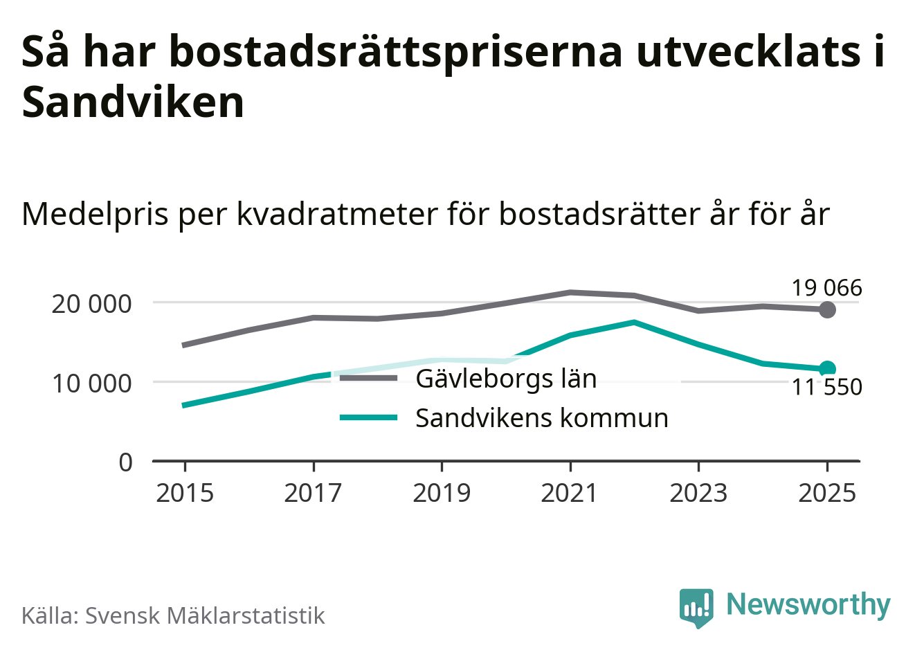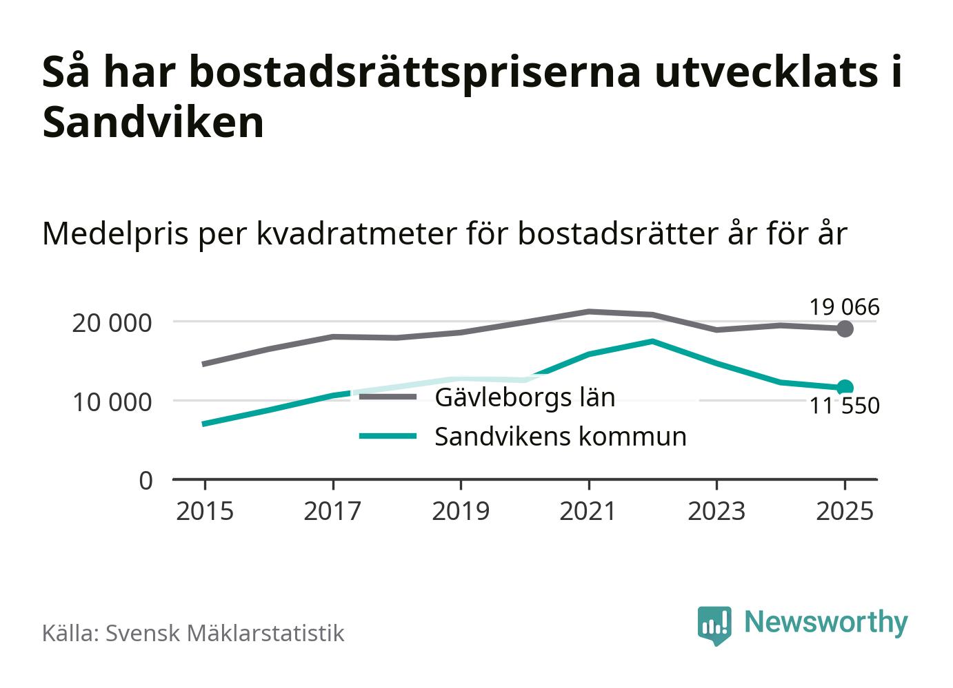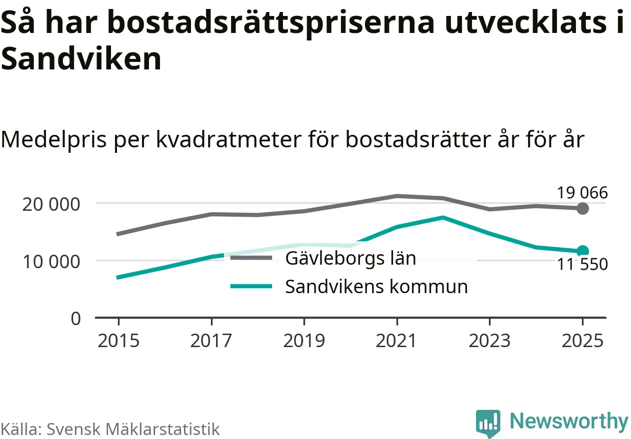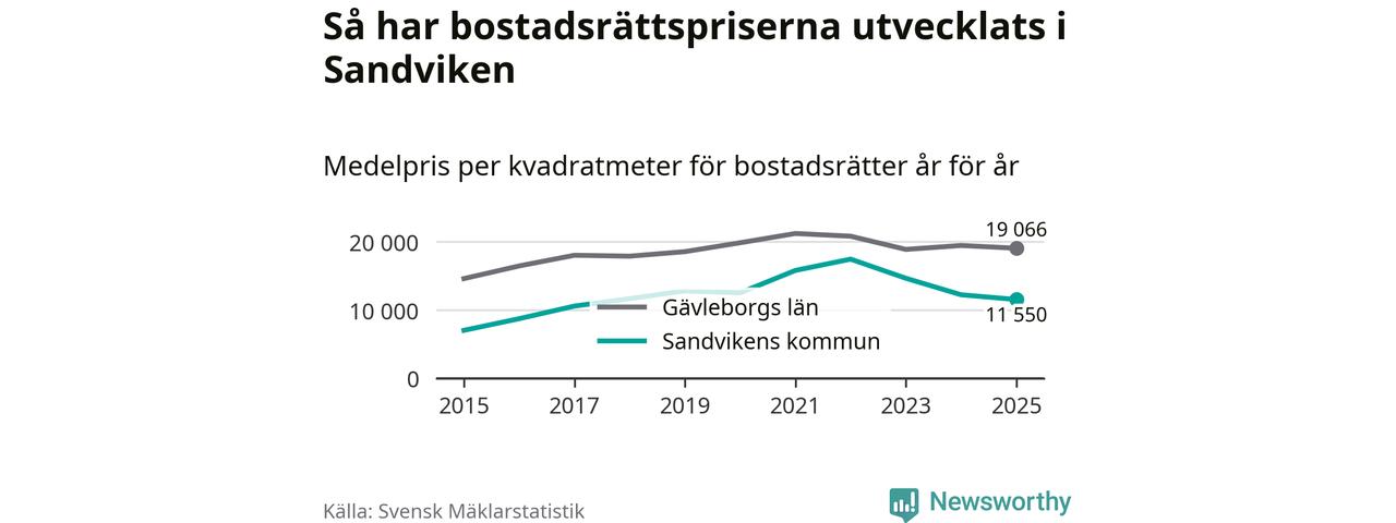 Det såldes totalt 292 bostadsrätter i Sandvikens kommun under året. Genomsnittspriset per kvadratmeter landade på 11 550 kronor. Det är en minskning med sex procent i kommunen på ett år.
