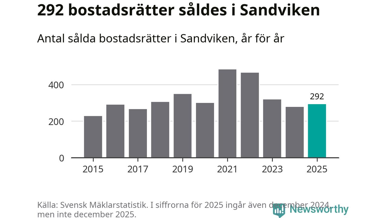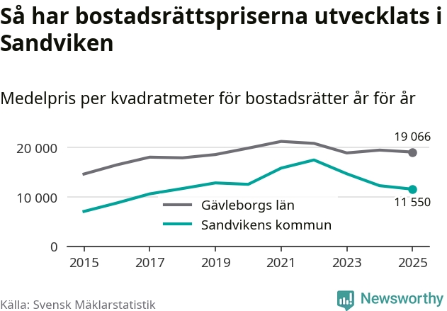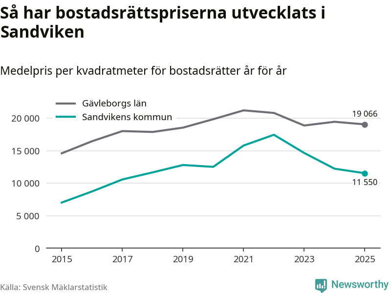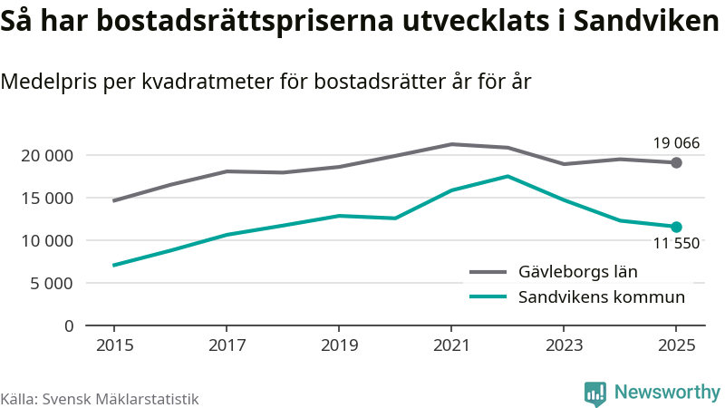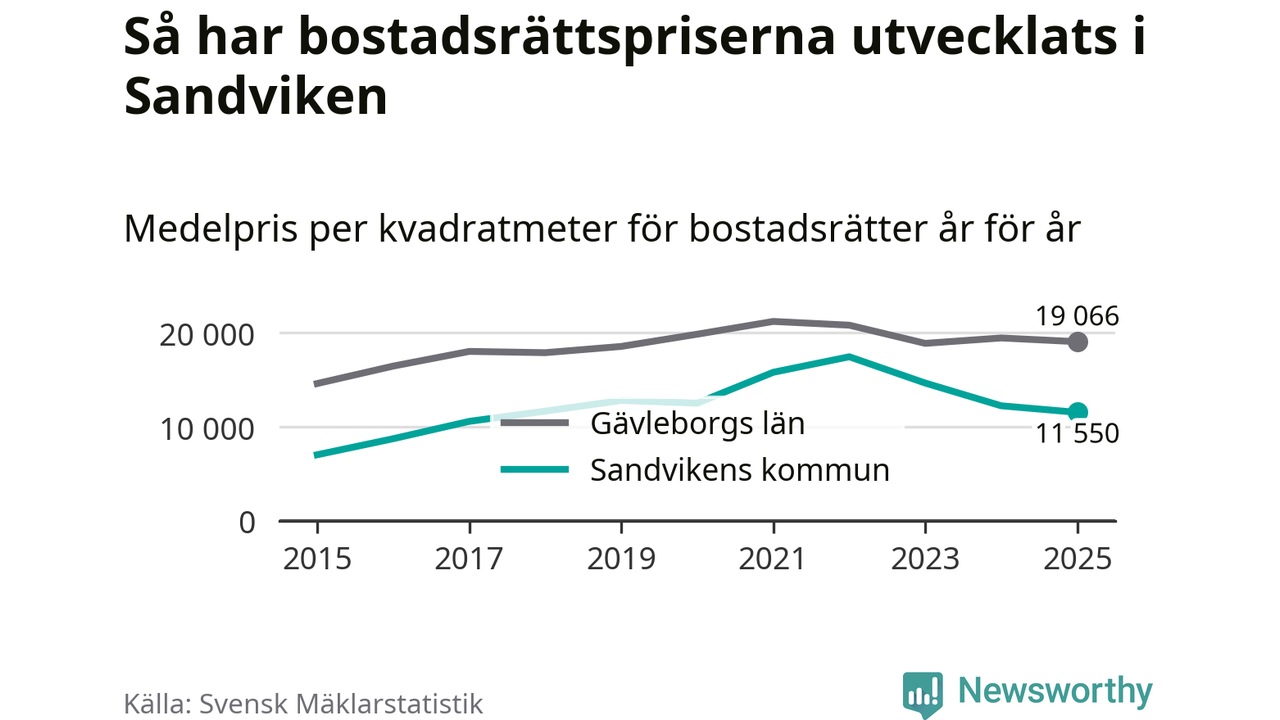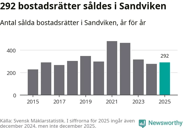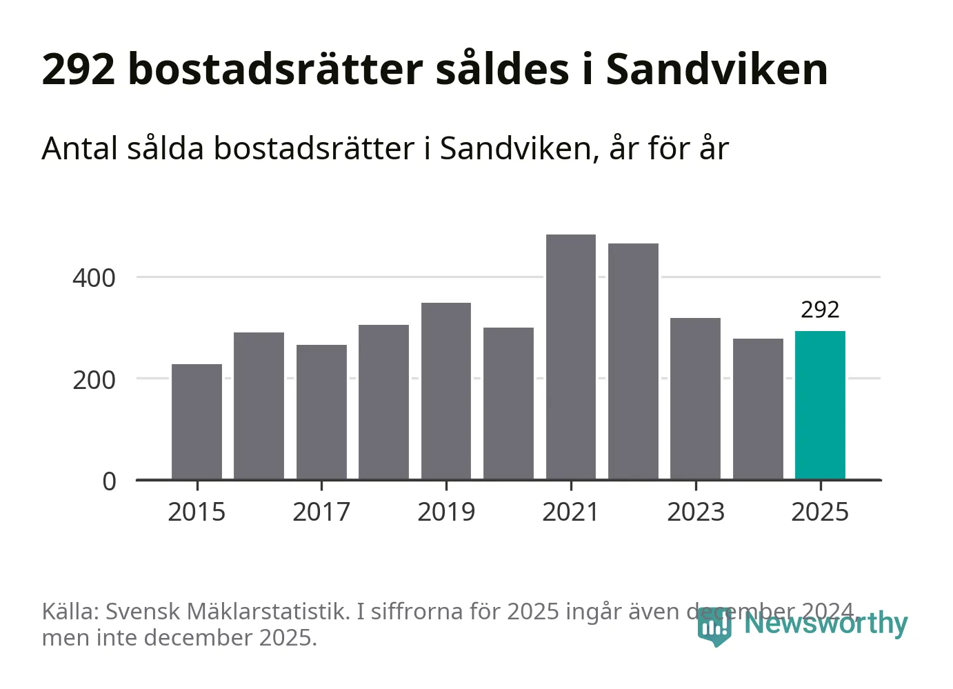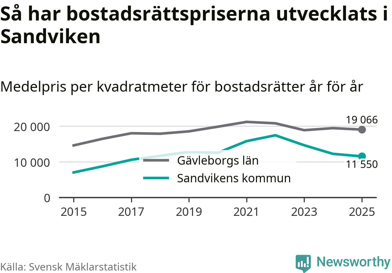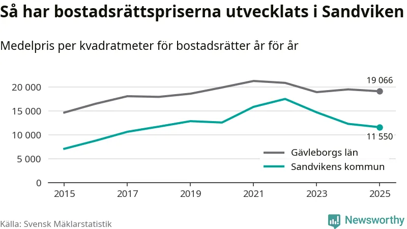 Det såldes totalt 292 bostadsrätter i Sandvikens kommun under året. Genomsnittspriset per kvadratmeter landade på 11 550 kronor. Det är en minskning med sex procent i kommunen på ett år.