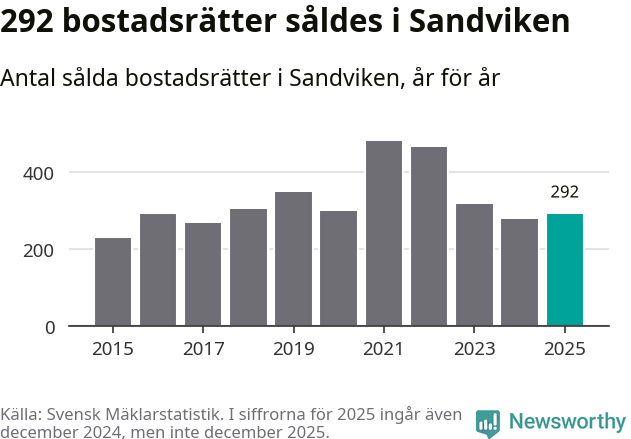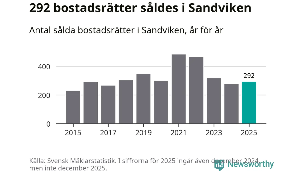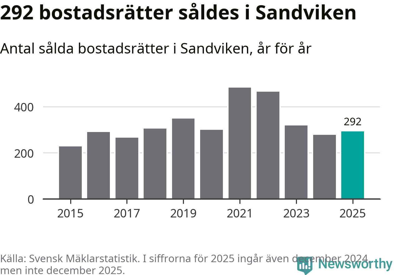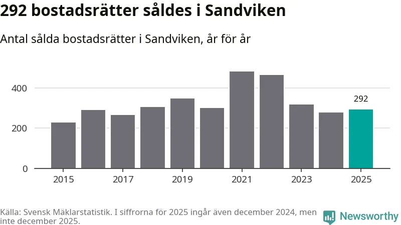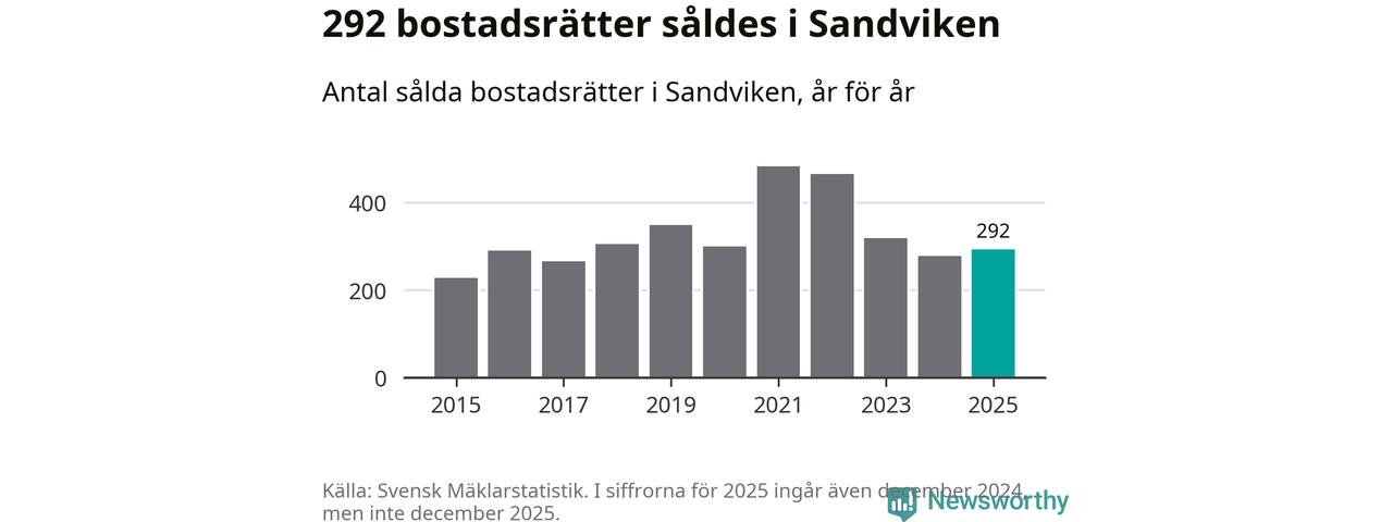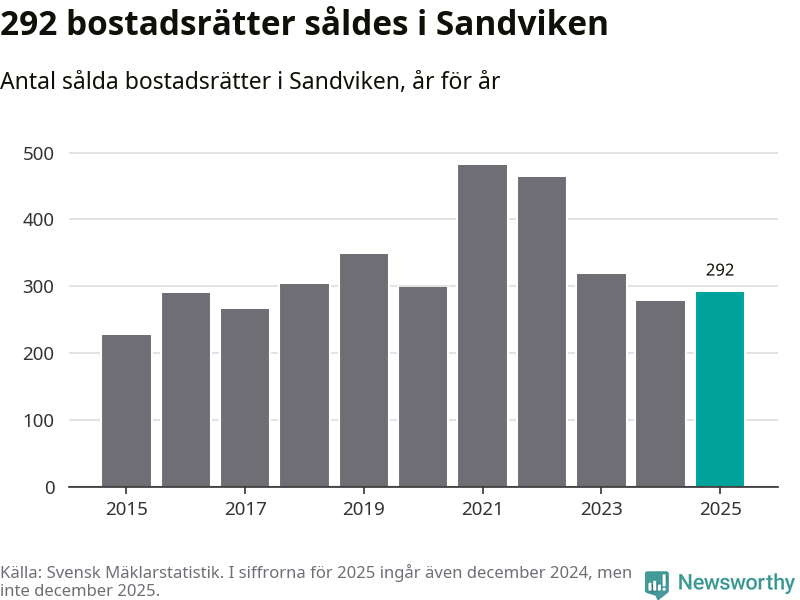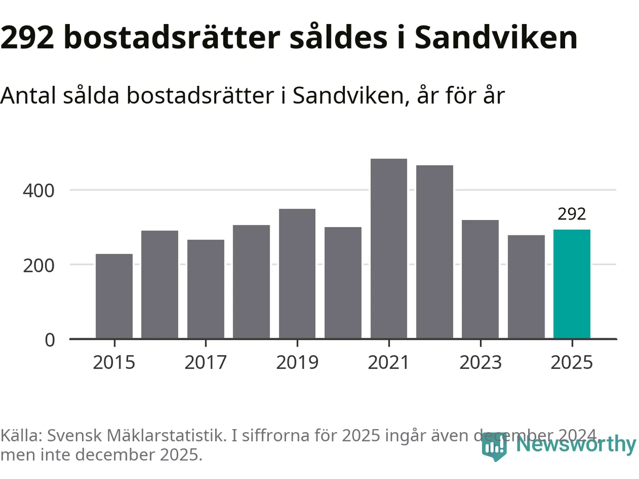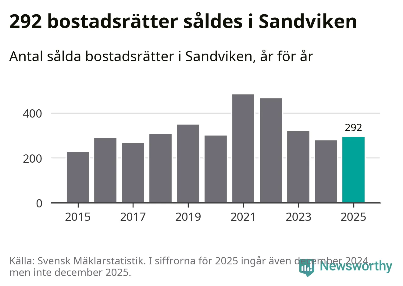 Det såldes totalt 292 bostadsrätter i Sandvikens kommun under året. Genomsnittspriset per kvadratmeter landade på 11 550 kronor. Det är en minskning med sex procent i kommunen på ett år.