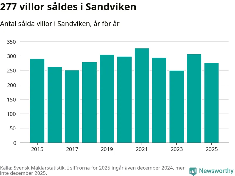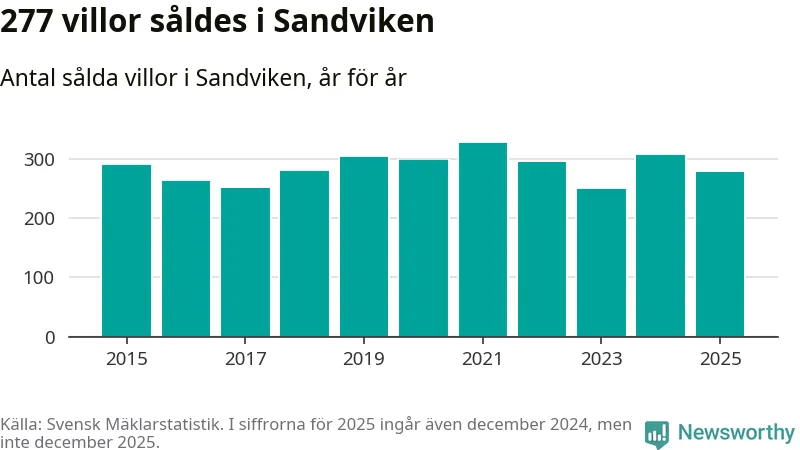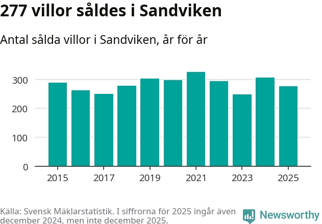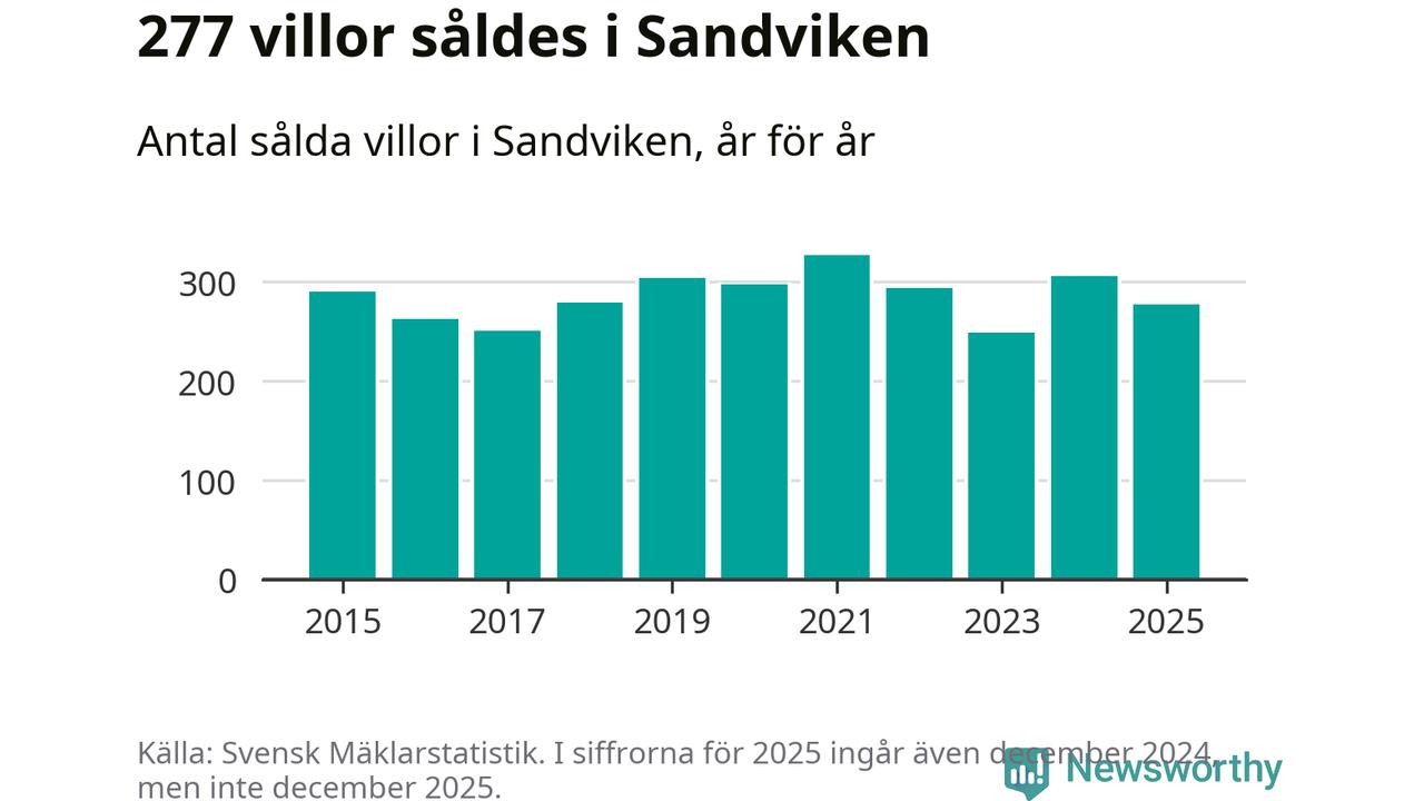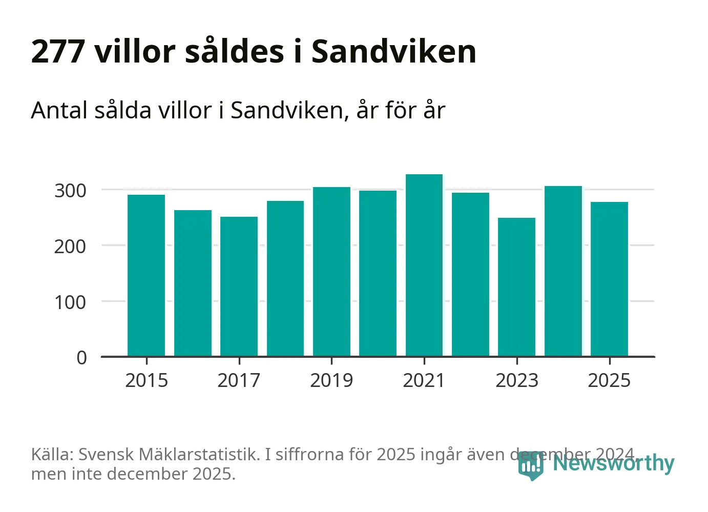 Däremot minskade antalet sålda villor. Totalt såldes 277 villor, att jämföra med 306 under 2024.