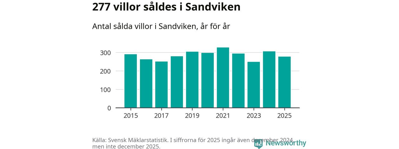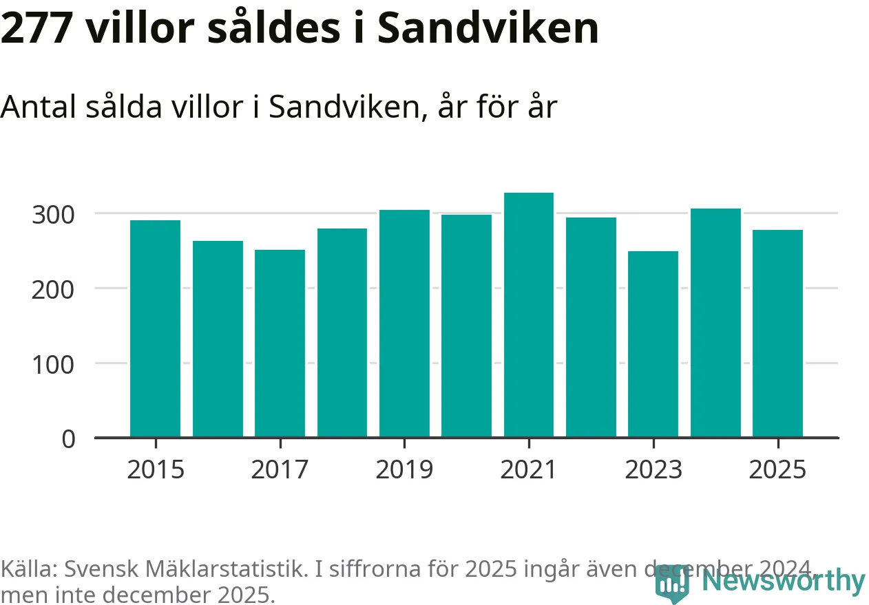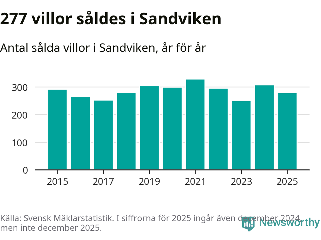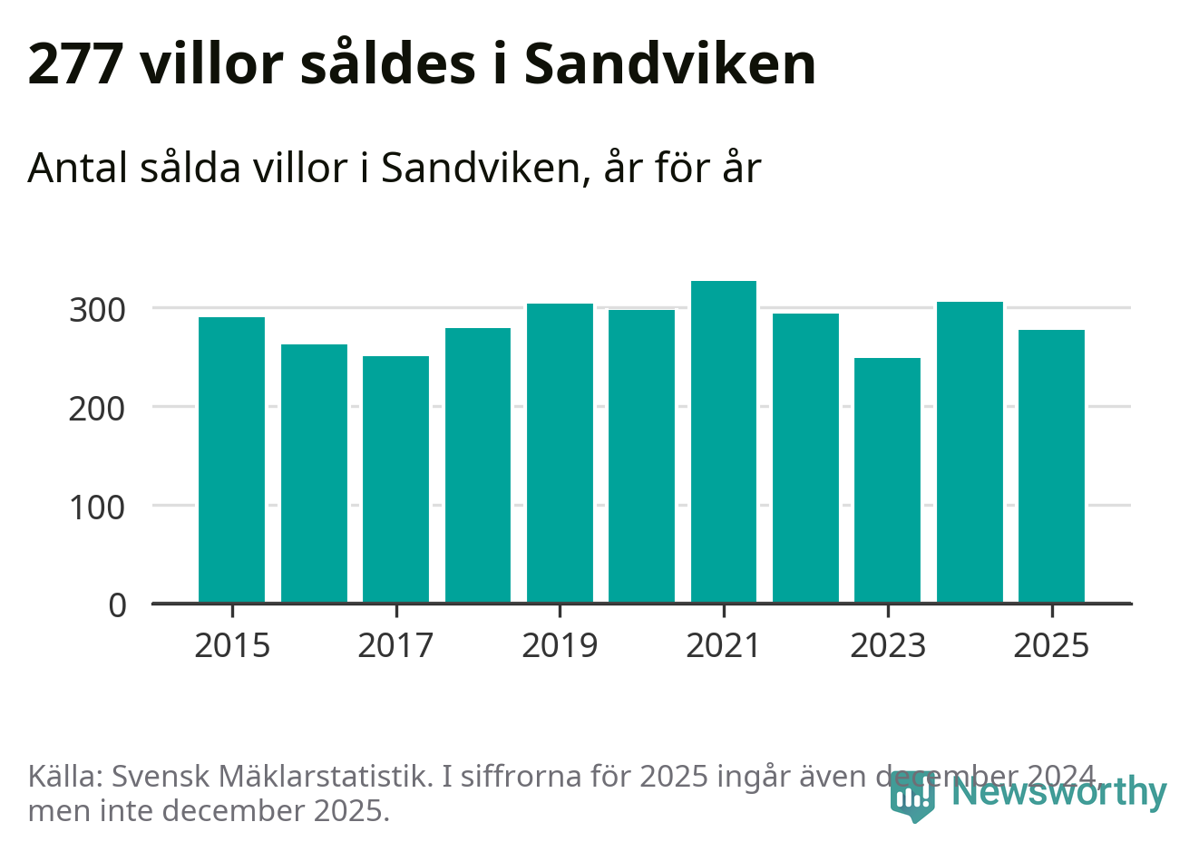 Däremot minskade antalet sålda villor. Totalt såldes 277 villor, att jämföra med 306 under 2024.