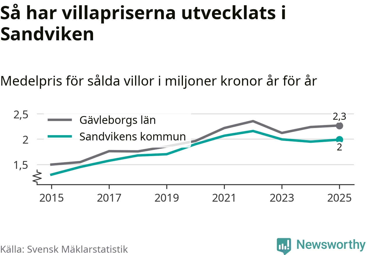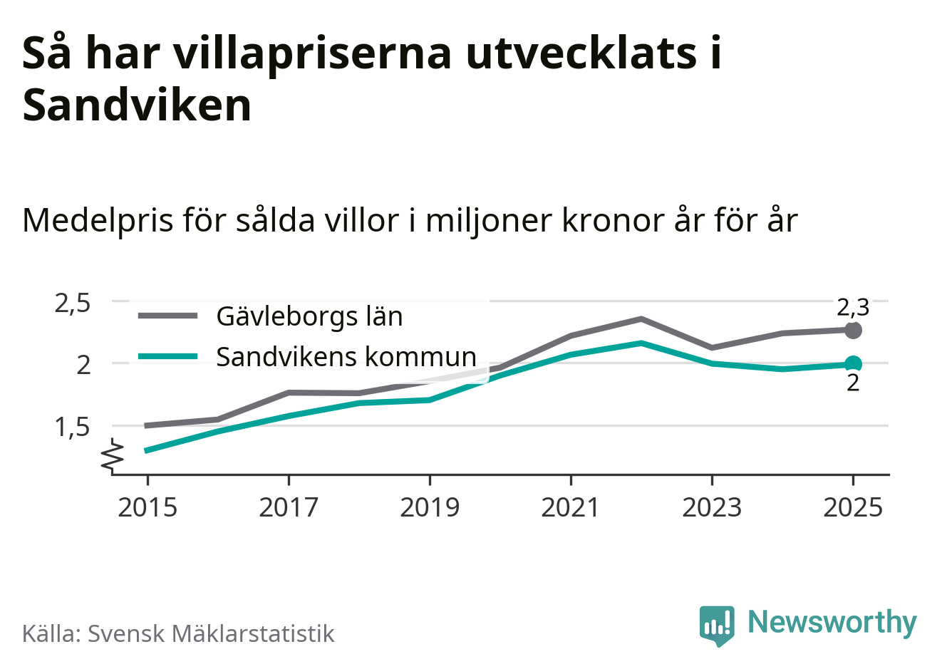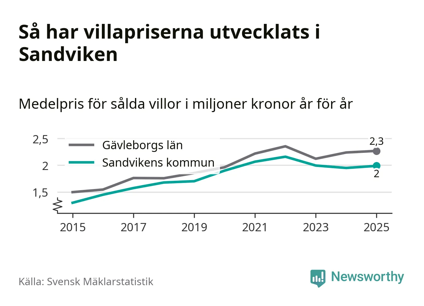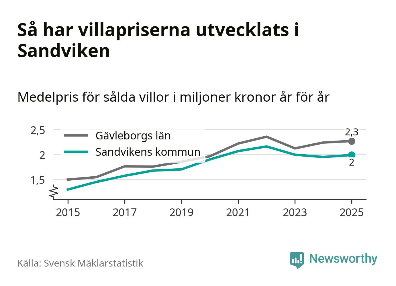 Två miljoner kronor är medelpriset för de villor som såldes i Sandvikens kommun under året, eller 17 426 kronor per kvadratmeter. Det innebär en prisökning med två procent på ett år.