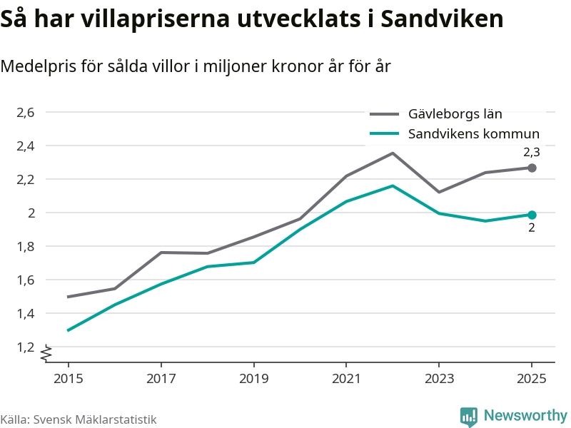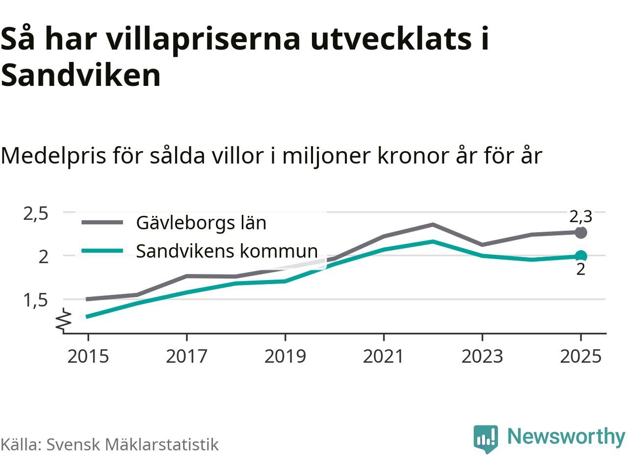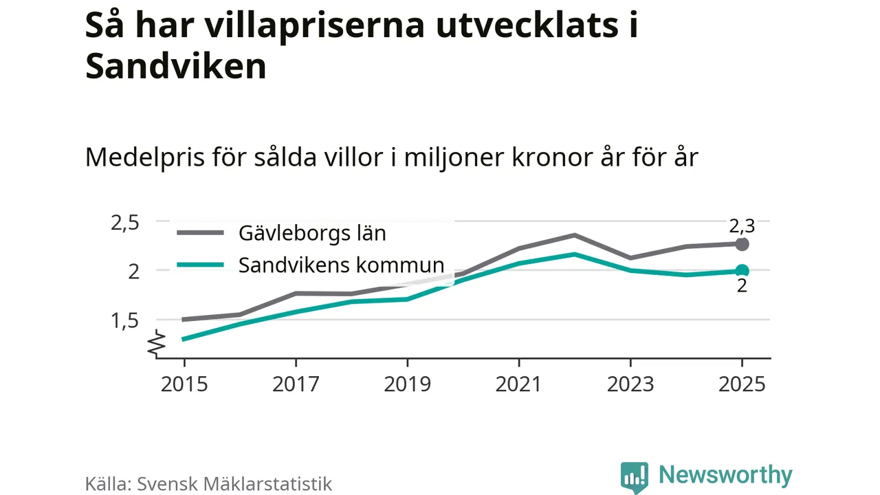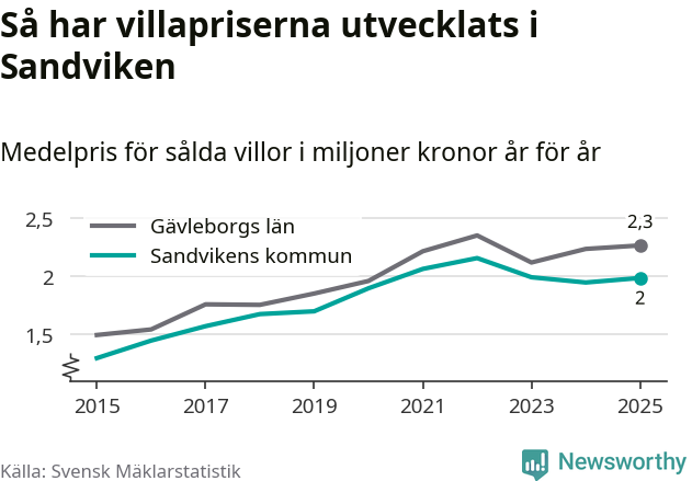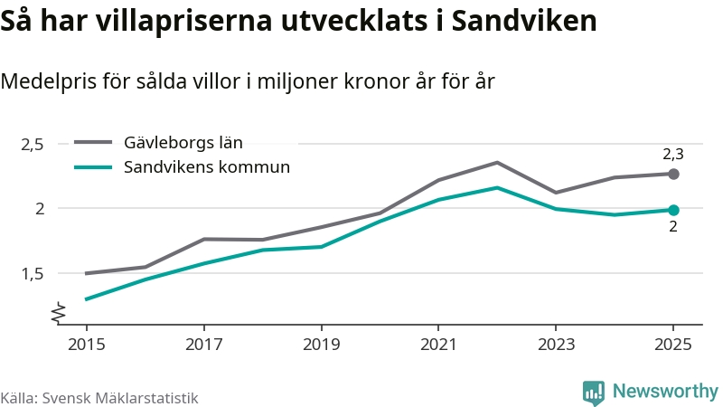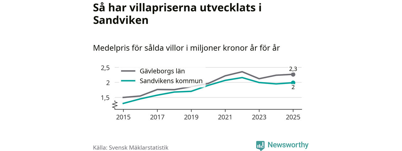 Två miljoner kronor är medelpriset för de villor som såldes i Sandvikens kommun under året, eller 17 426 kronor per kvadratmeter. Det innebär en prisökning med två procent på ett år.