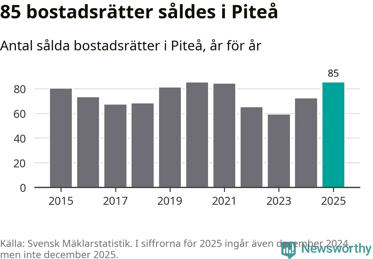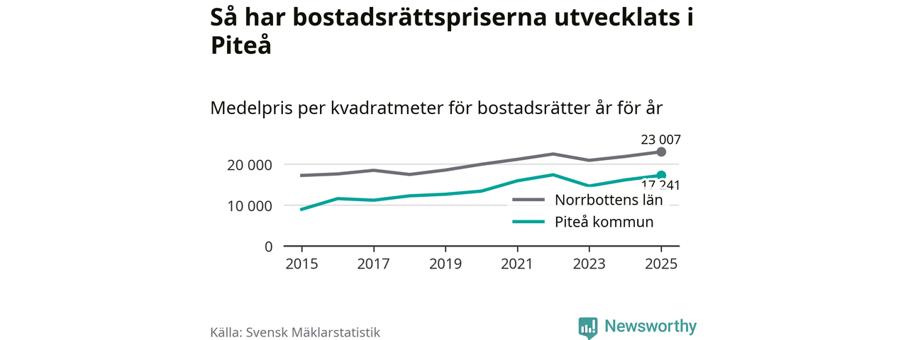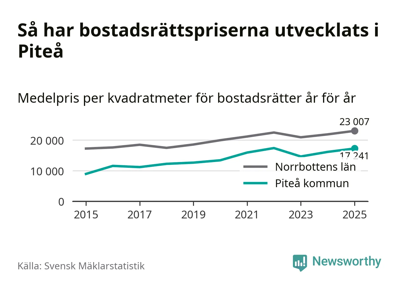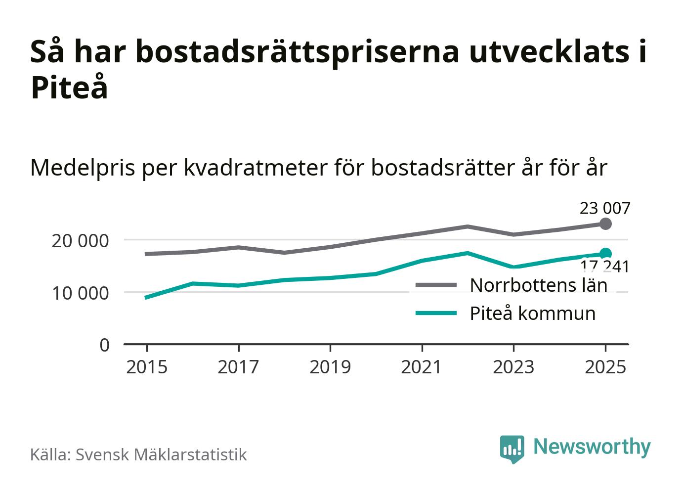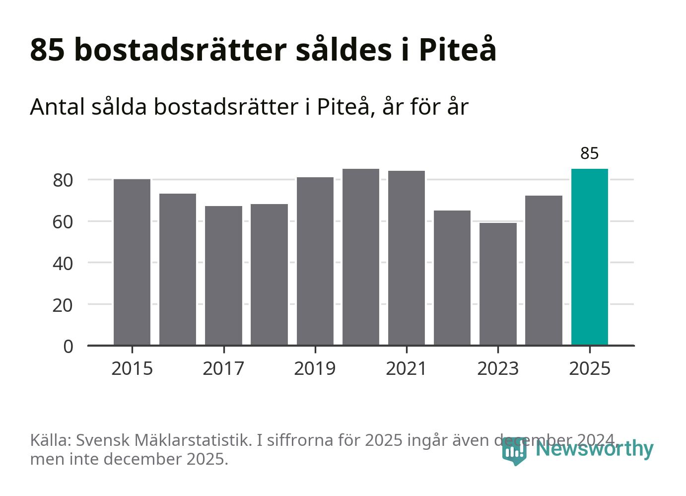 Det såldes totalt 85 bostadsrätter i Piteå kommun under året. Genomsnittspriset per kvadratmeter landade på 17 241 kronor. Det är en ökning med sju procent i kommunen på ett år.