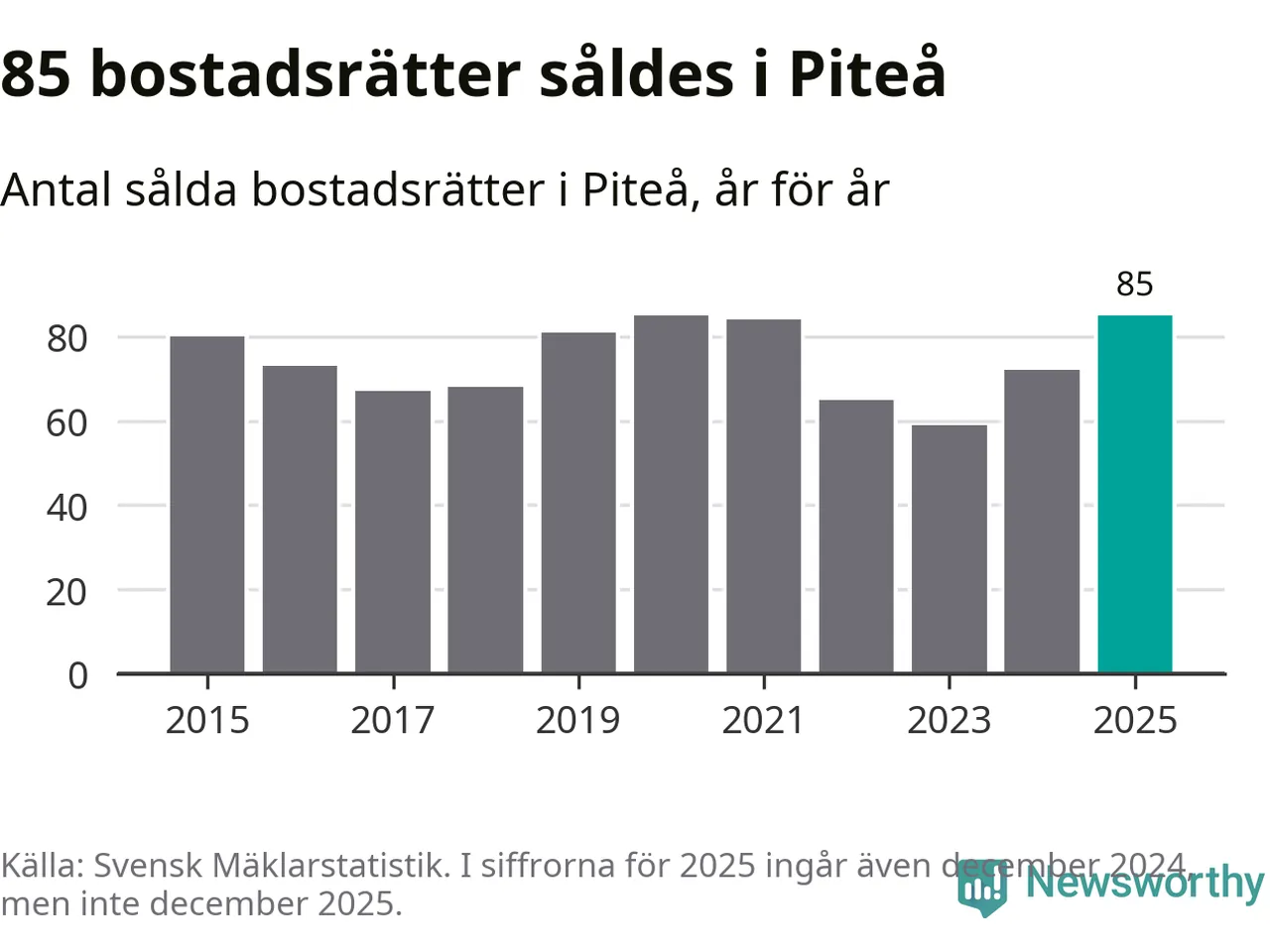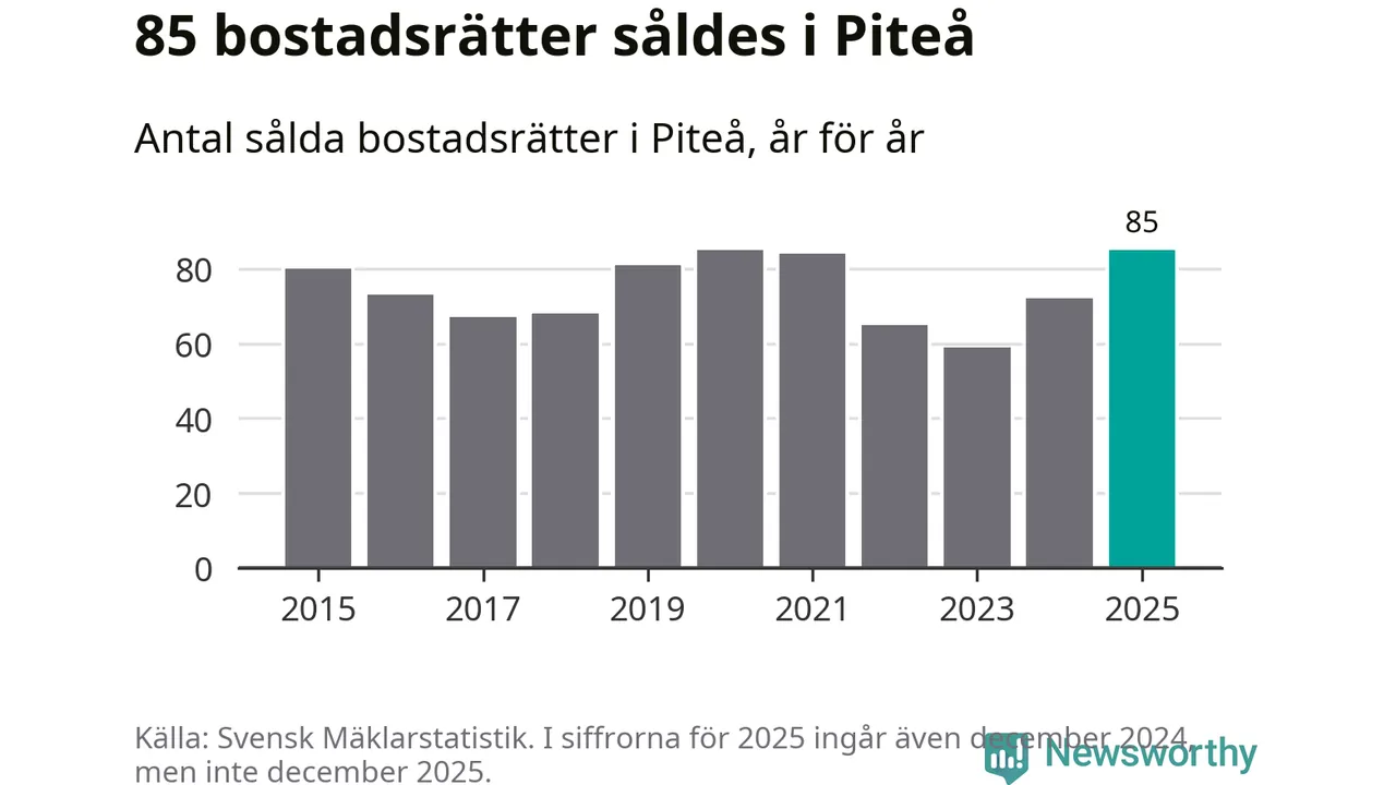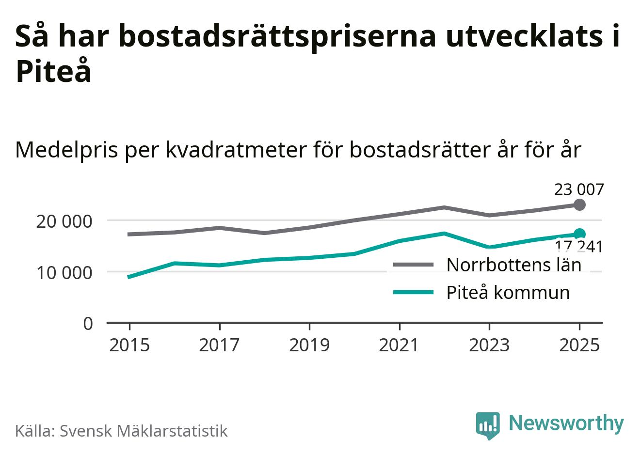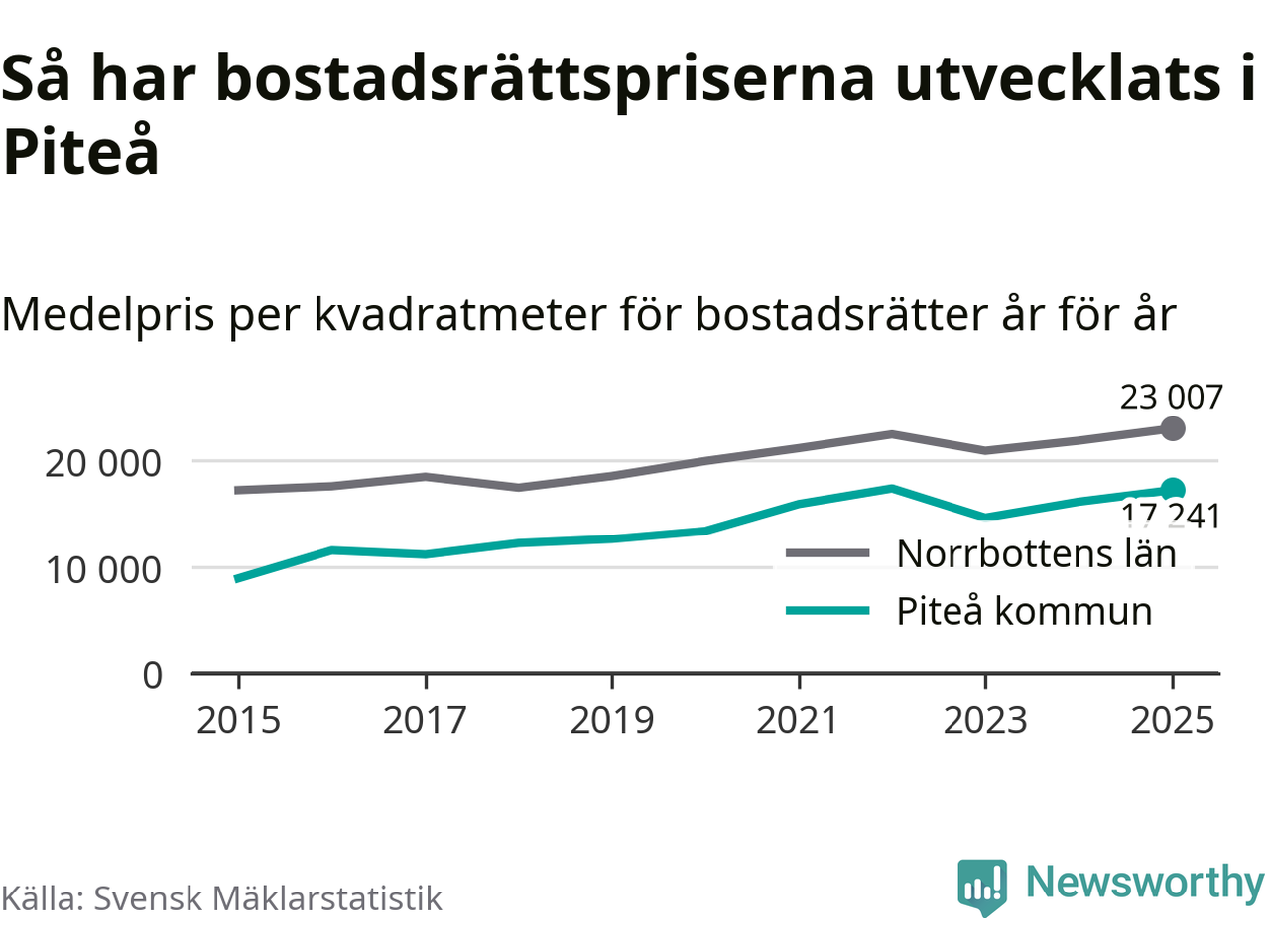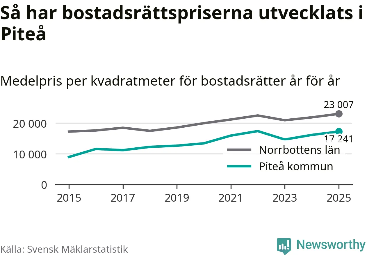 Det såldes totalt 85 bostadsrätter i Piteå kommun under året. Genomsnittspriset per kvadratmeter landade på 17 241 kronor. Det är en ökning med sju procent i kommunen på ett år.