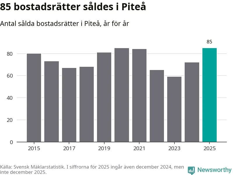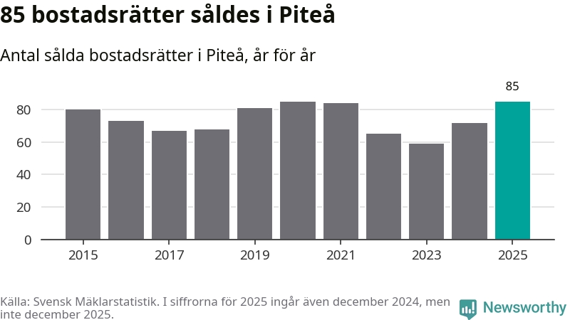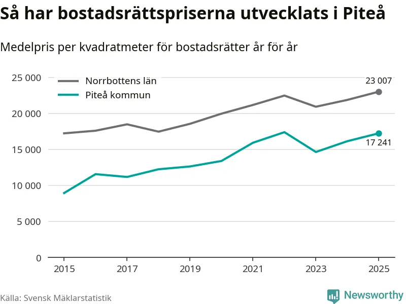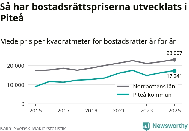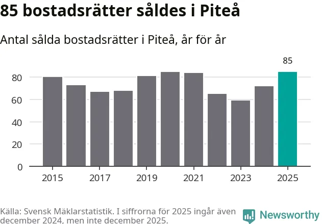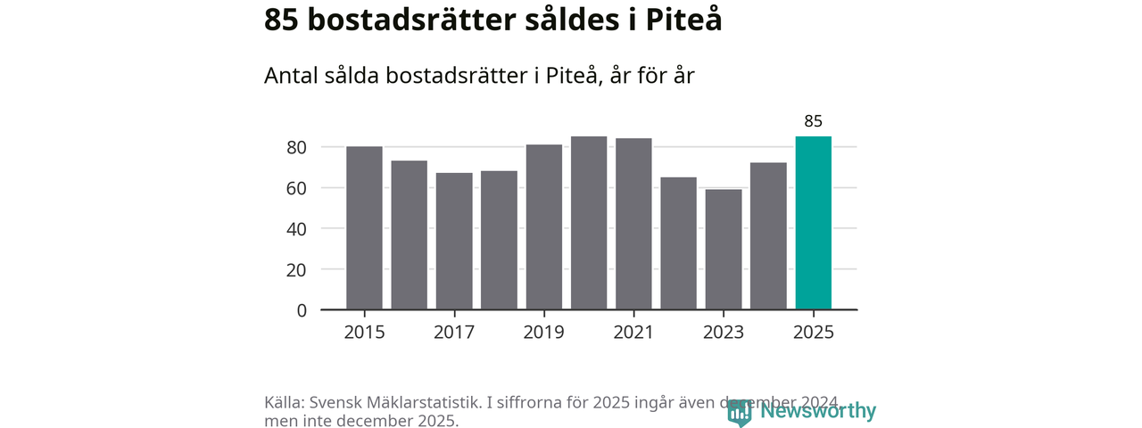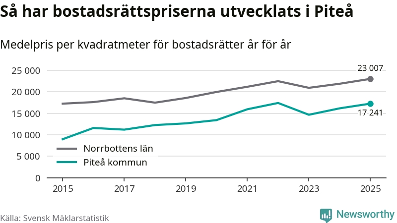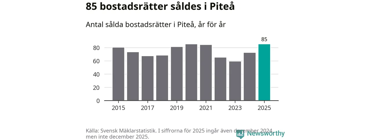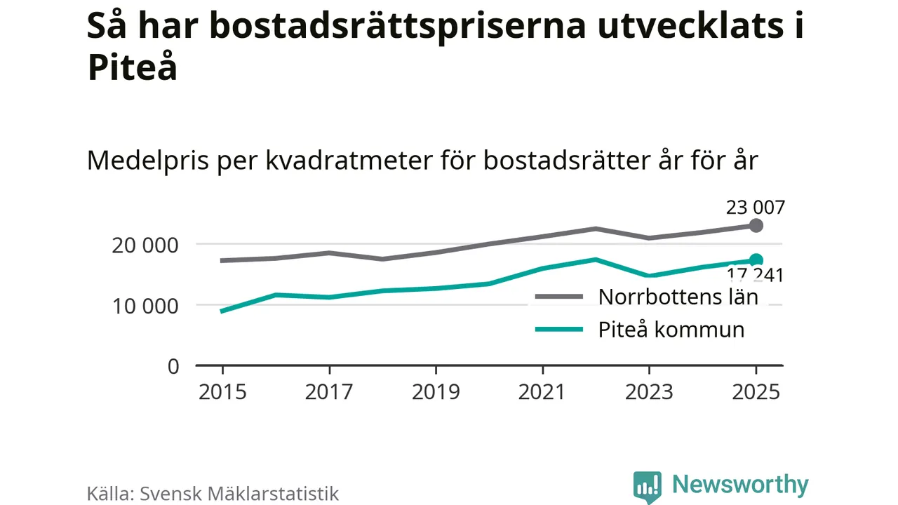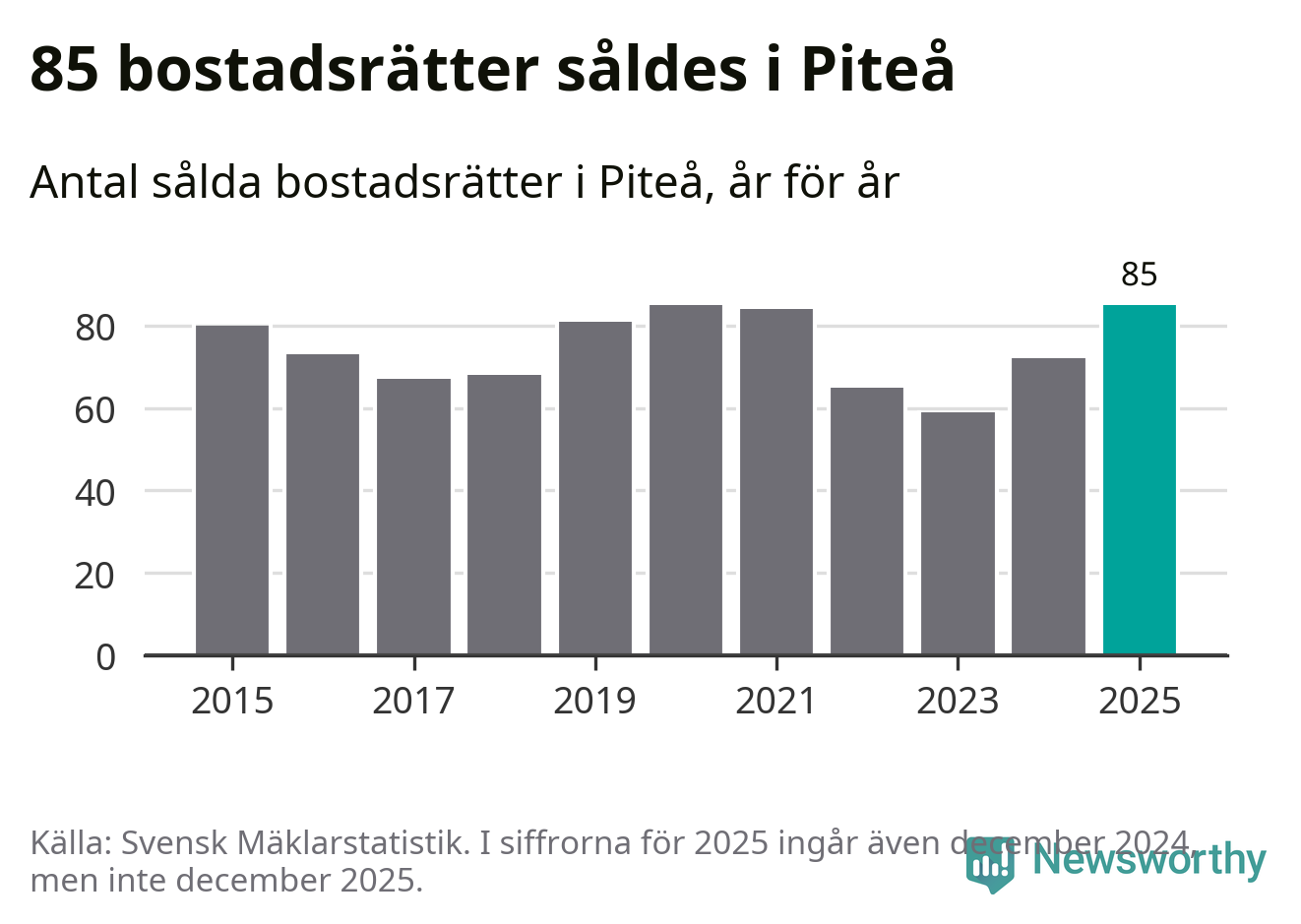 Det såldes totalt 85 bostadsrätter i Piteå kommun under året. Genomsnittspriset per kvadratmeter landade på 17 241 kronor. Det är en ökning med sju procent i kommunen på ett år.