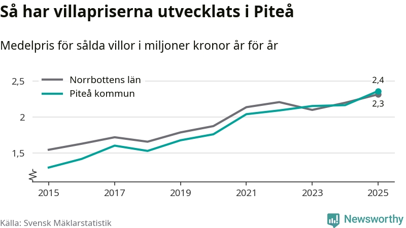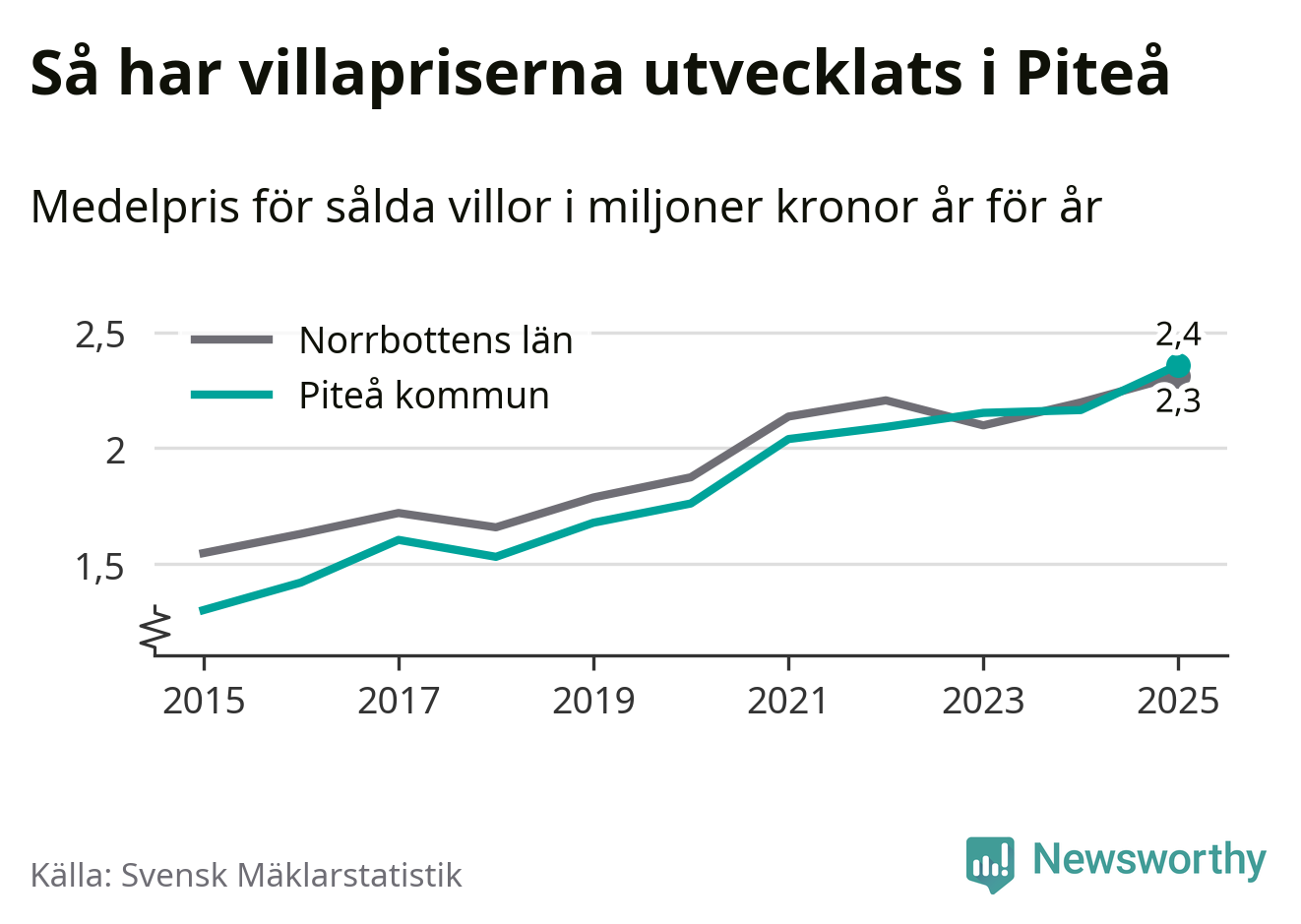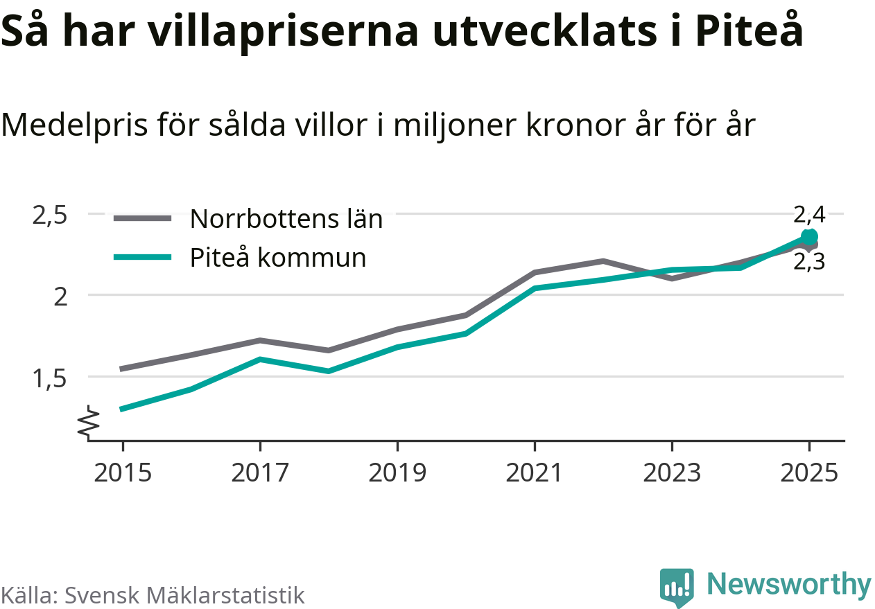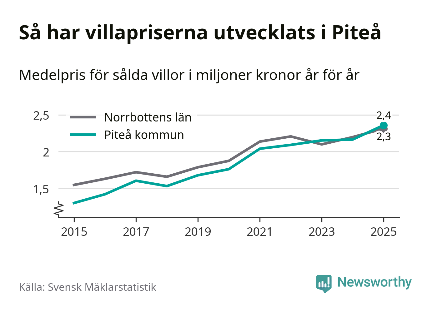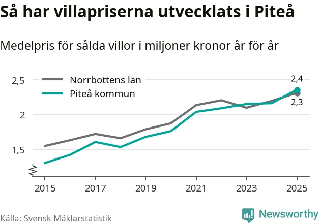 2,4 miljoner kronor är medelpriset för de villor som såldes i Piteå kommun under året, eller 19 336 kronor per kvadratmeter. Det innebär en prisökning med nio procent på ett år. Det är det högsta årssnittet på åtminstone tio år.
