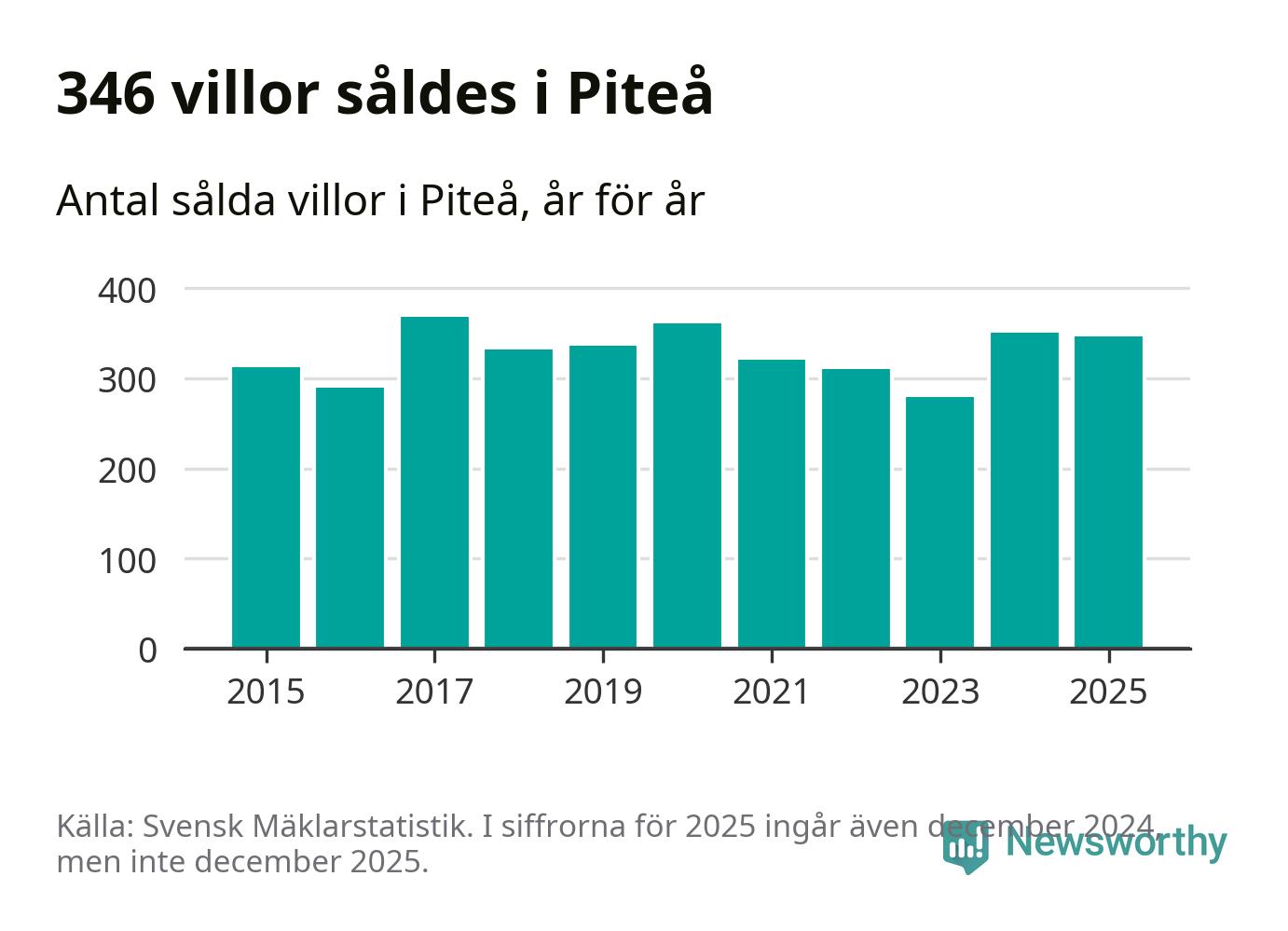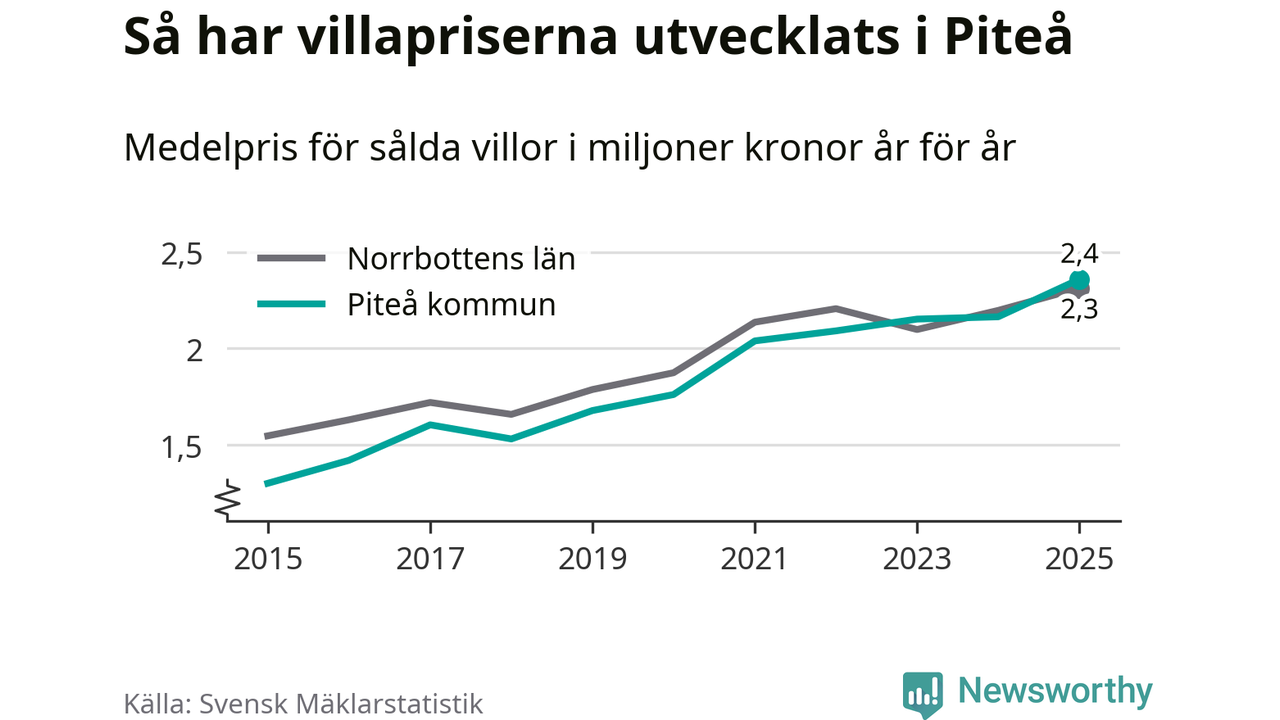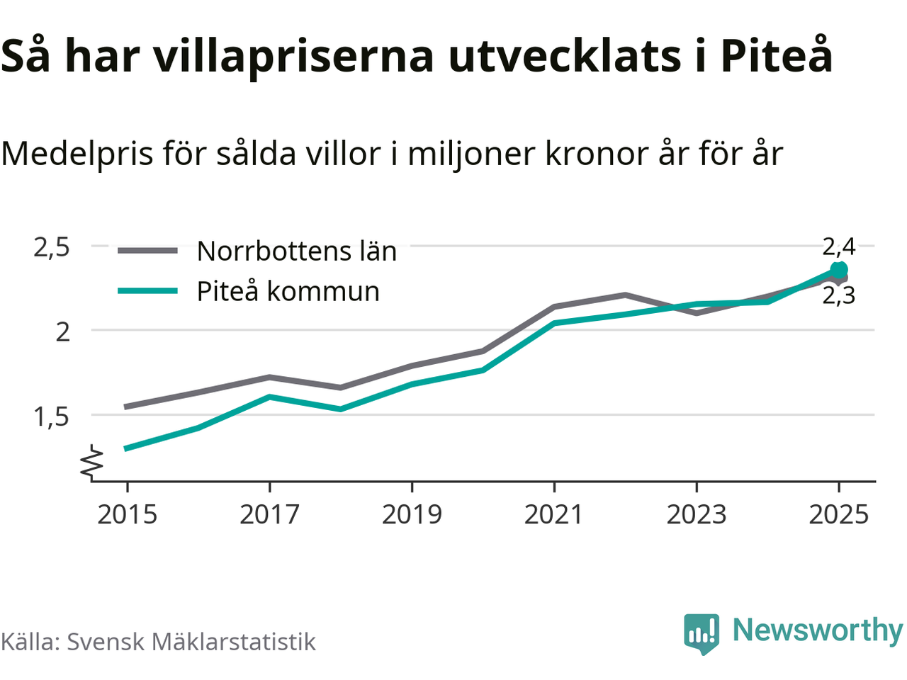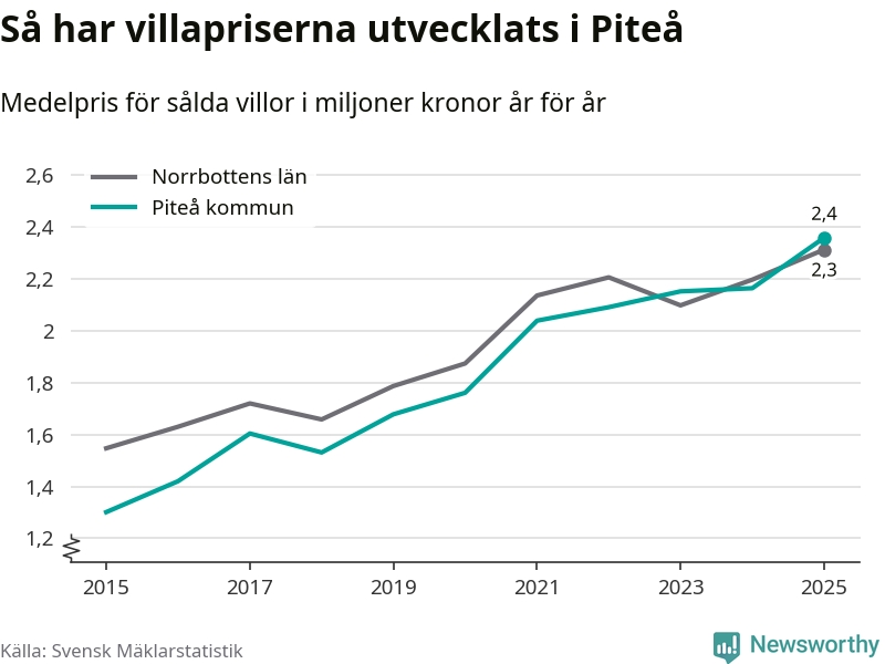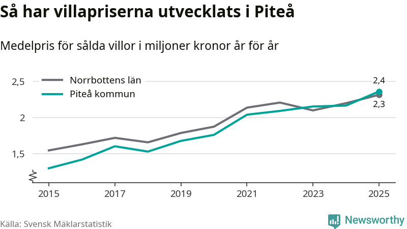 2,4 miljoner kronor är medelpriset för de villor som såldes i Piteå kommun under året, eller 19 336 kronor per kvadratmeter. Det innebär en prisökning med nio procent på ett år. Det är det högsta årssnittet på åtminstone tio år.