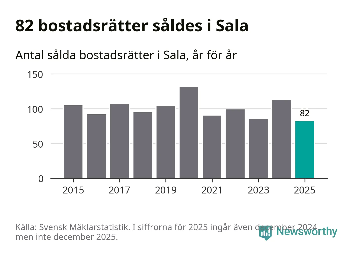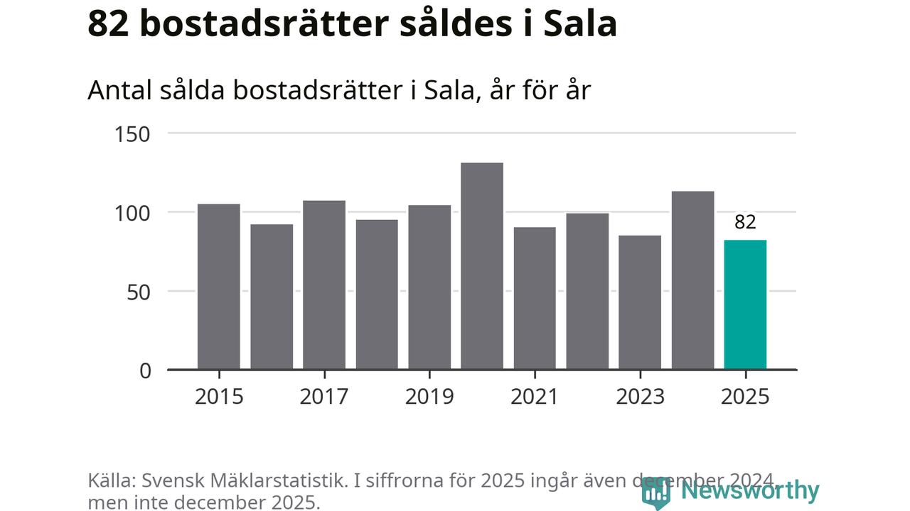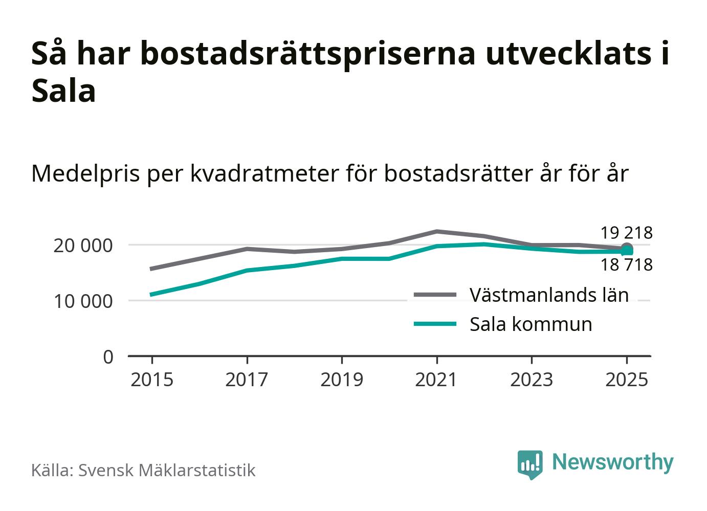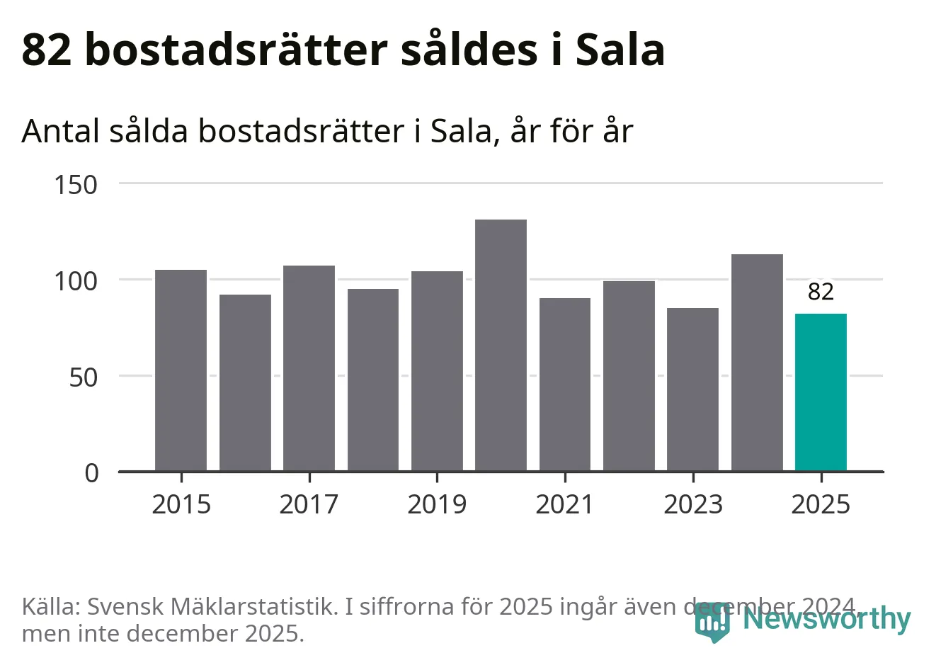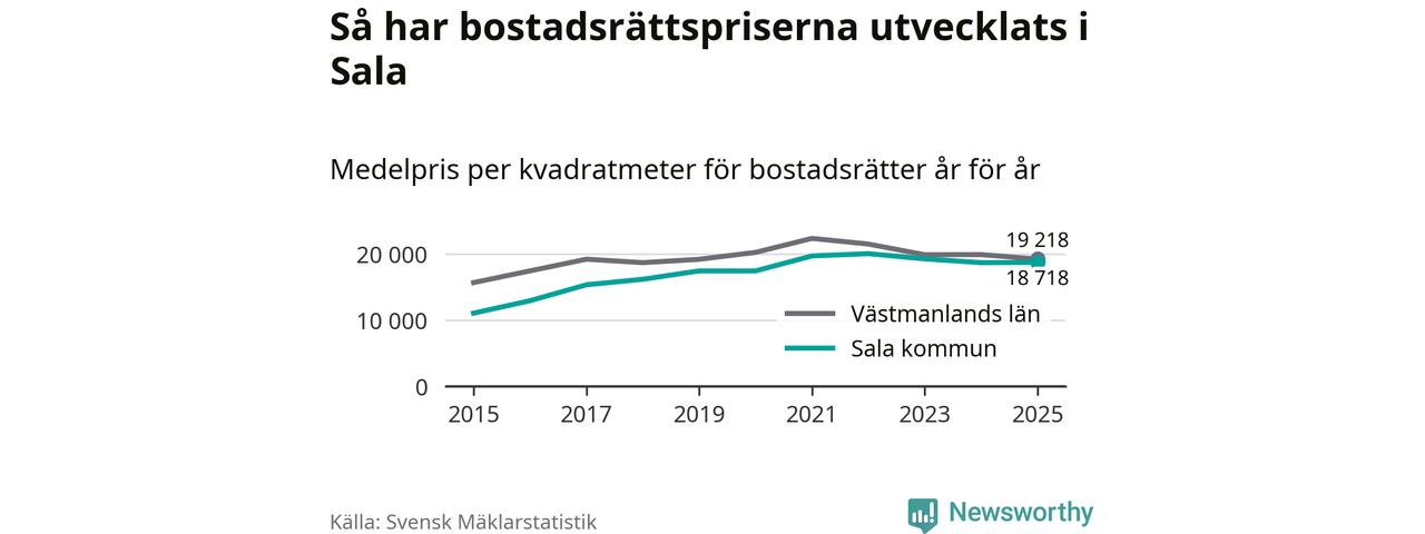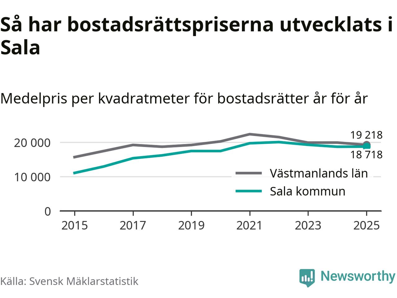 Det såldes totalt 82 bostadsrätter i Sala kommun under året. Det är färre än något annat år sedan 2015. Genomsnittspriset per kvadratmeter landade på 18 718 kronor, vilket är ungefär samma nivå som förra året.