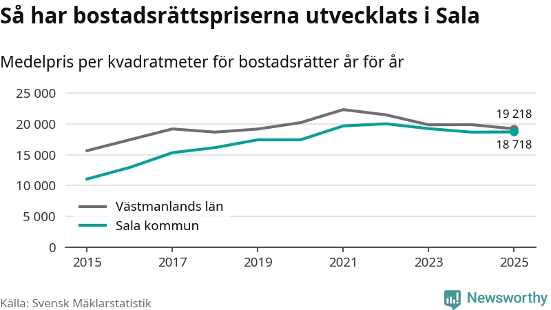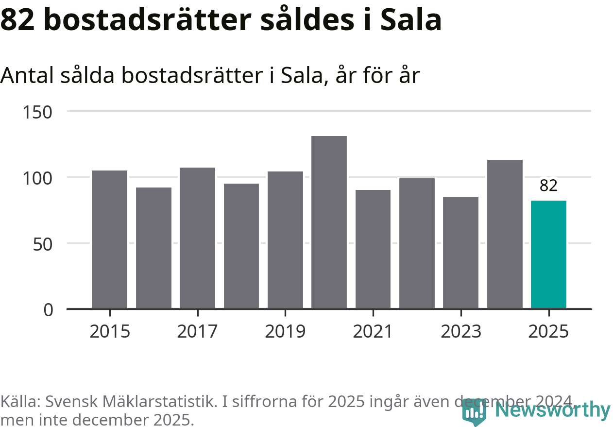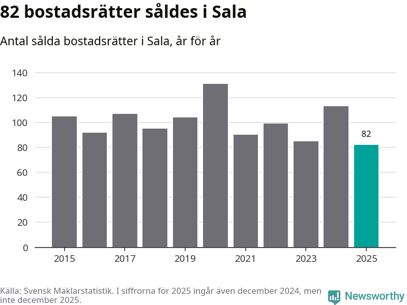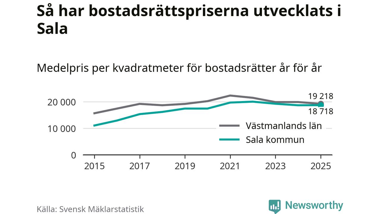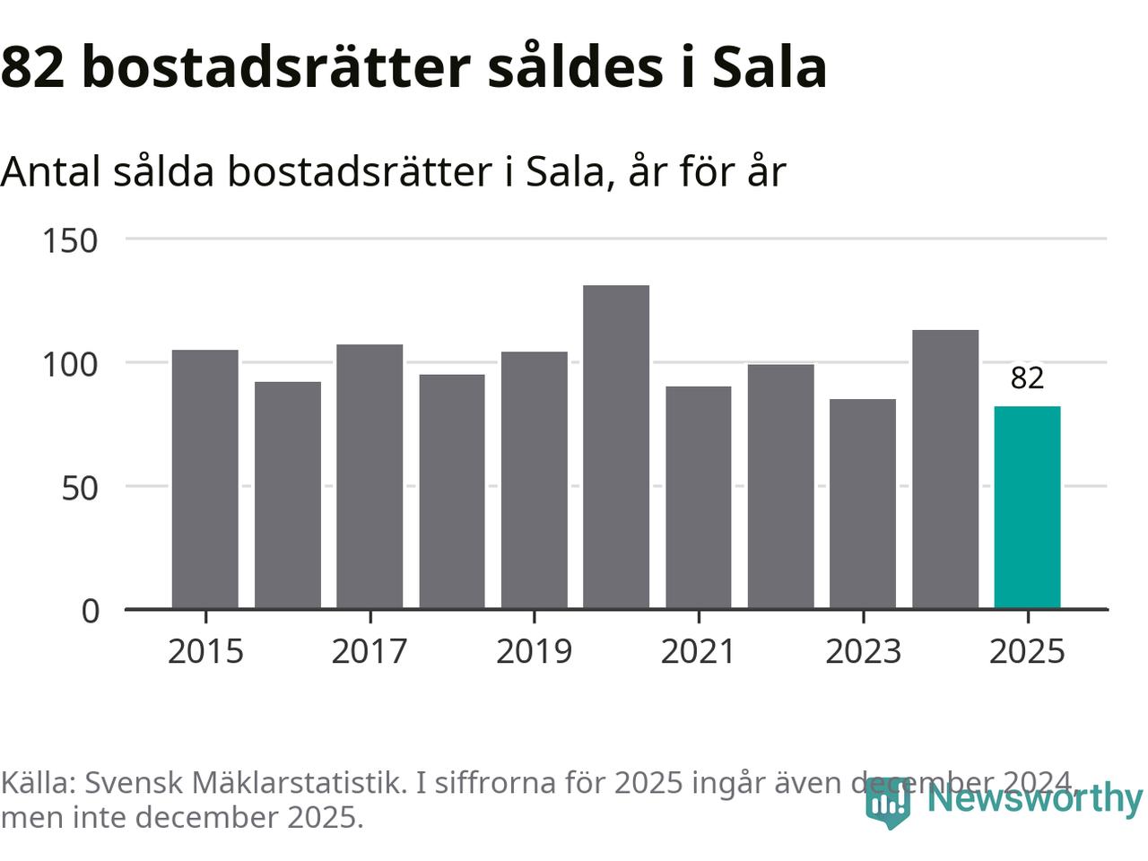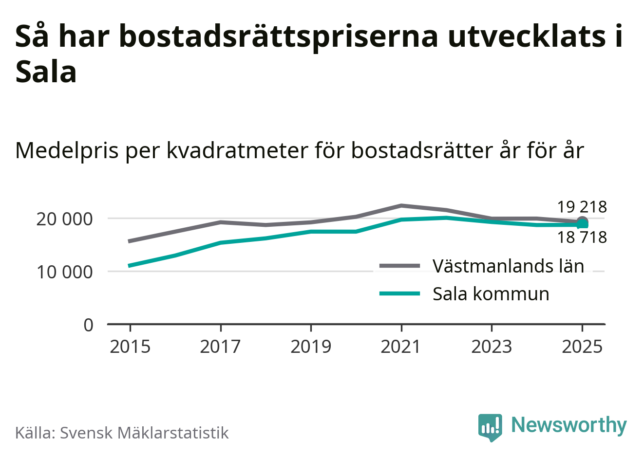 Det såldes totalt 82 bostadsrätter i Sala kommun under året. Det är färre än något annat år sedan 2015. Genomsnittspriset per kvadratmeter landade på 18 718 kronor, vilket är ungefär samma nivå som förra året.