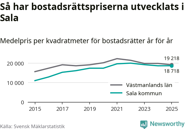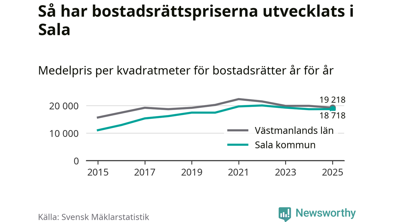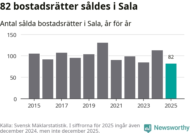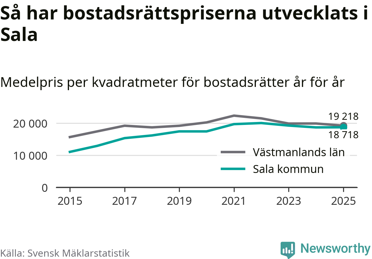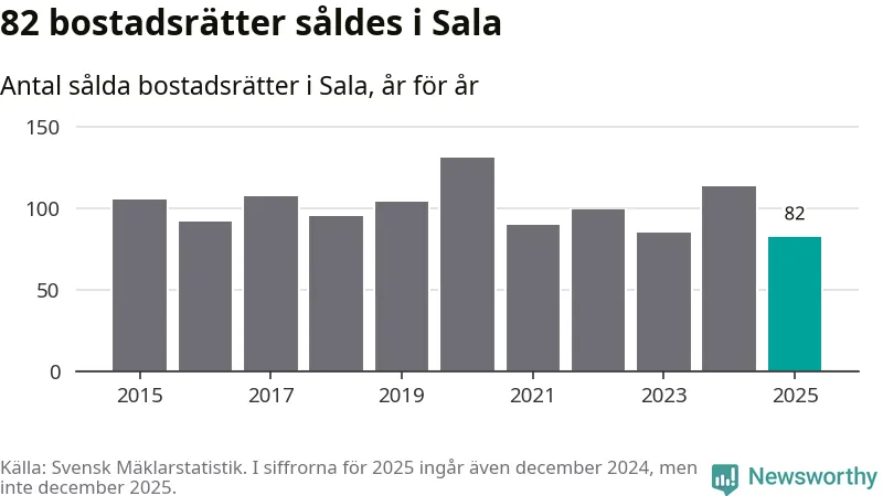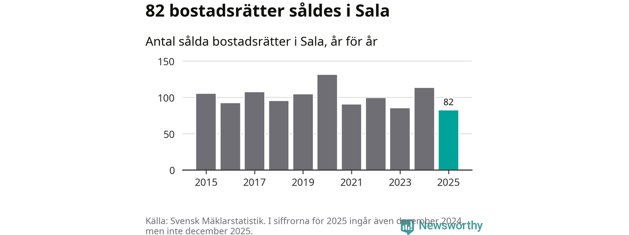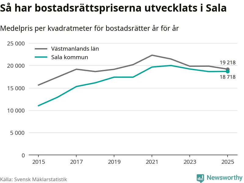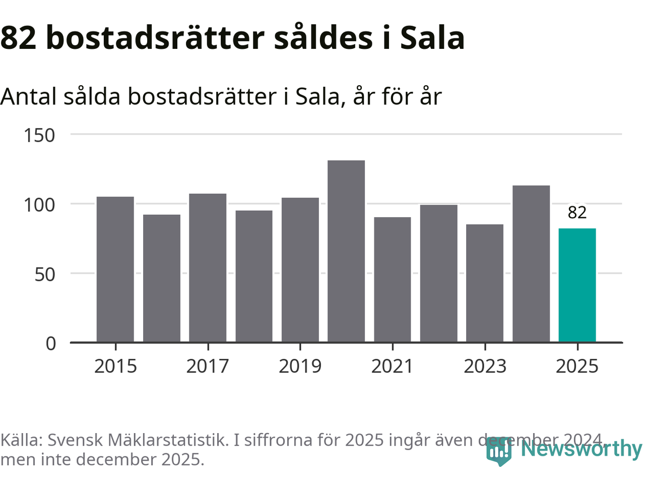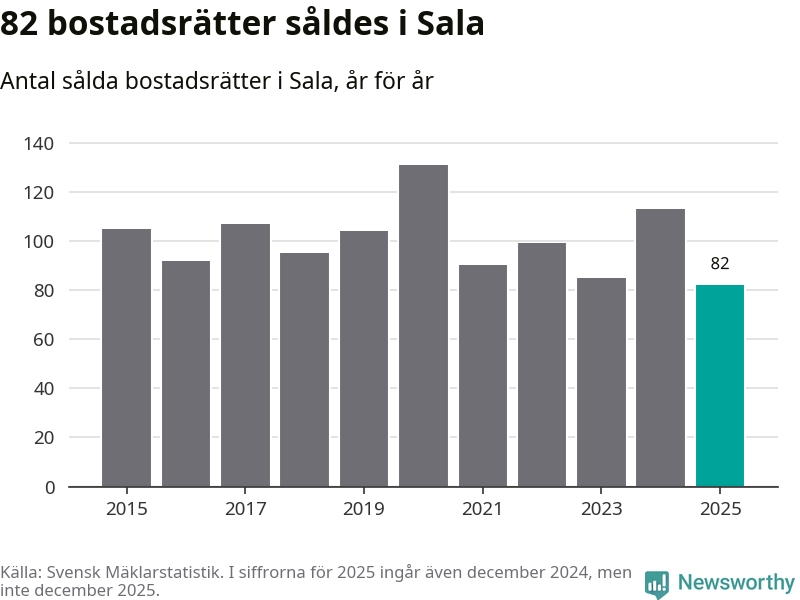 Det såldes totalt 82 bostadsrätter i Sala kommun under året. Det är färre än något annat år sedan 2015. Genomsnittspriset per kvadratmeter landade på 18 718 kronor, vilket är ungefär samma nivå som förra året.