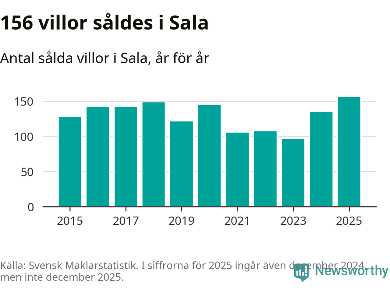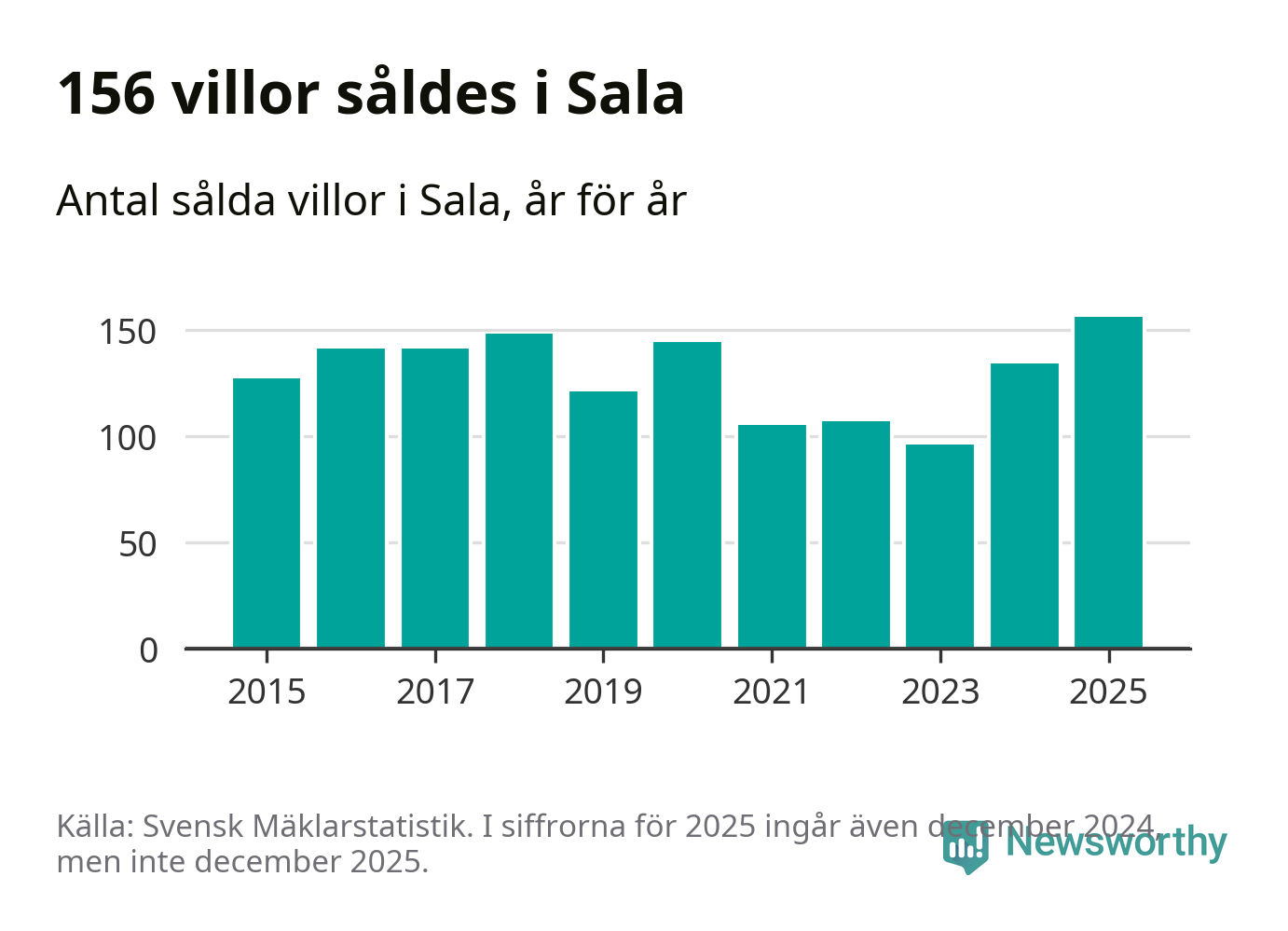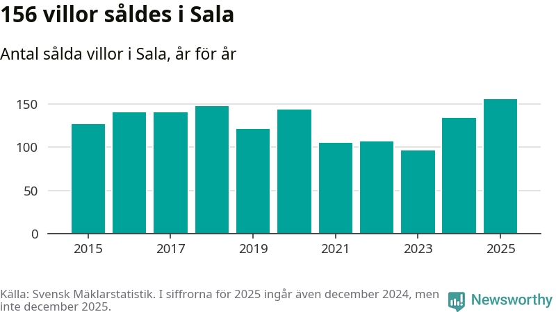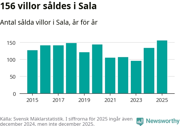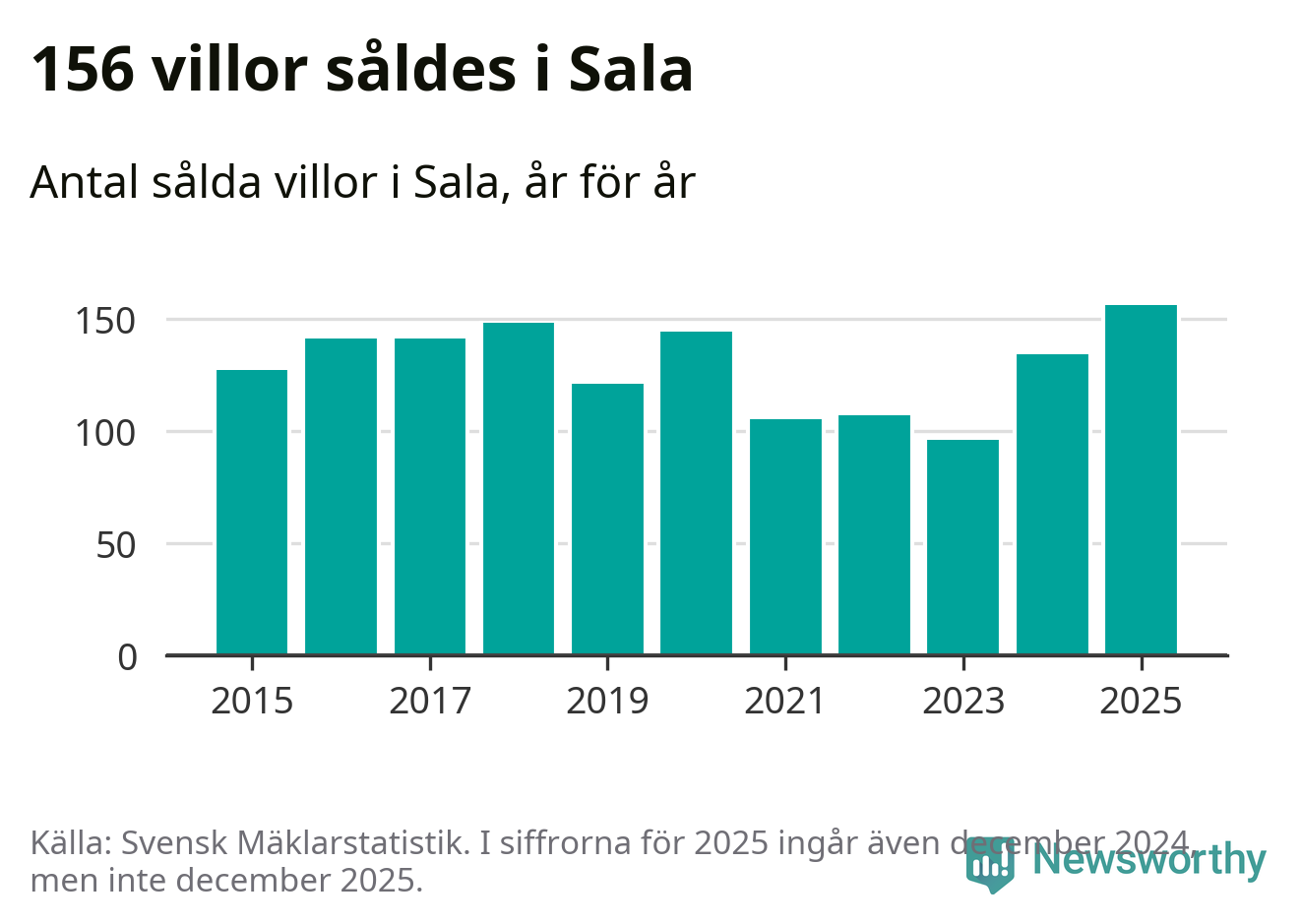 Däremot ökade antalet sålda villor. Totalt såldes 156 villor, att jämföra med 134 under 2024. Det är fler än något annat år sedan 2015.