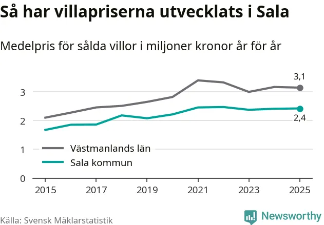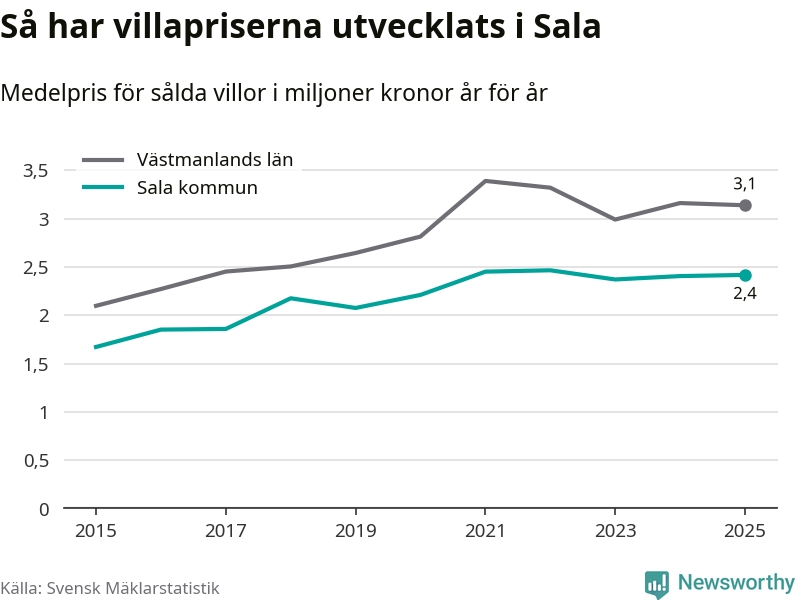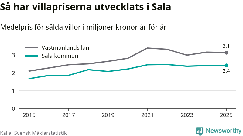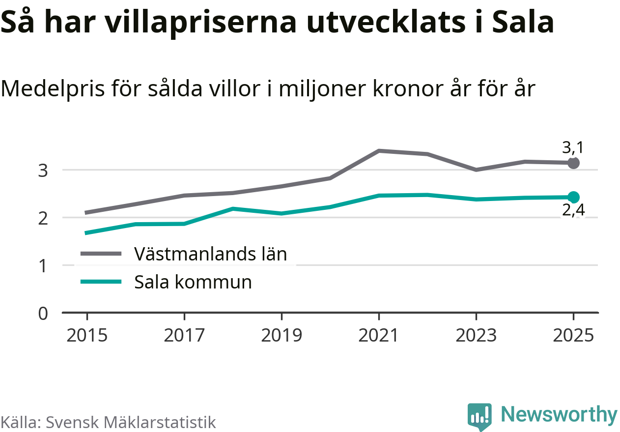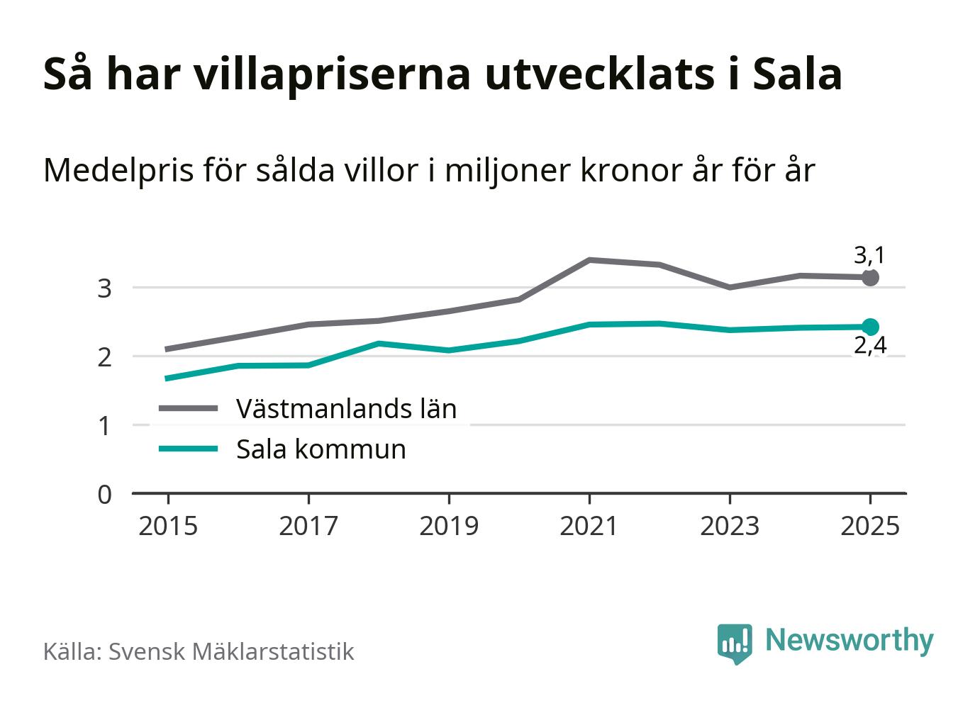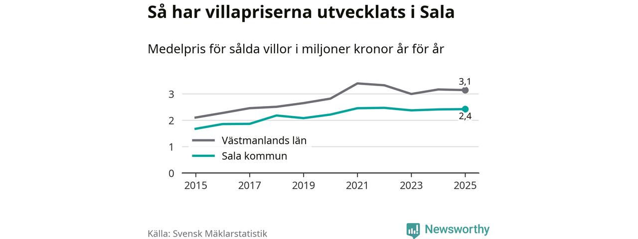 2,4 miljoner kronor är medelpriset för de villor som såldes i Sala kommun under året, eller 19 448 kronor per kvadratmeter. Det innebär att priserna har legat i stort sett stilla sedan förra året.