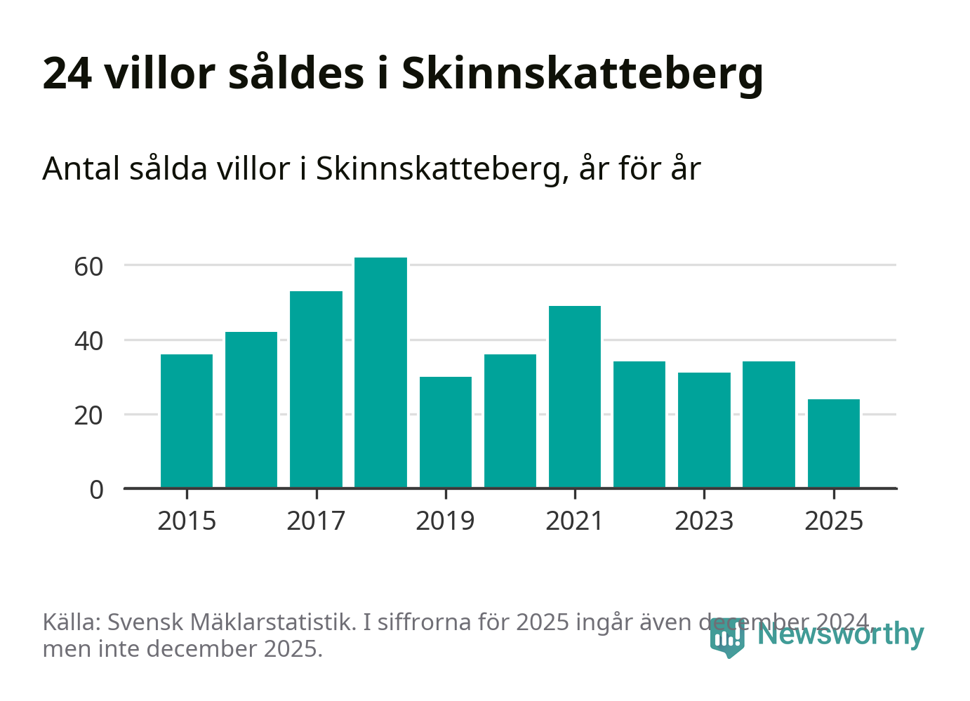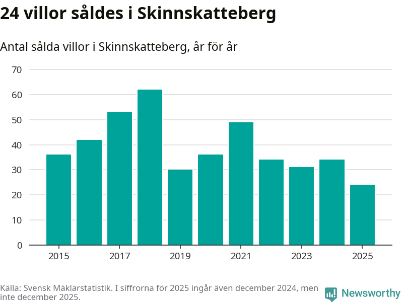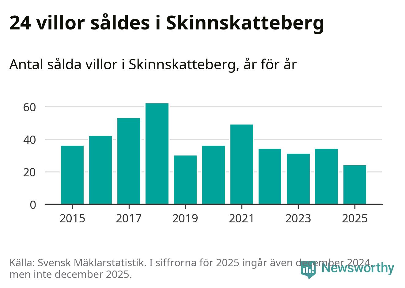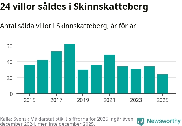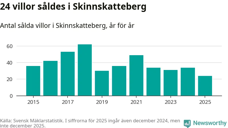 Antalet sålda villor minskade också. Totalt såldes 24 villor, att jämföra med 34 under 2024. Det är färre än något annat år sedan 2015.