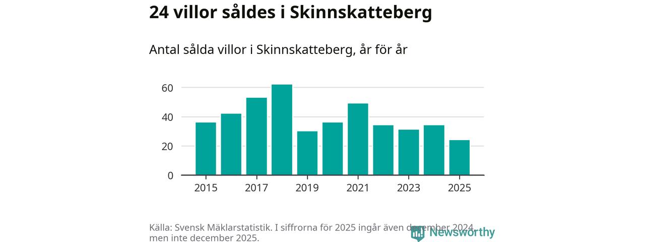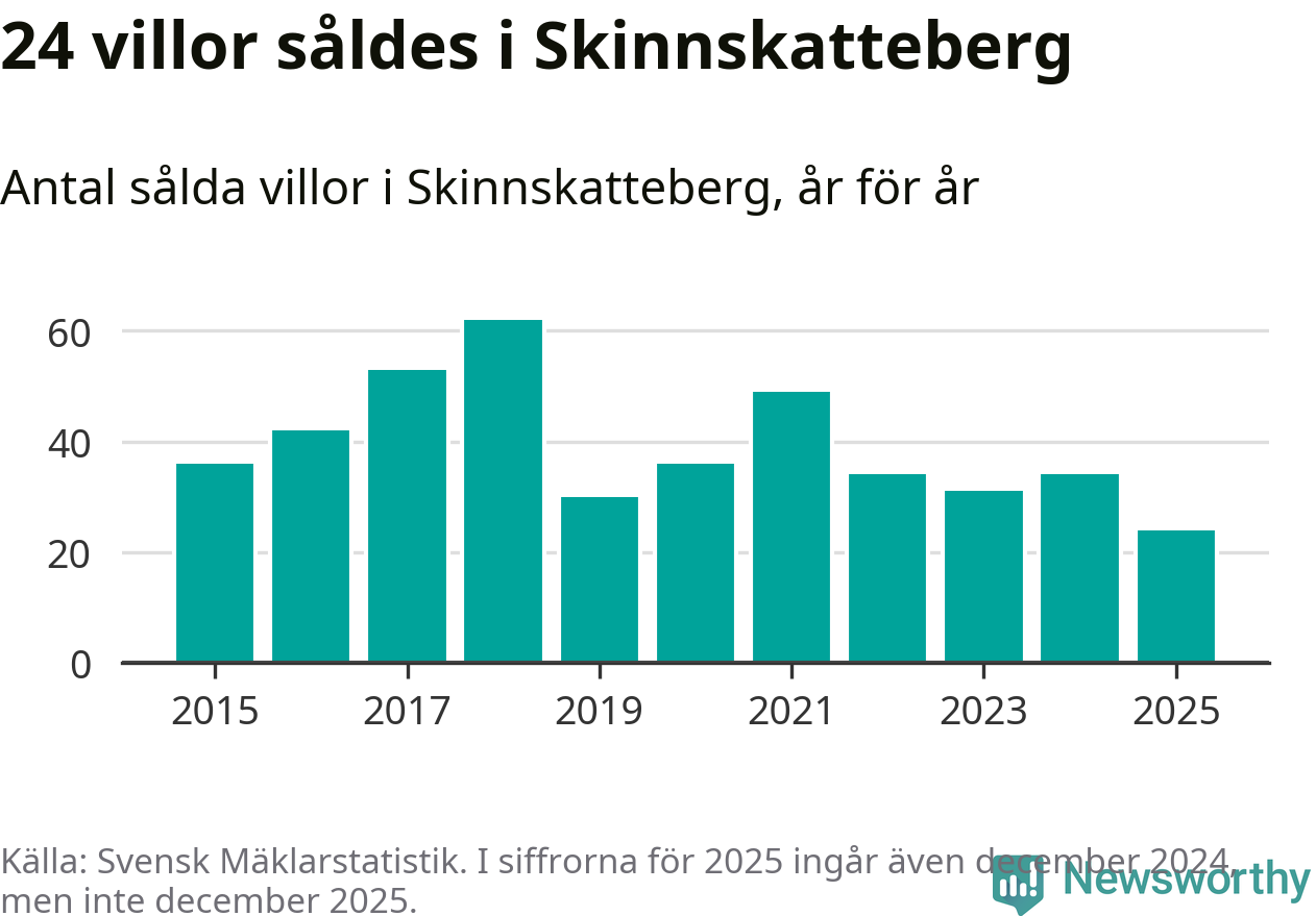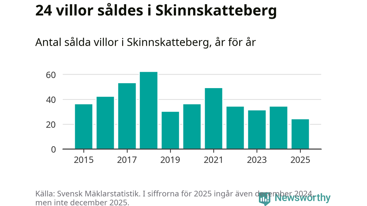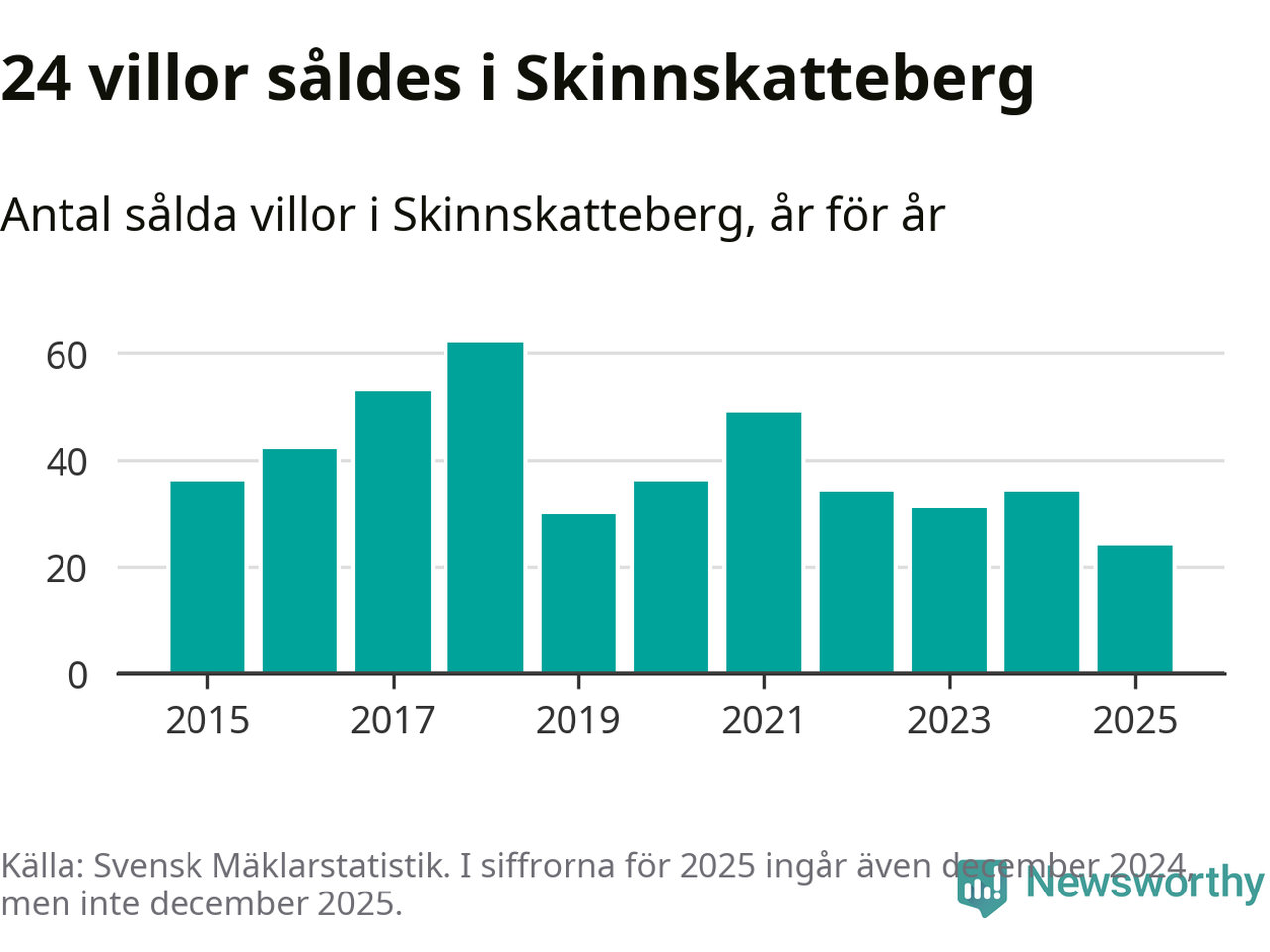 Antalet sålda villor minskade också. Totalt såldes 24 villor, att jämföra med 34 under 2024. Det är färre än något annat år sedan 2015.