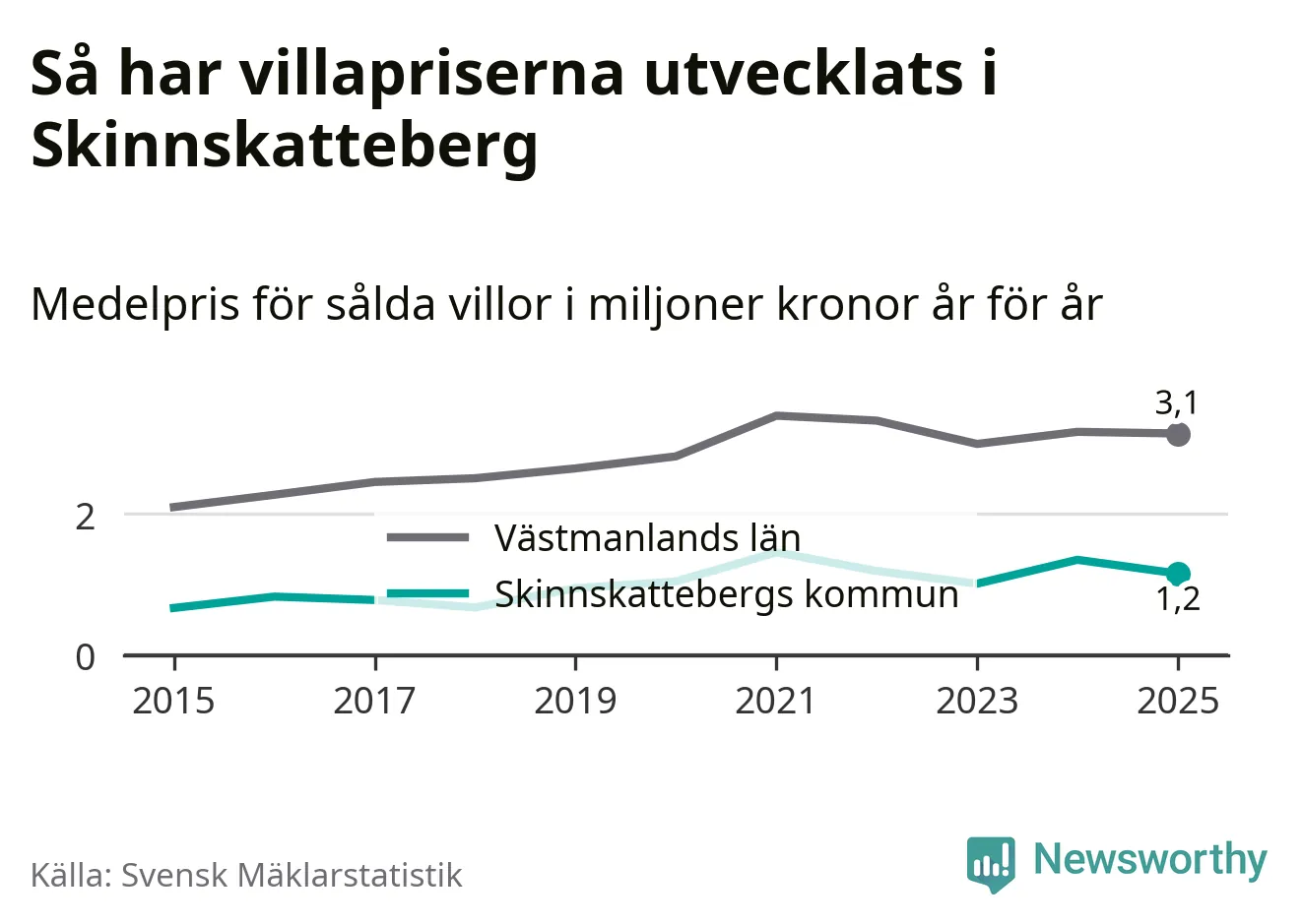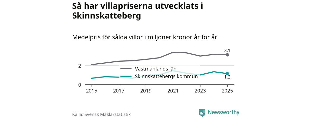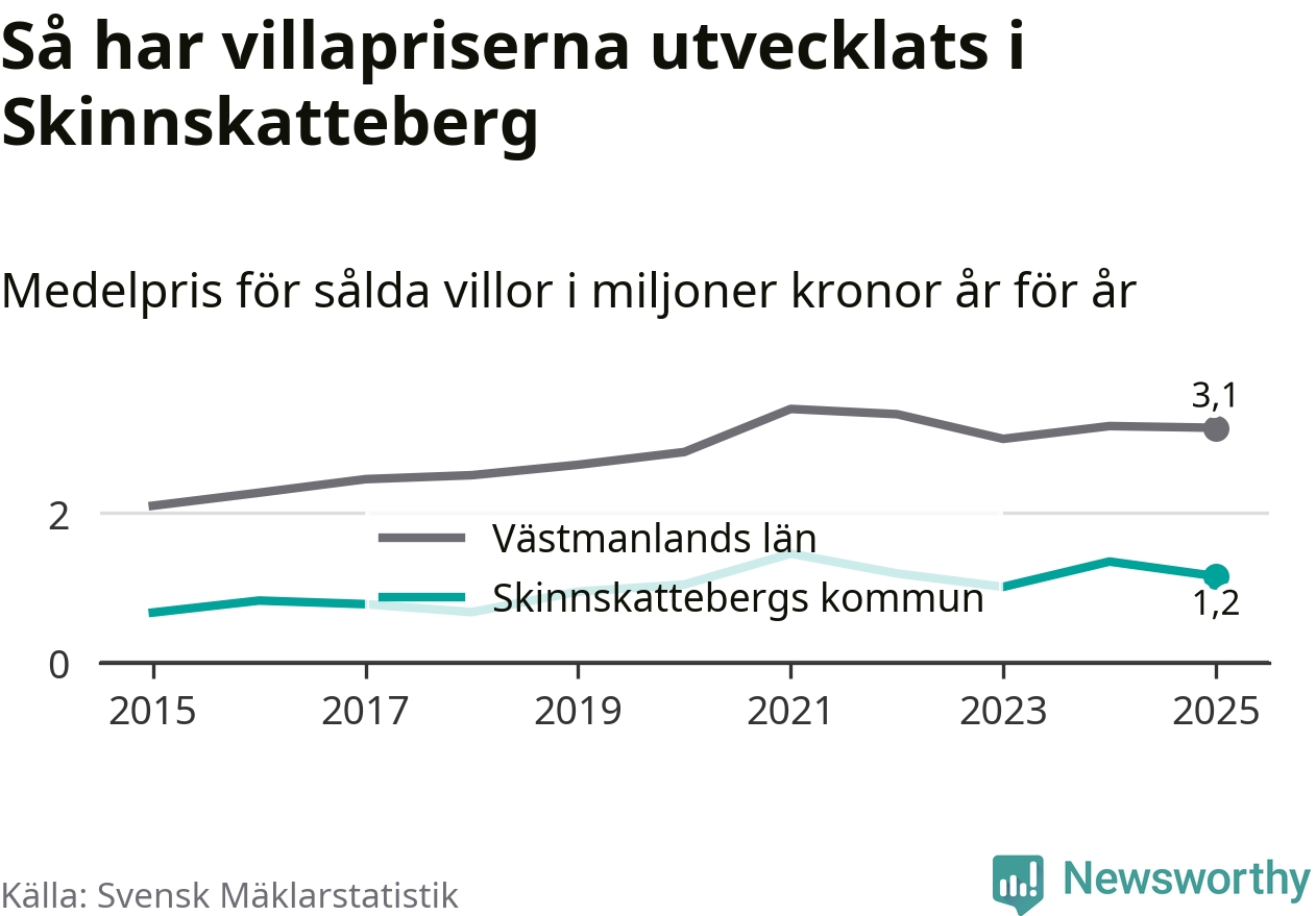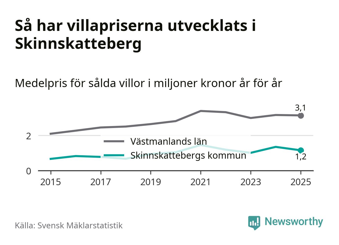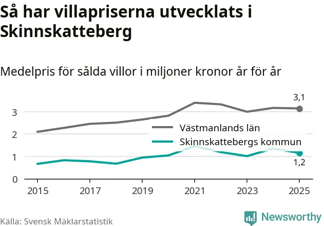 1,2 miljoner kronor är medelpriset för de villor som såldes i Skinnskattebergs kommun under året, eller 10 677 kronor per kvadratmeter. Det innebär en prisminskning med 14 procent på ett år.