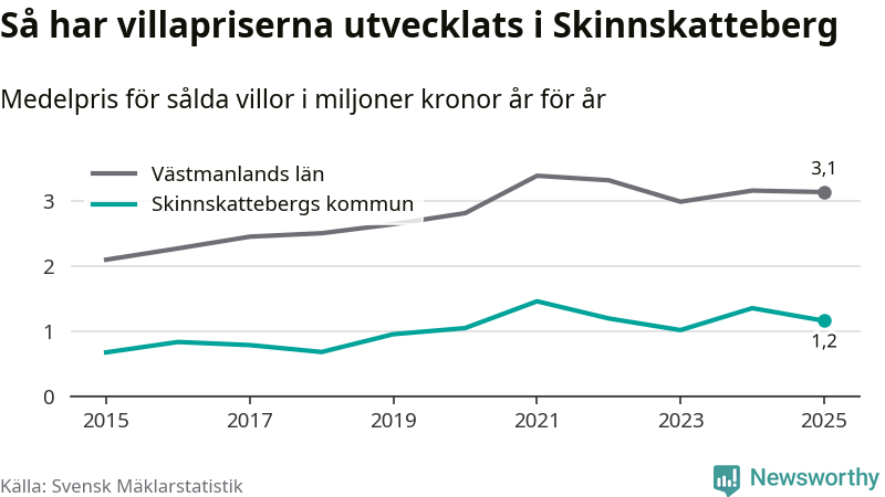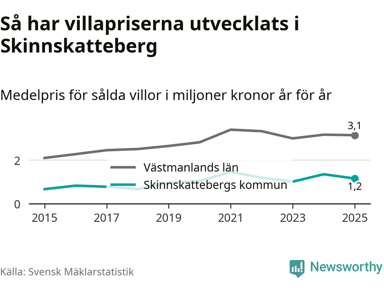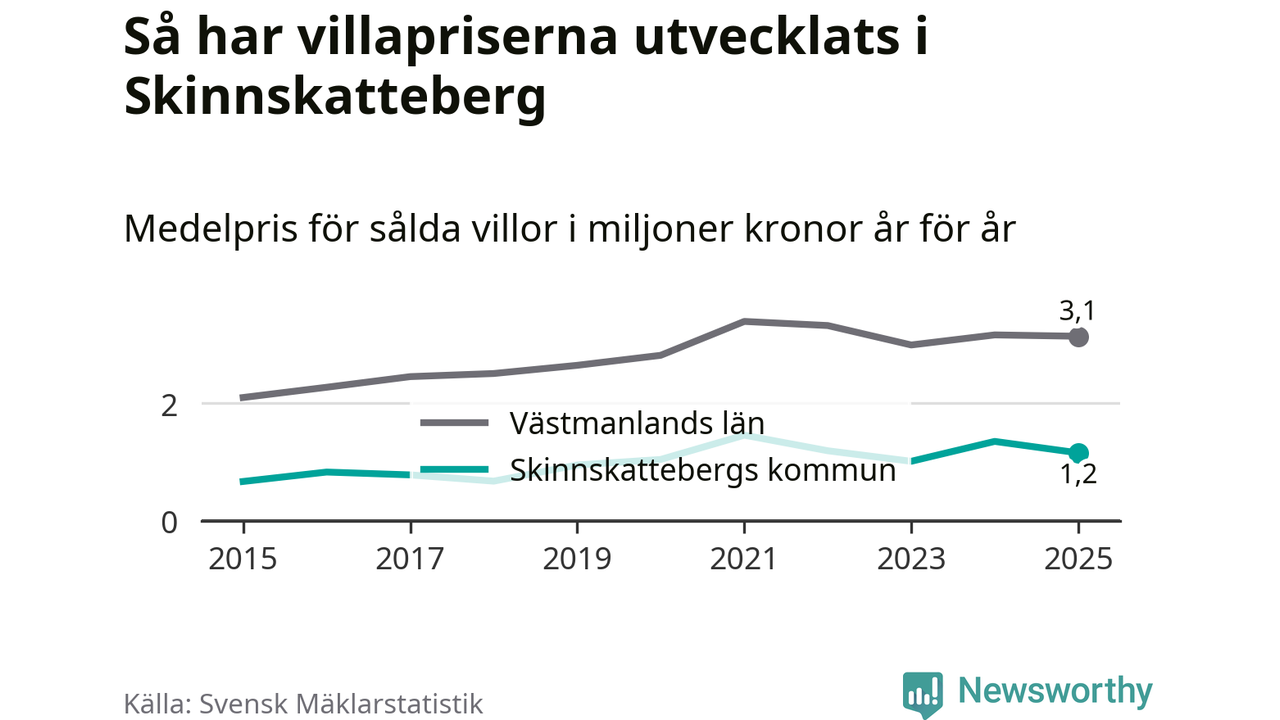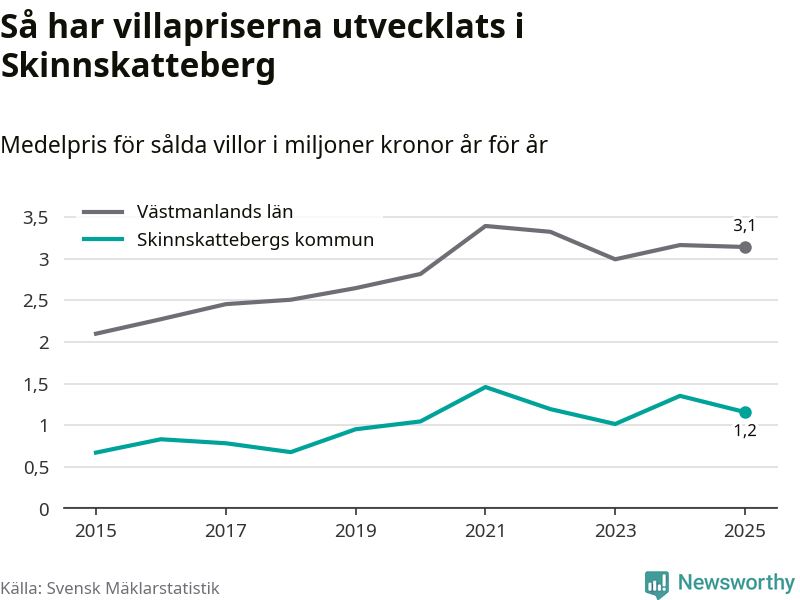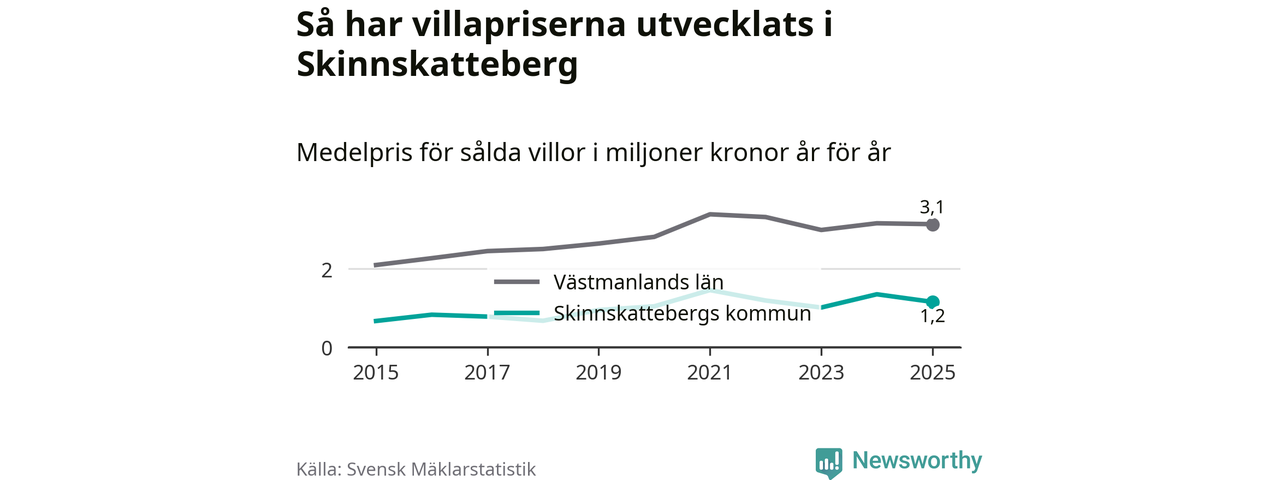 1,2 miljoner kronor är medelpriset för de villor som såldes i Skinnskattebergs kommun under året, eller 10 677 kronor per kvadratmeter. Det innebär en prisminskning med 14 procent på ett år.