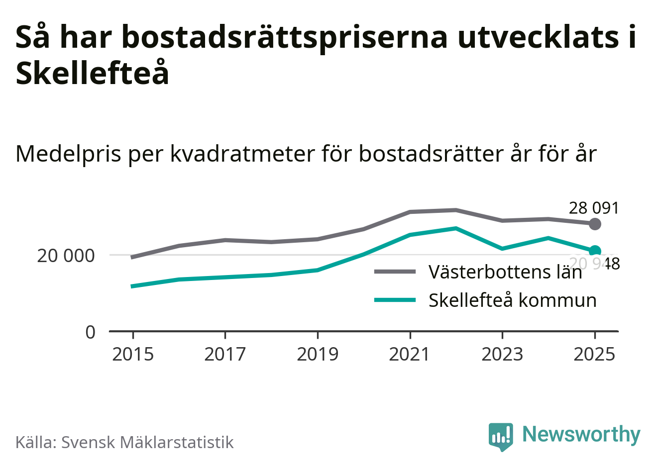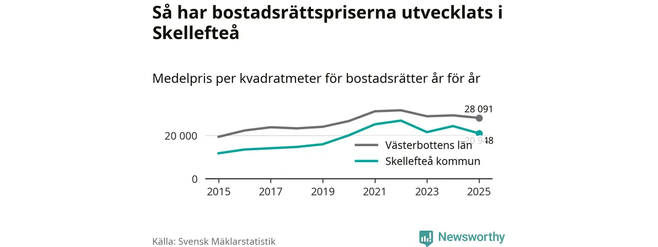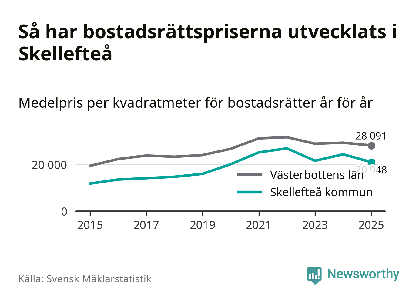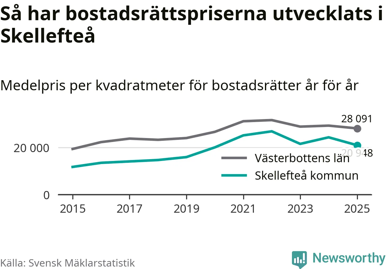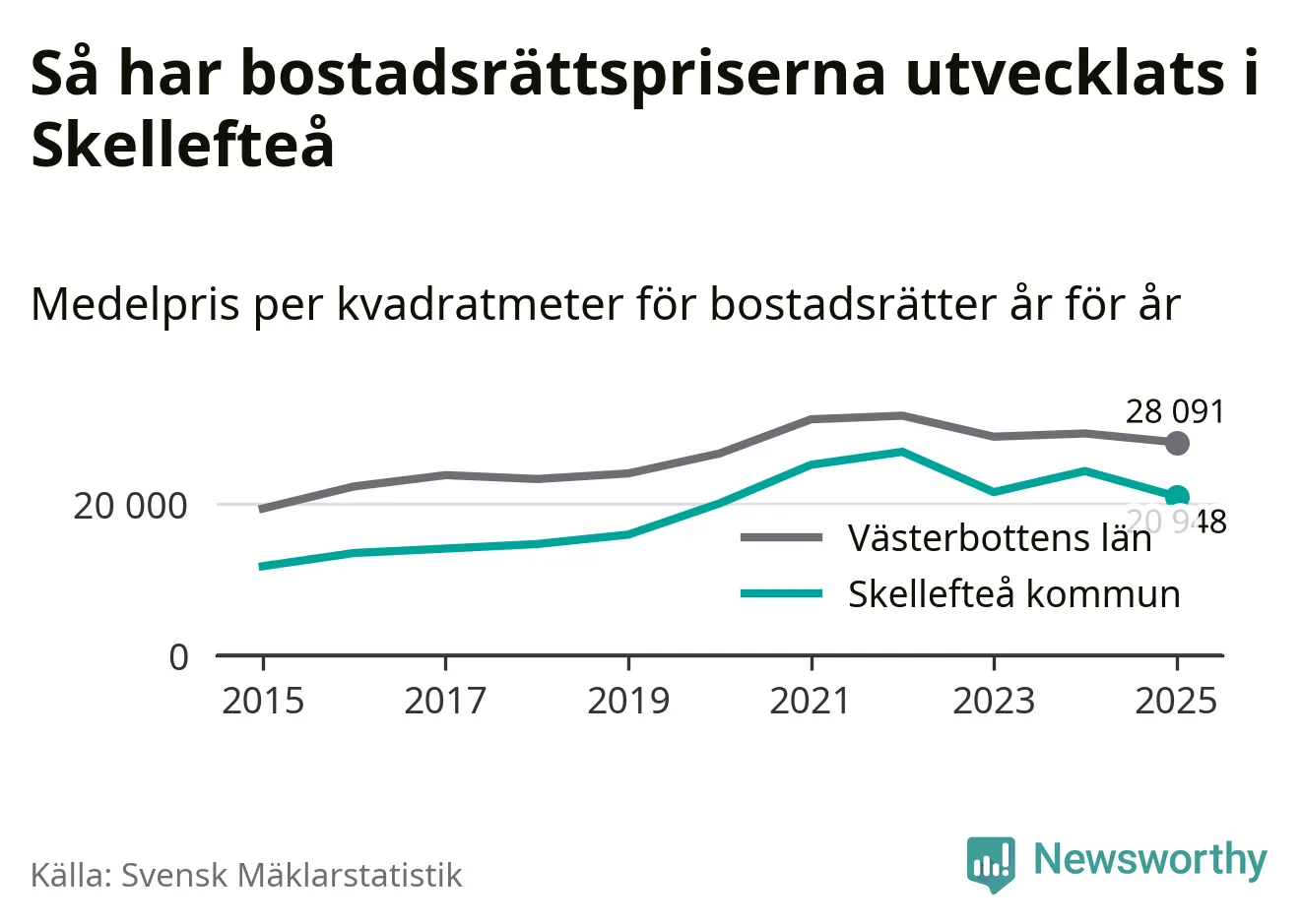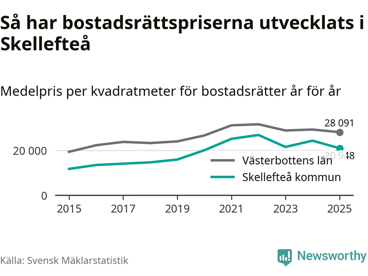 Det såldes totalt 554 bostadsrätter i Skellefteå kommun under året. Genomsnittspriset per kvadratmeter landade på 20 948 kronor. Det är en minskning med 14 procent i kommunen på ett år.