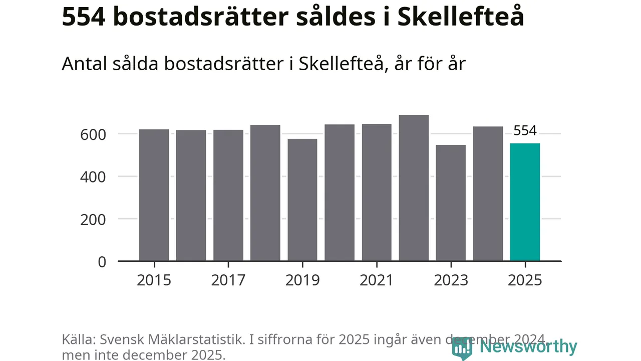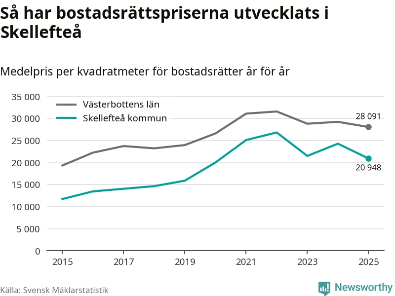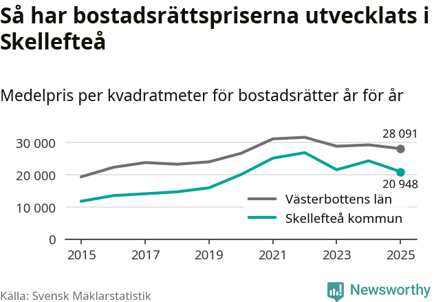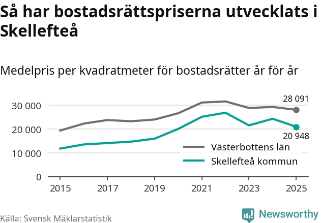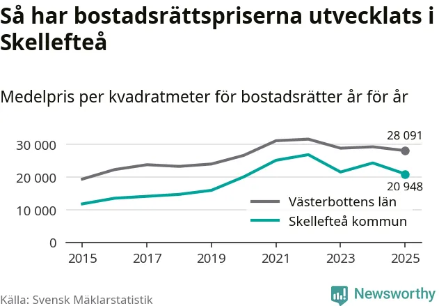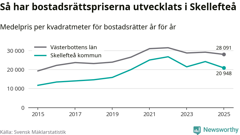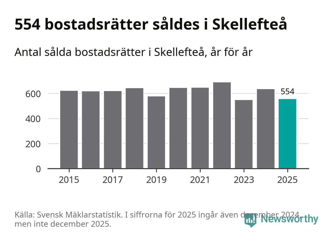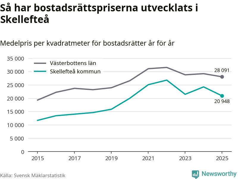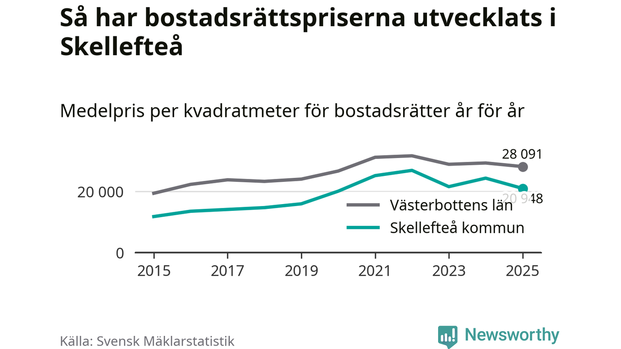 Det såldes totalt 554 bostadsrätter i Skellefteå kommun under året. Genomsnittspriset per kvadratmeter landade på 20 948 kronor. Det är en minskning med 14 procent i kommunen på ett år.